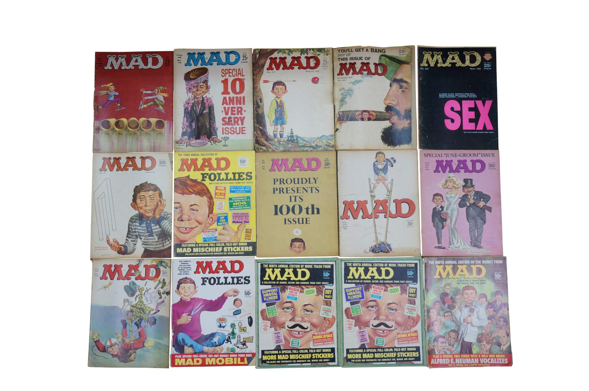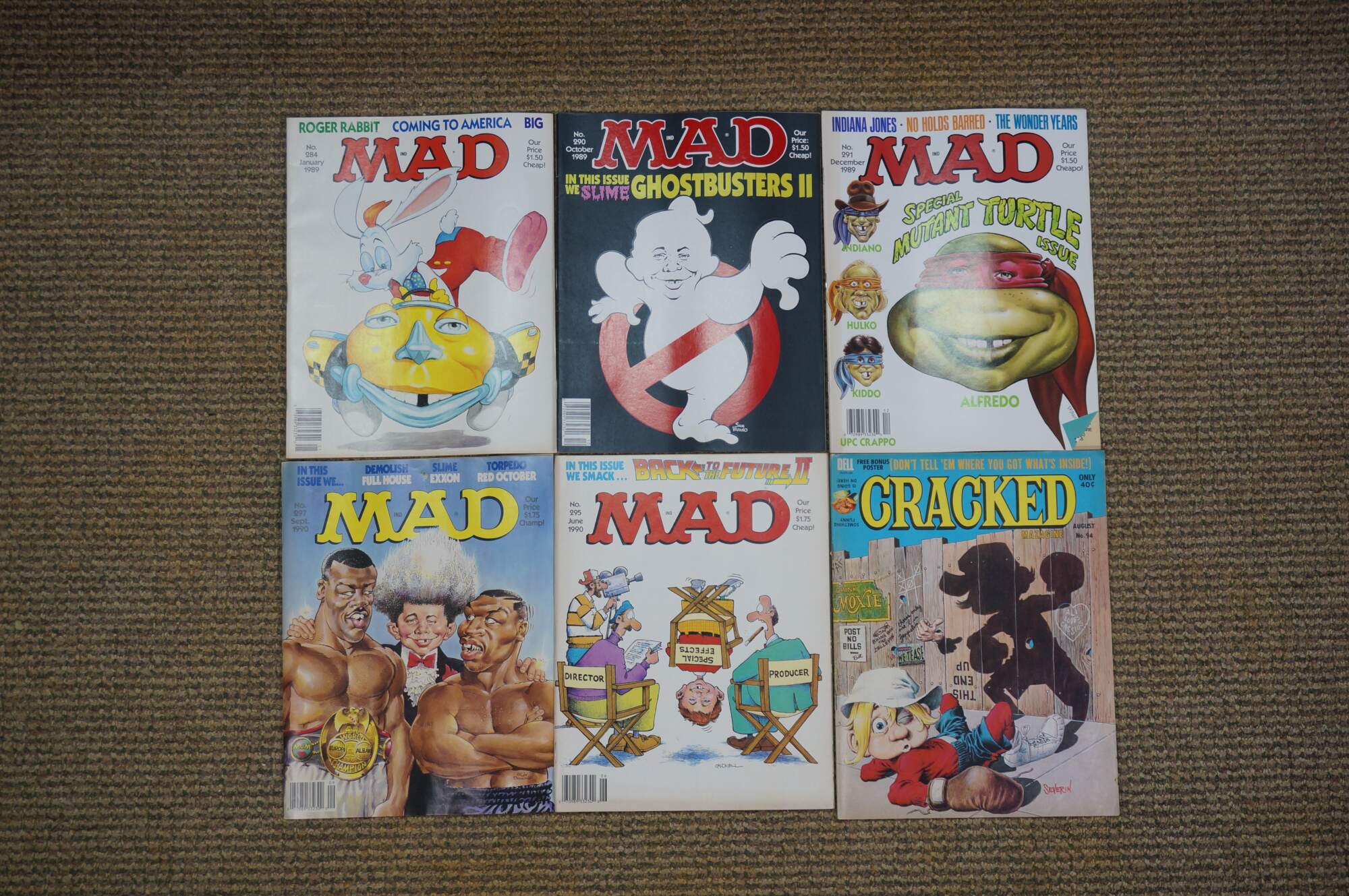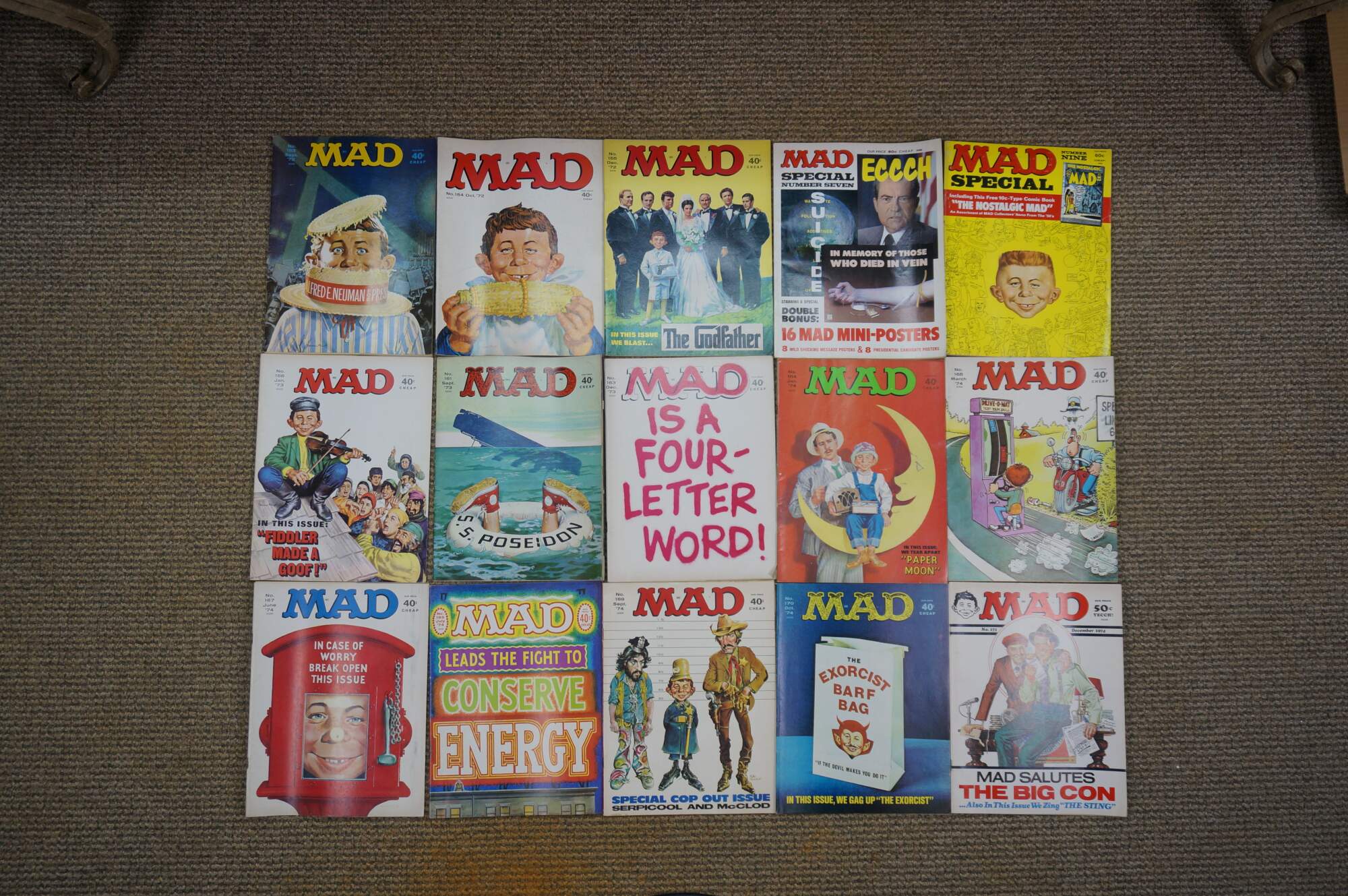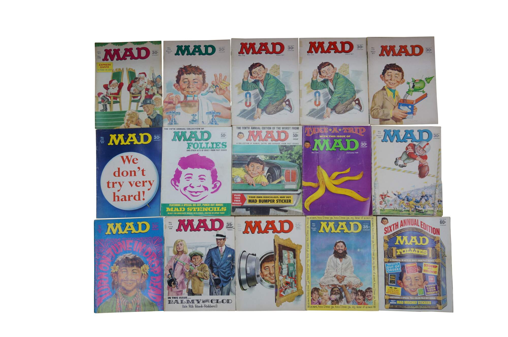 Lot of 155 assorted issues of MAD Magazine spanning from the 1960s-1990, plus one August 1971 issue of Cracked Magazine. Varous levels of wear from very good to some with covers coming off.
