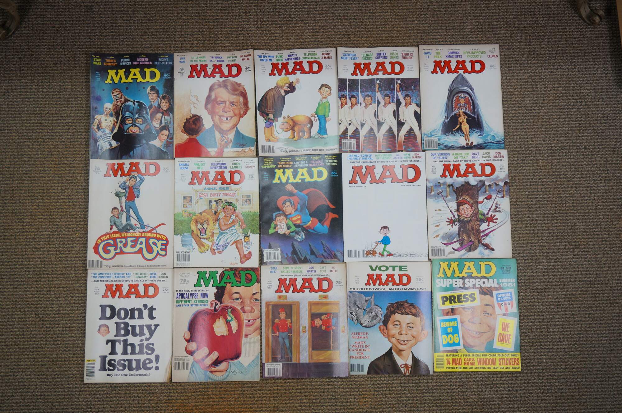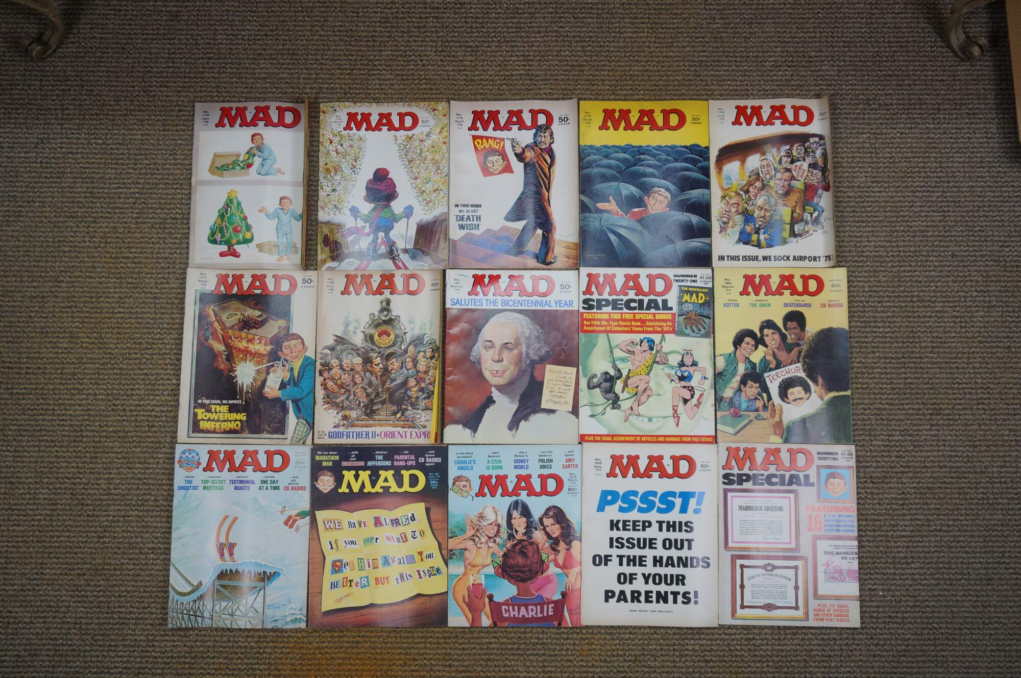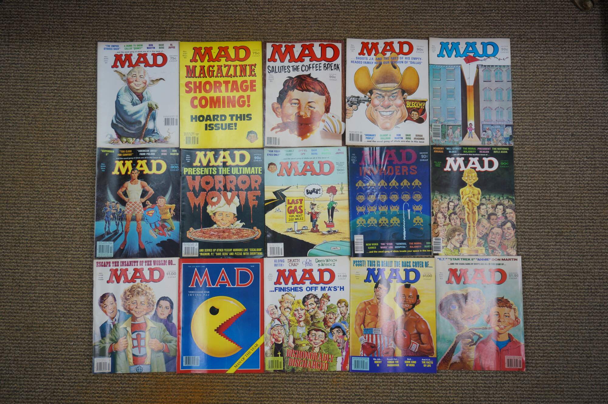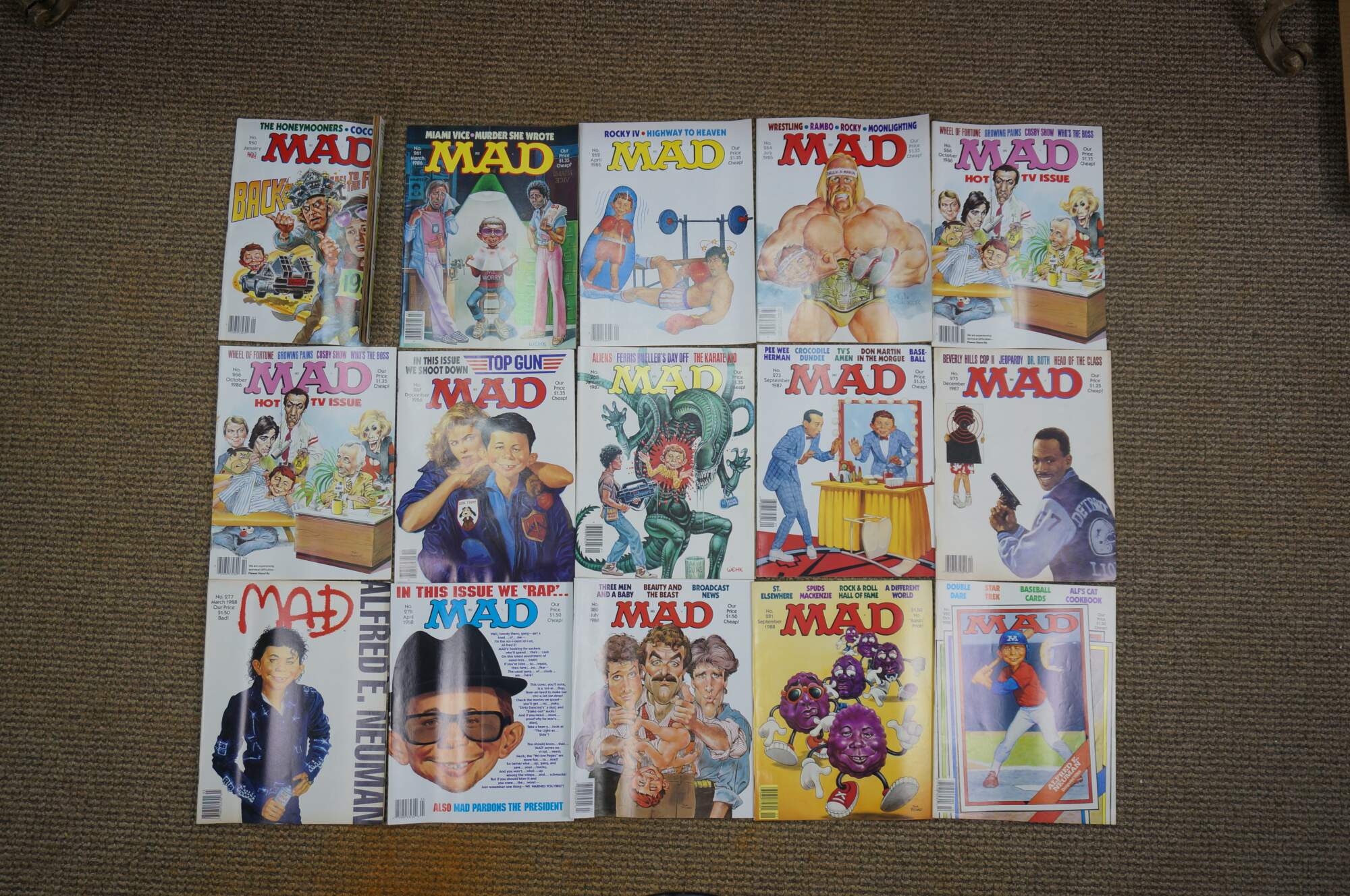 Lot of 155 assorted issues of MAD Magazine spanning from the 1960s-1990, plus one August 1971 issue of Cracked Magazine. Varous levels of wear from very good to some with covers coming off.