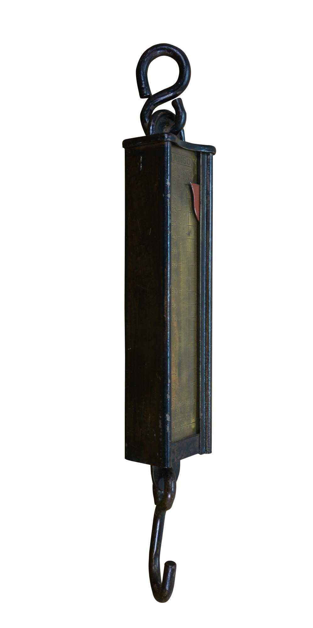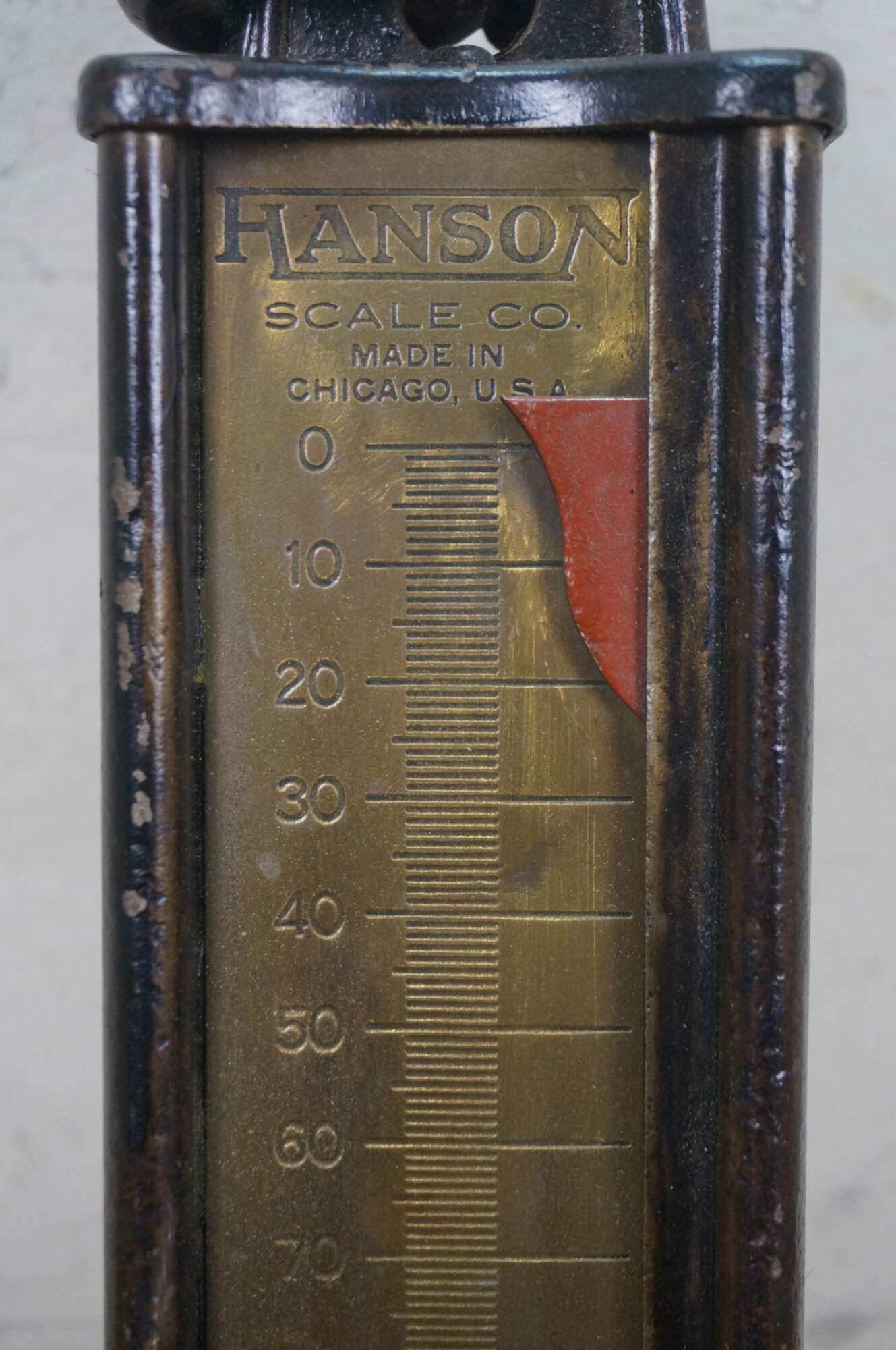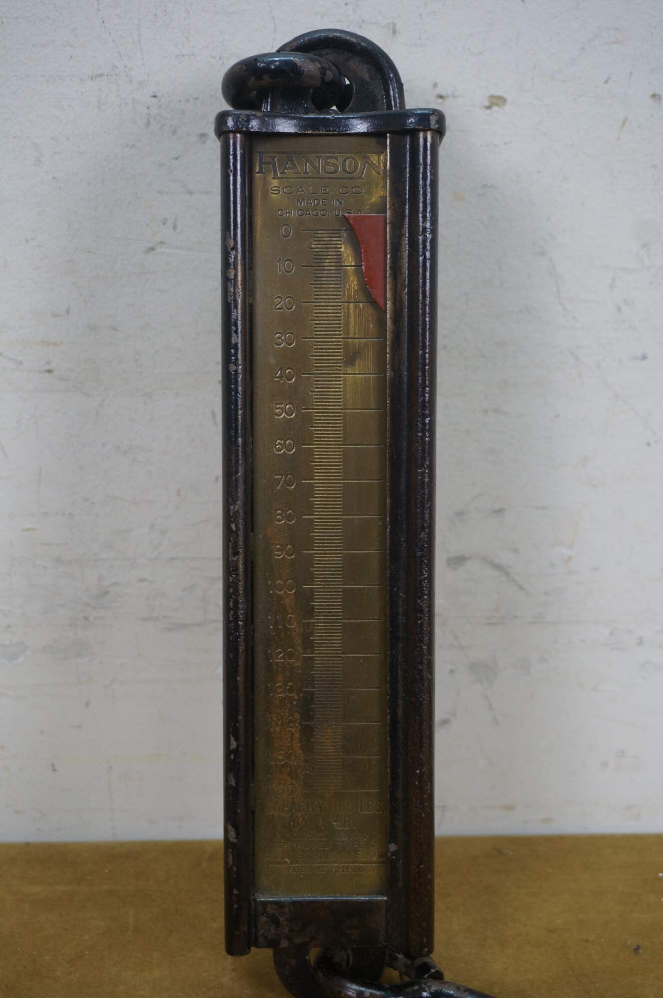 Early 20th century painted iron and brass Hanson Scale Company hanging scale. Made in Chicago, USA - Capacity 160 lbs by 1 lb - Model 8916 - Approved type C - Patent No 2,299,980.