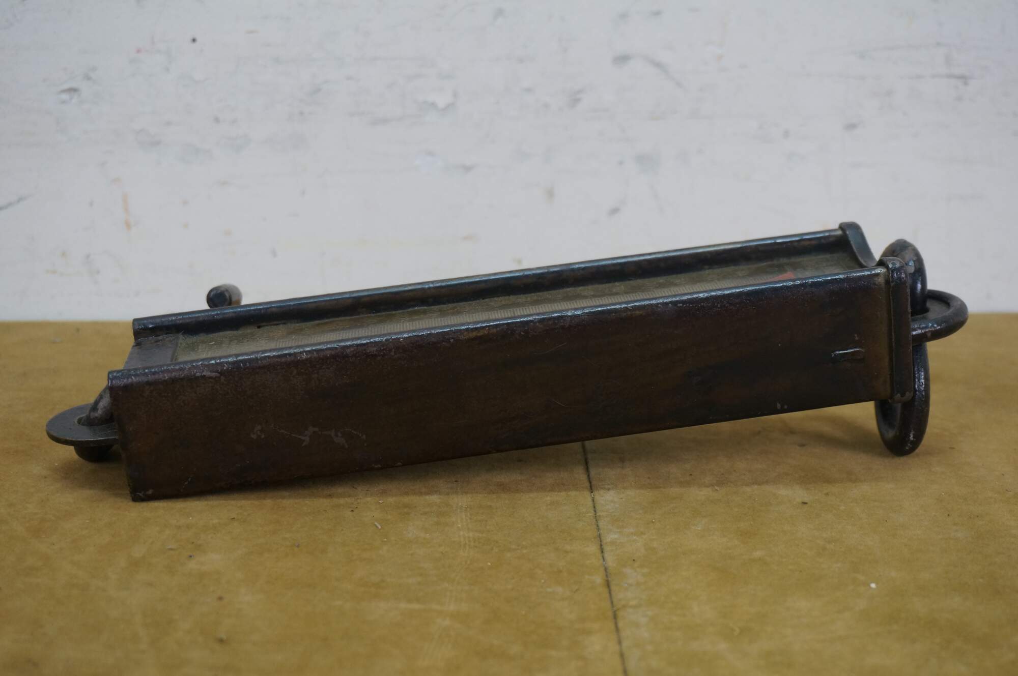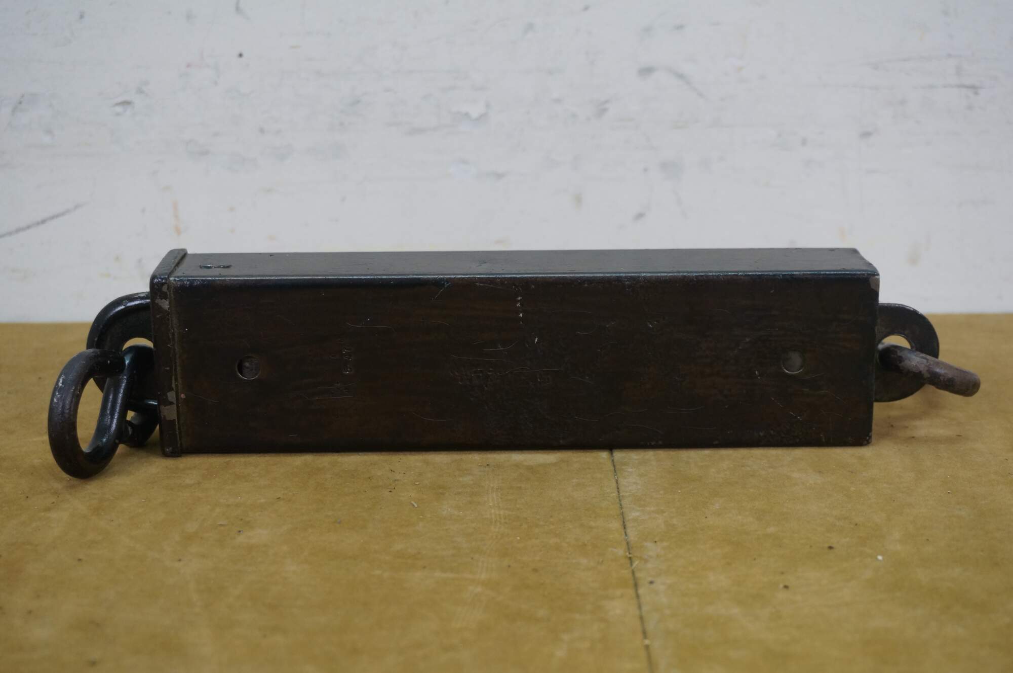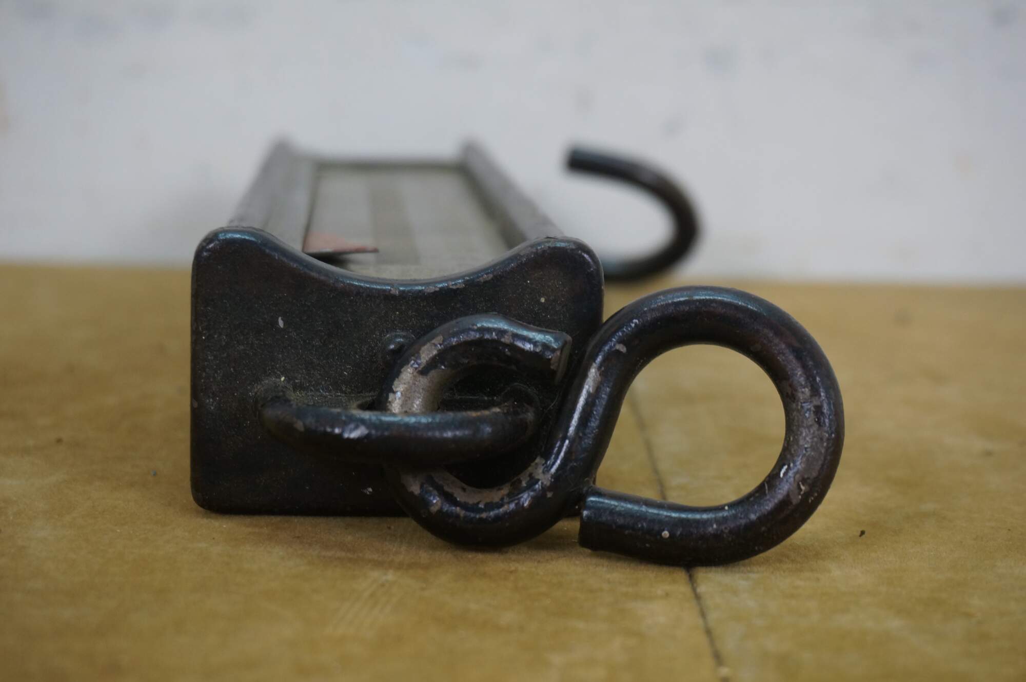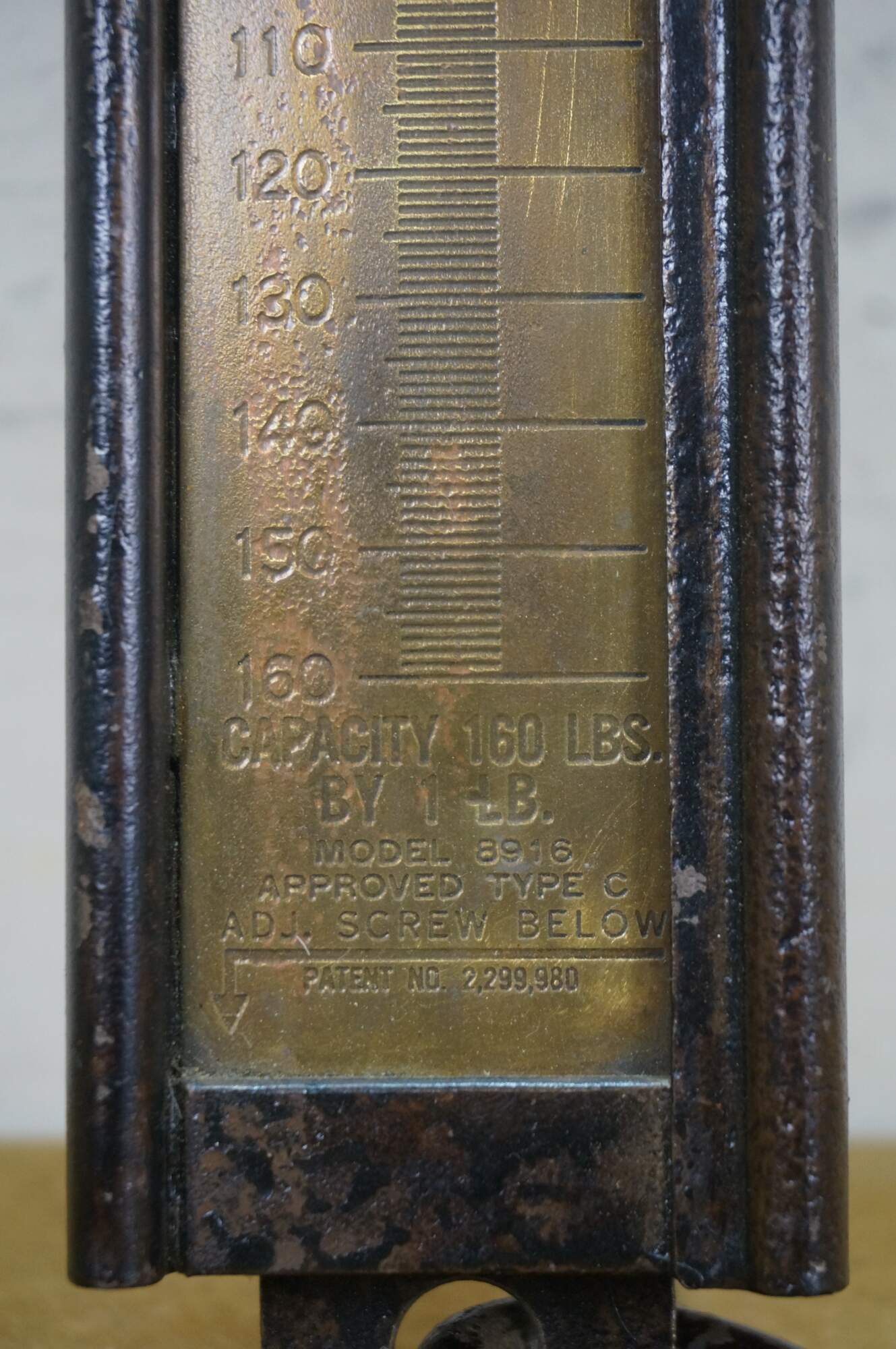Early 20th century painted iron and brass Hanson Scale Company hanging scale. Made in Chicago, USA - Capacity 160 lbs by 1 lb - Model 8916 - Approved type C - Patent No 2,299,980.
