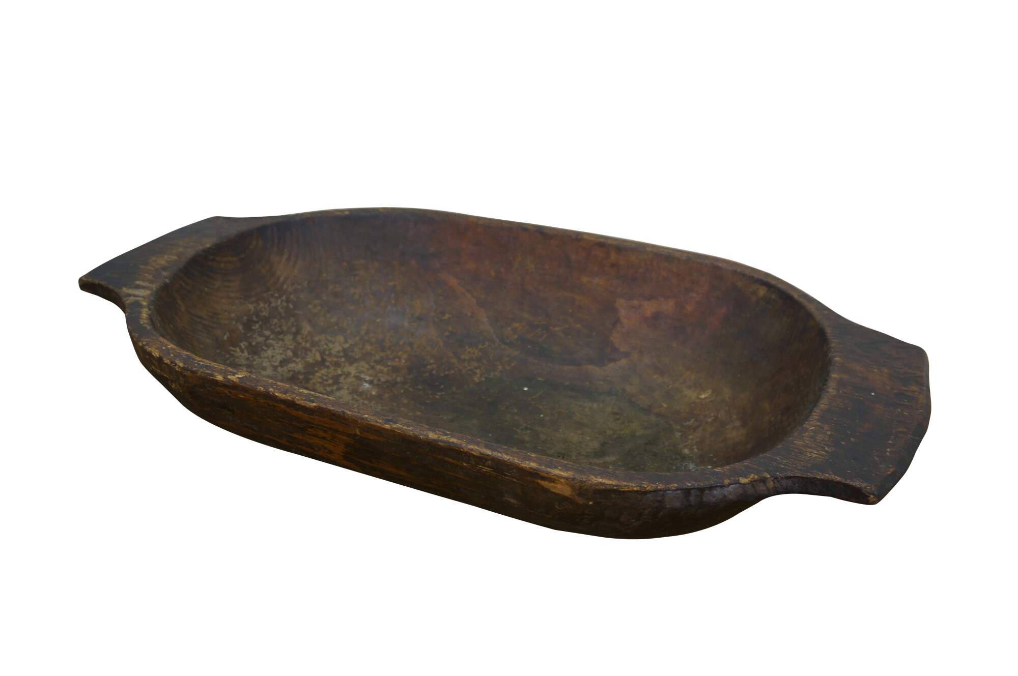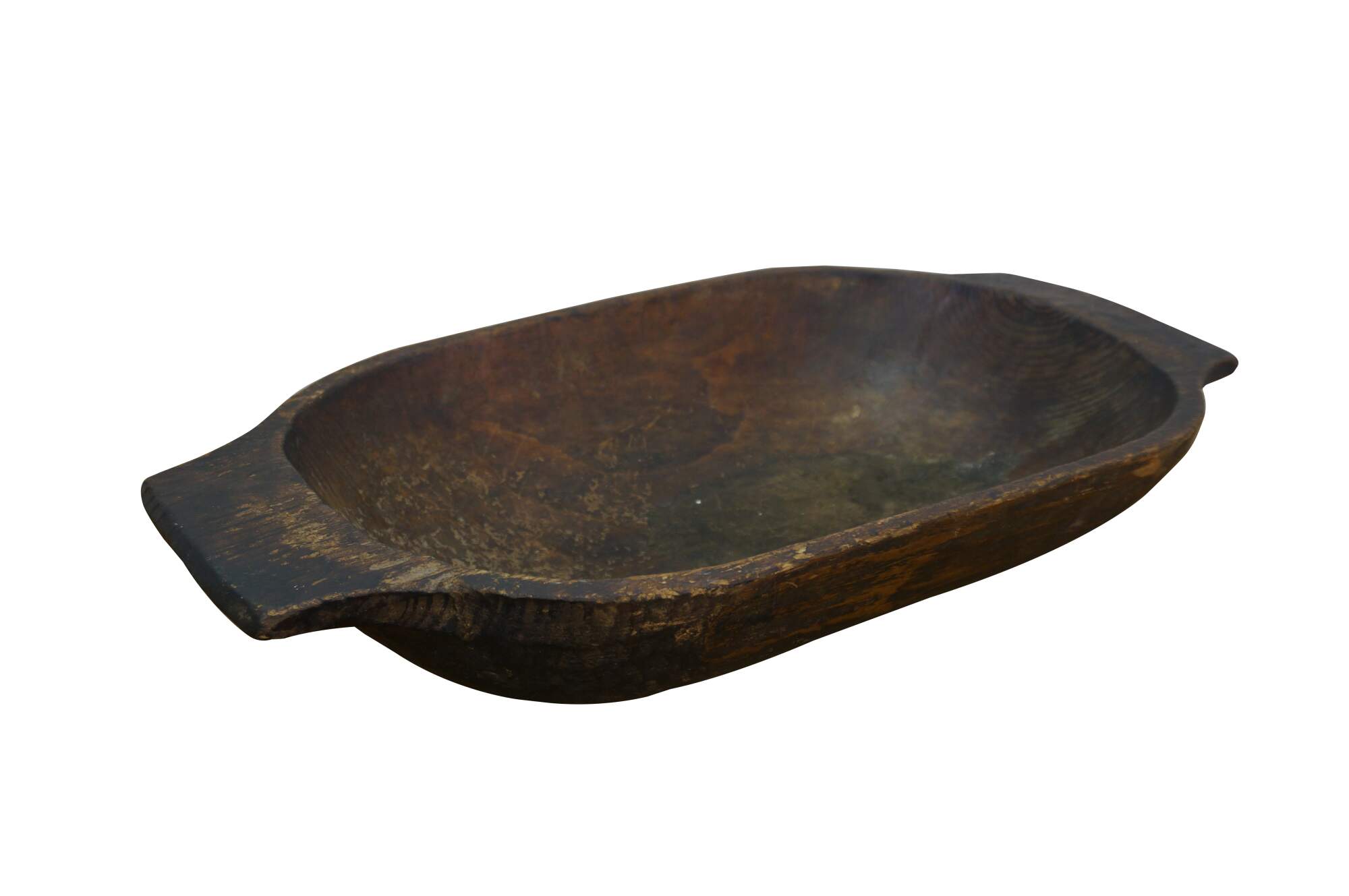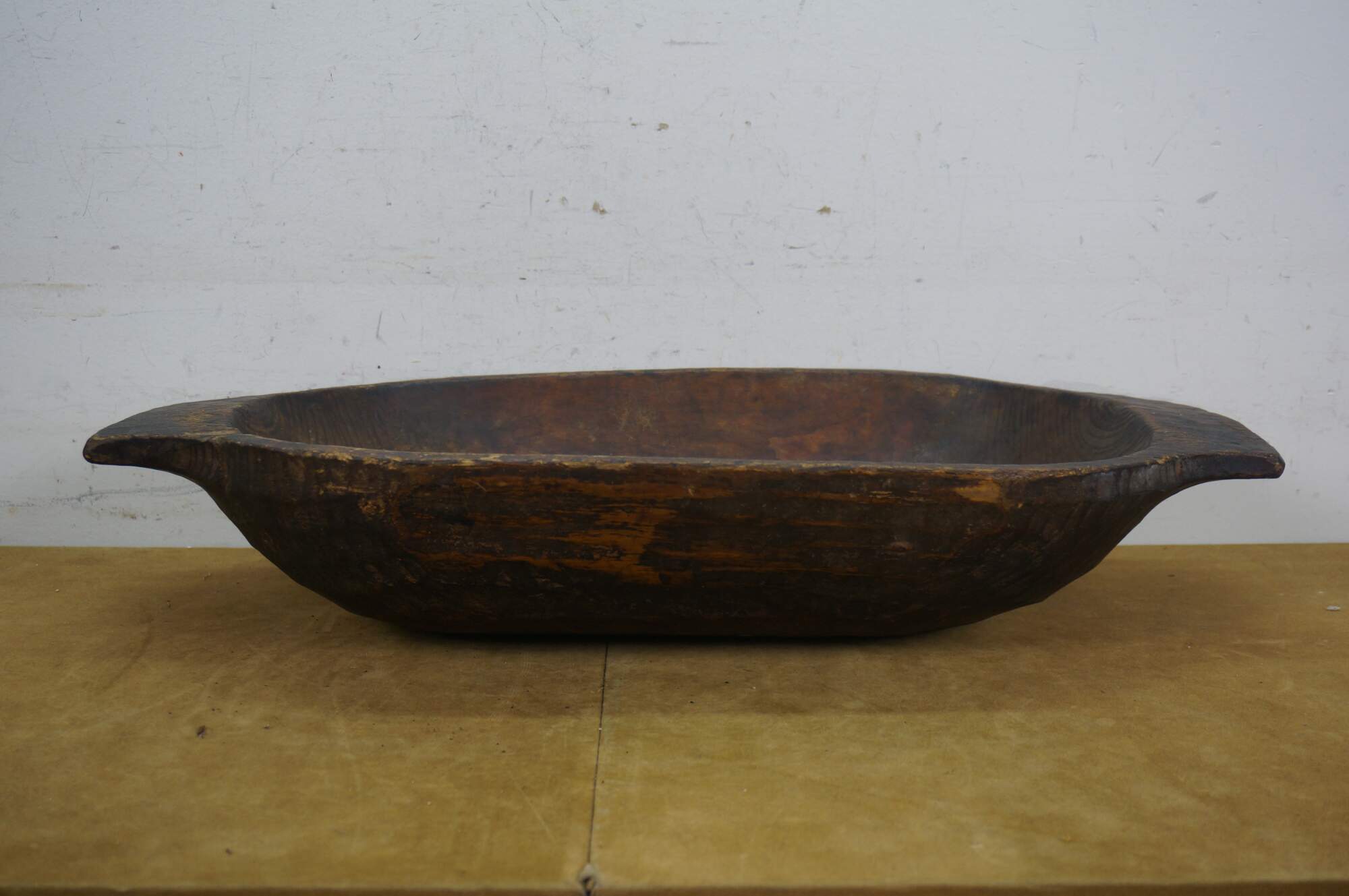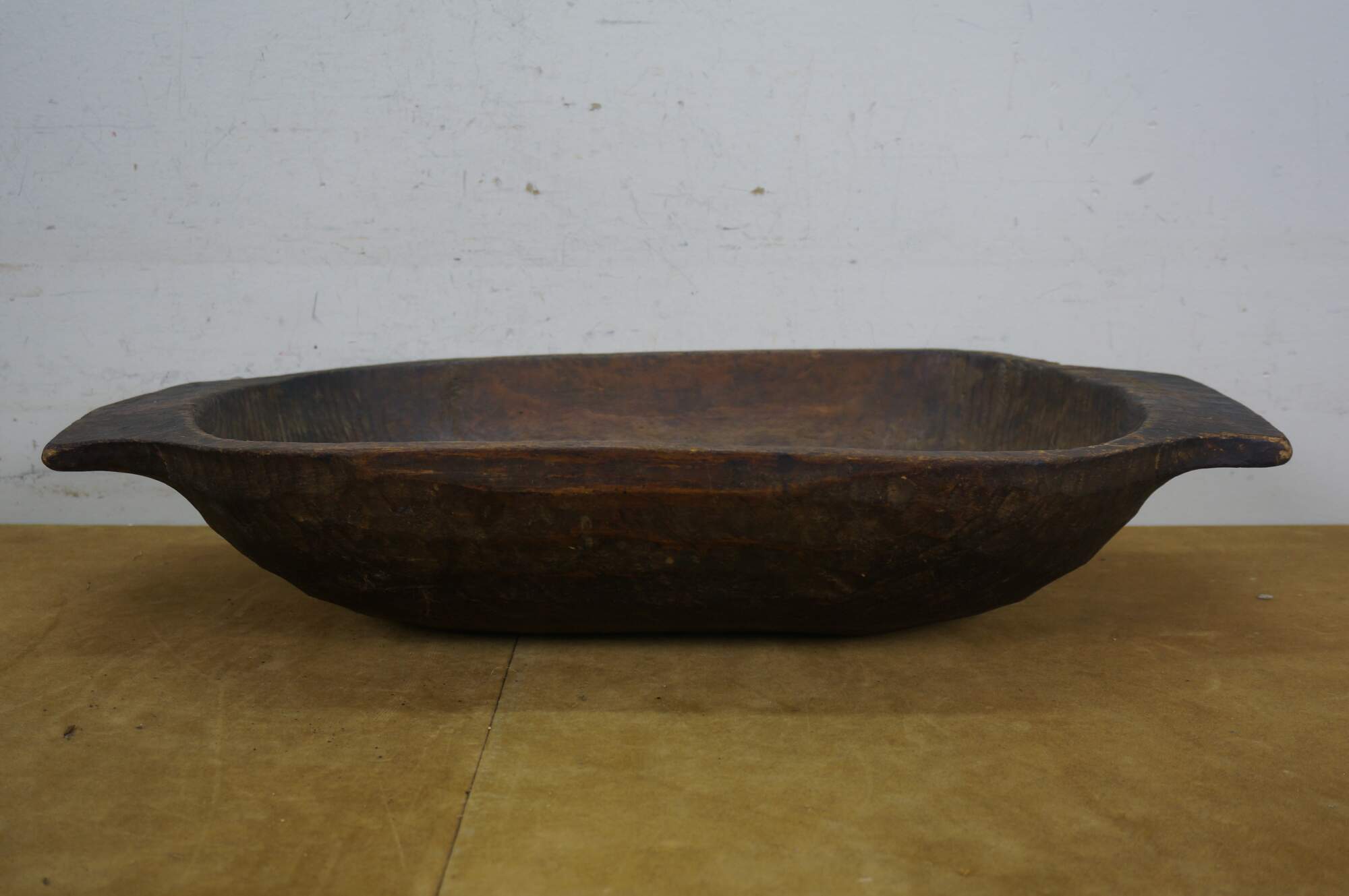 Antique hand-hewn wooden dough bowl - rounded rectangular form with two flat handles at the ends and dark patina from use.