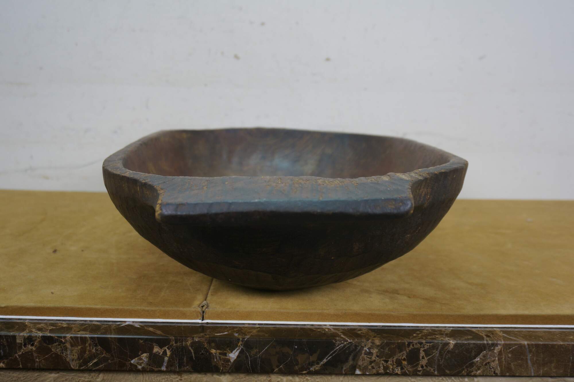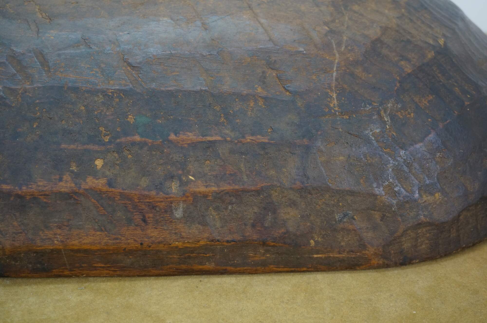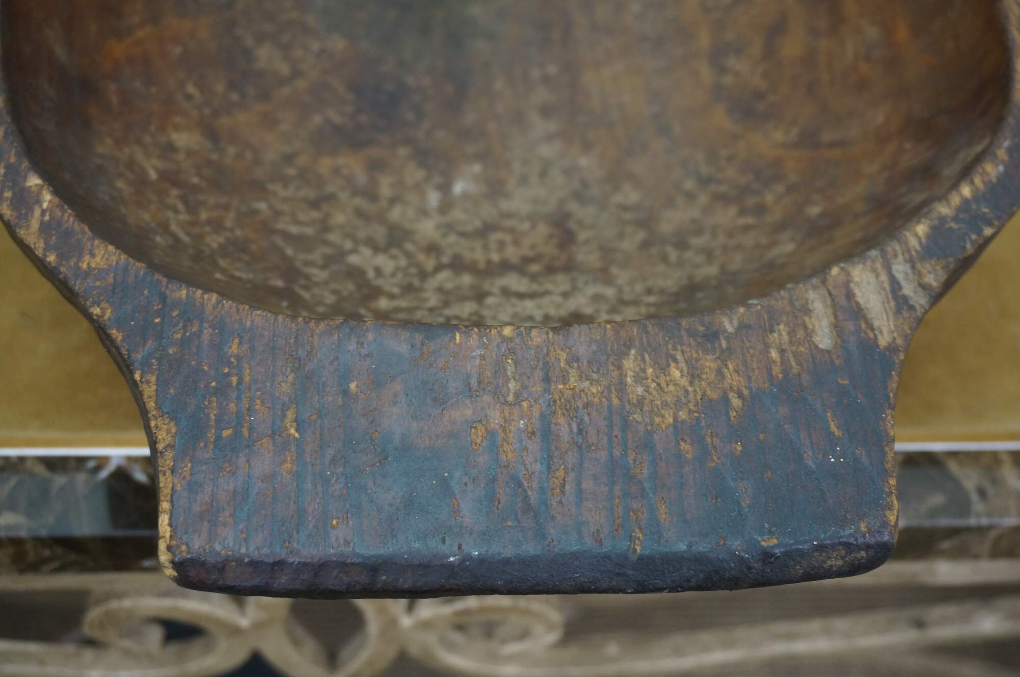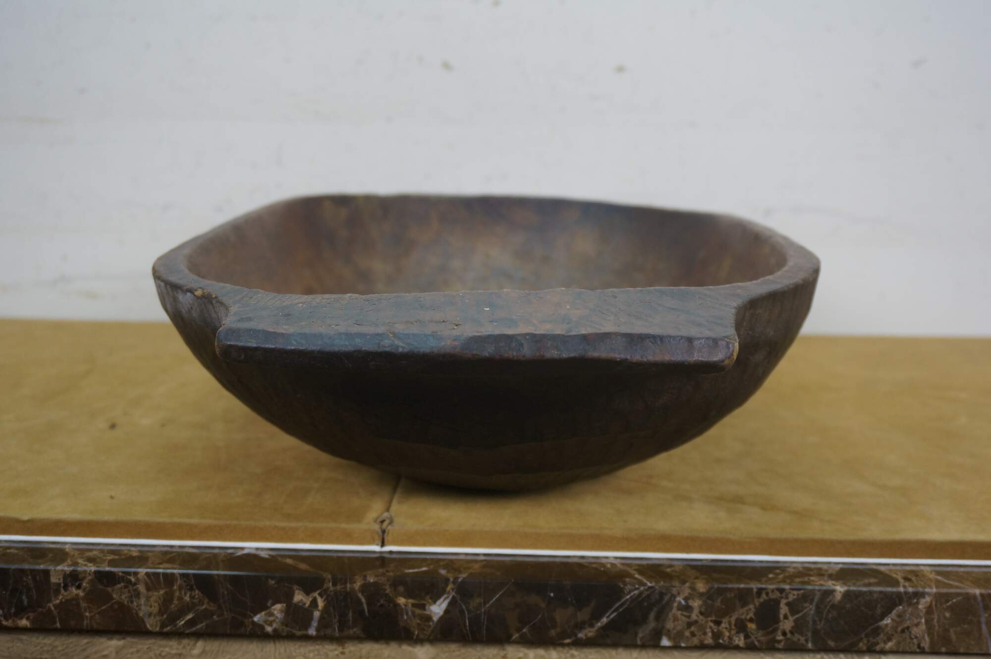Antique hand-hewn wooden dough bowl - rounded rectangular form with two flat handles at the ends and dark patina from use.