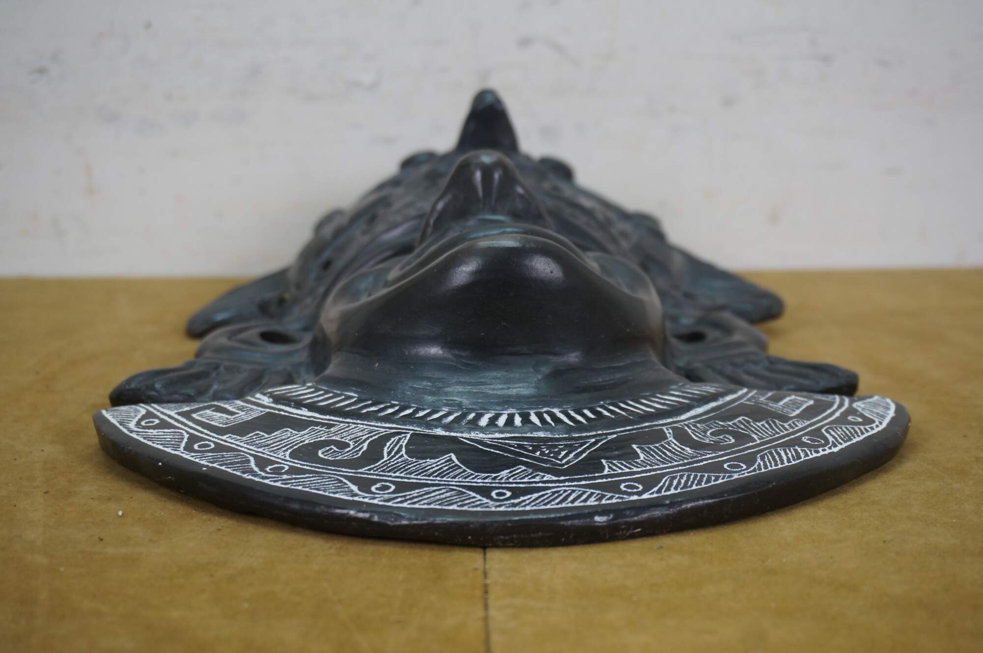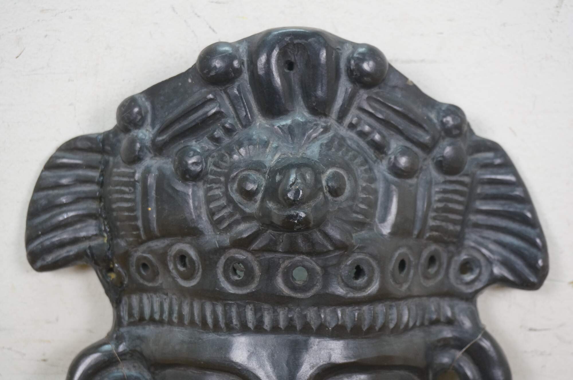 Circa mid-20th century barro negro / black clay Mexican folk art pottery Mayan / Aztec style wall hanging mask, with white painted details on the collar. Deity Cthulhu.