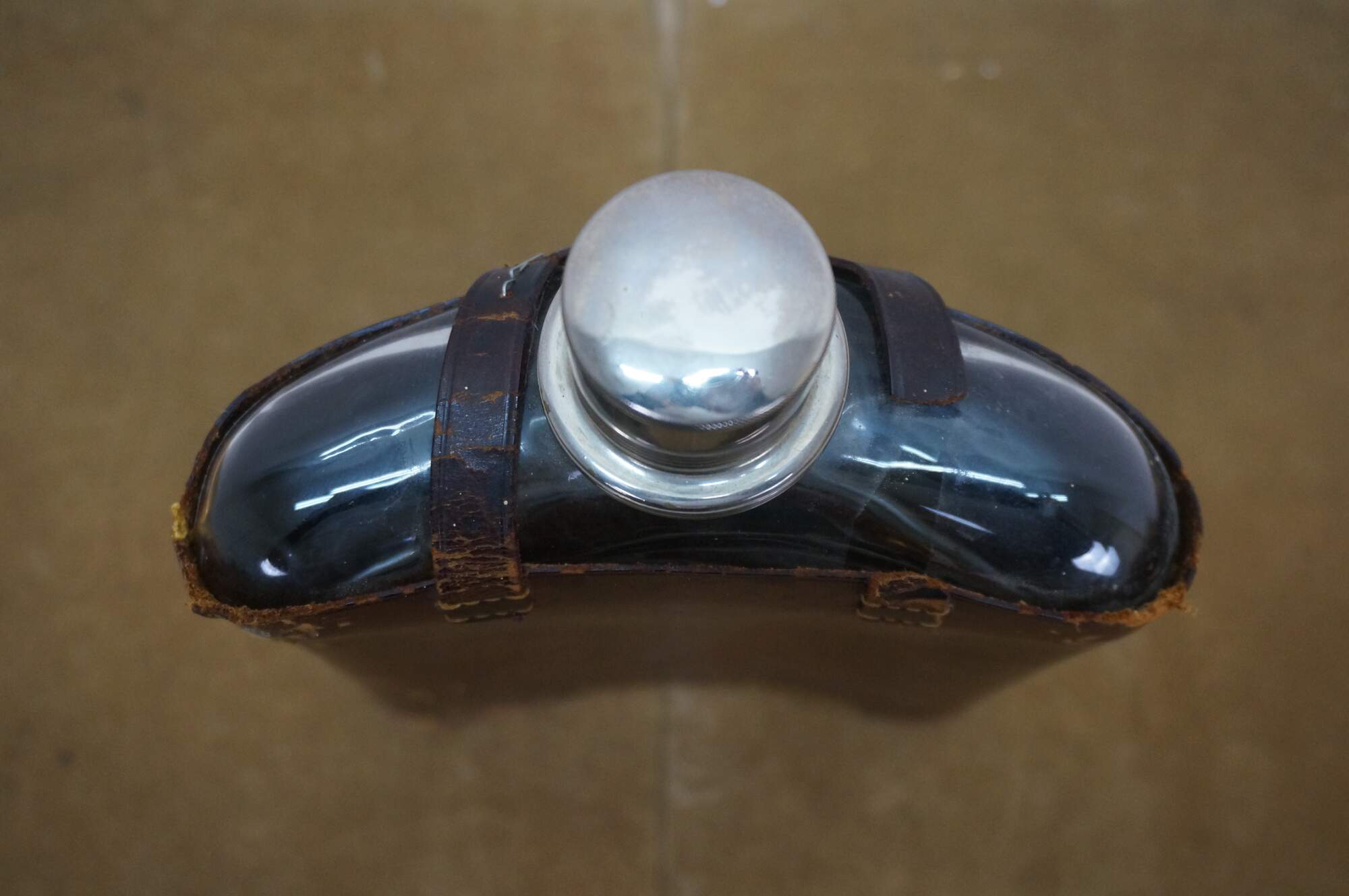 Circa mid-20th century oversized glass hip flask with silver plate screw cap and brown leather case. Purchased from the EH Crump Estate, accompanied by a business card from an antique store where it was likely purchased.
