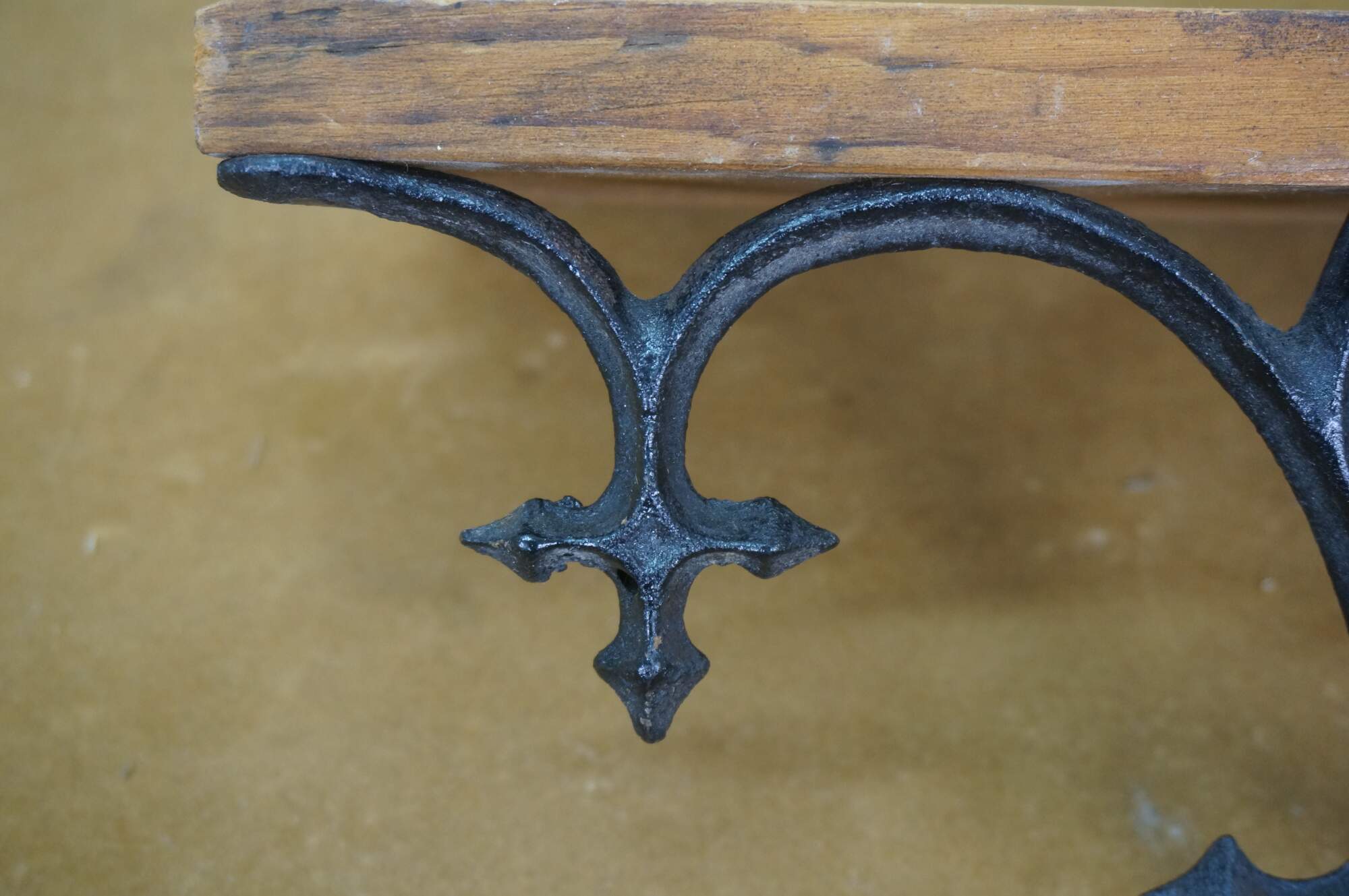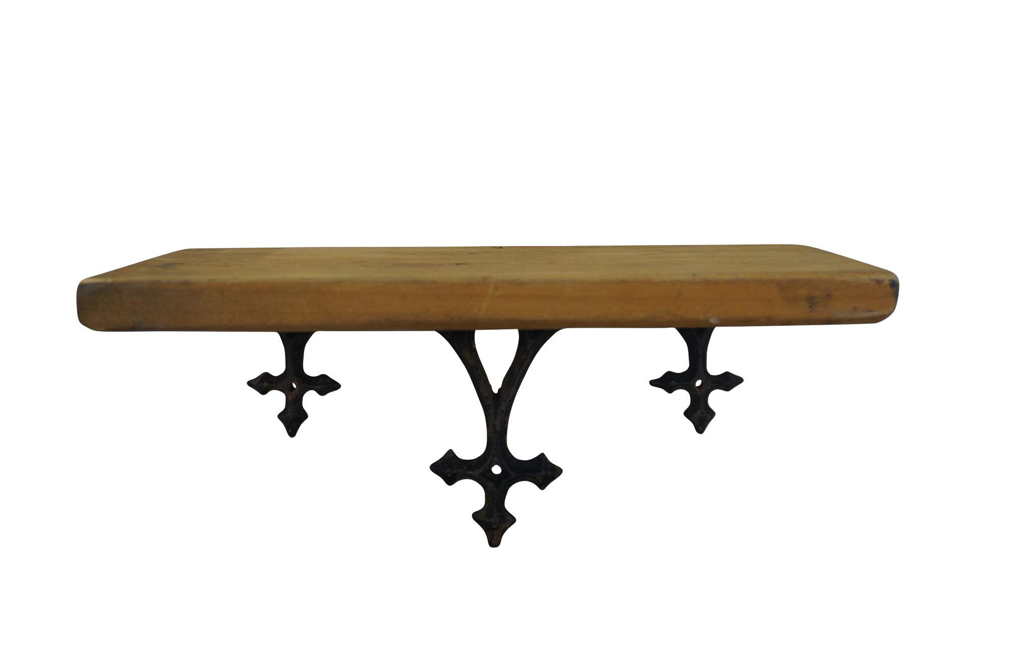 Pair of vintage 20th-century wall hanging shelves / sconces featuring hardwood tops and Spanish /Gothic-style cast iron brackets.