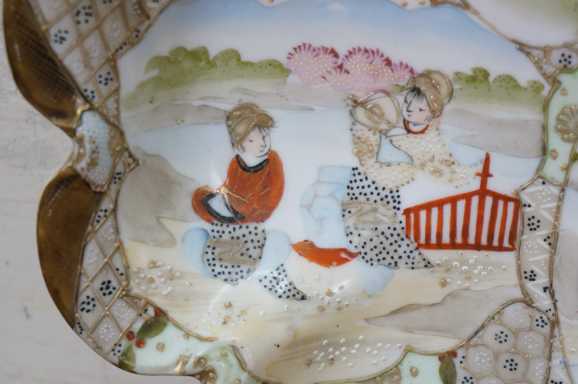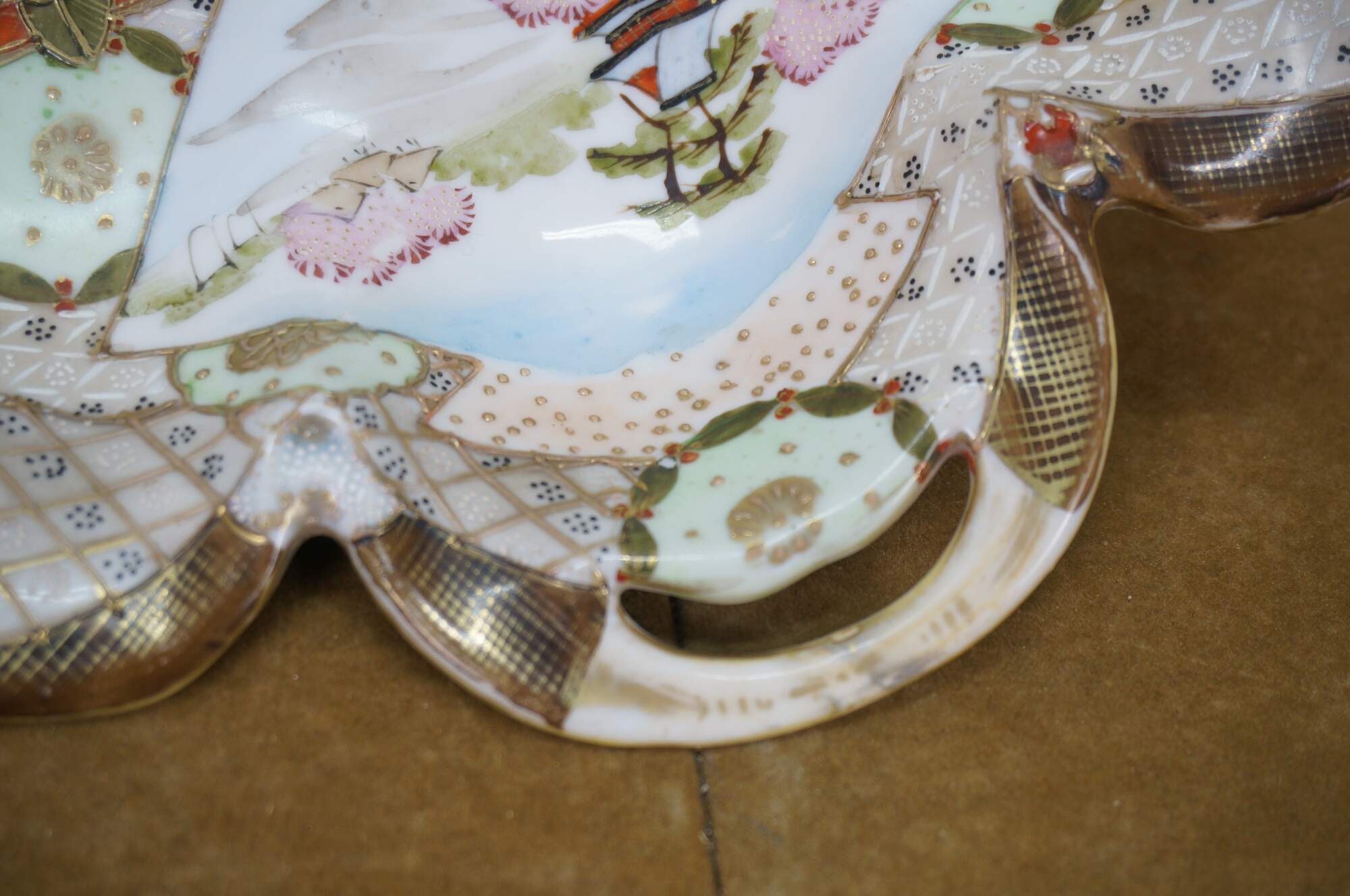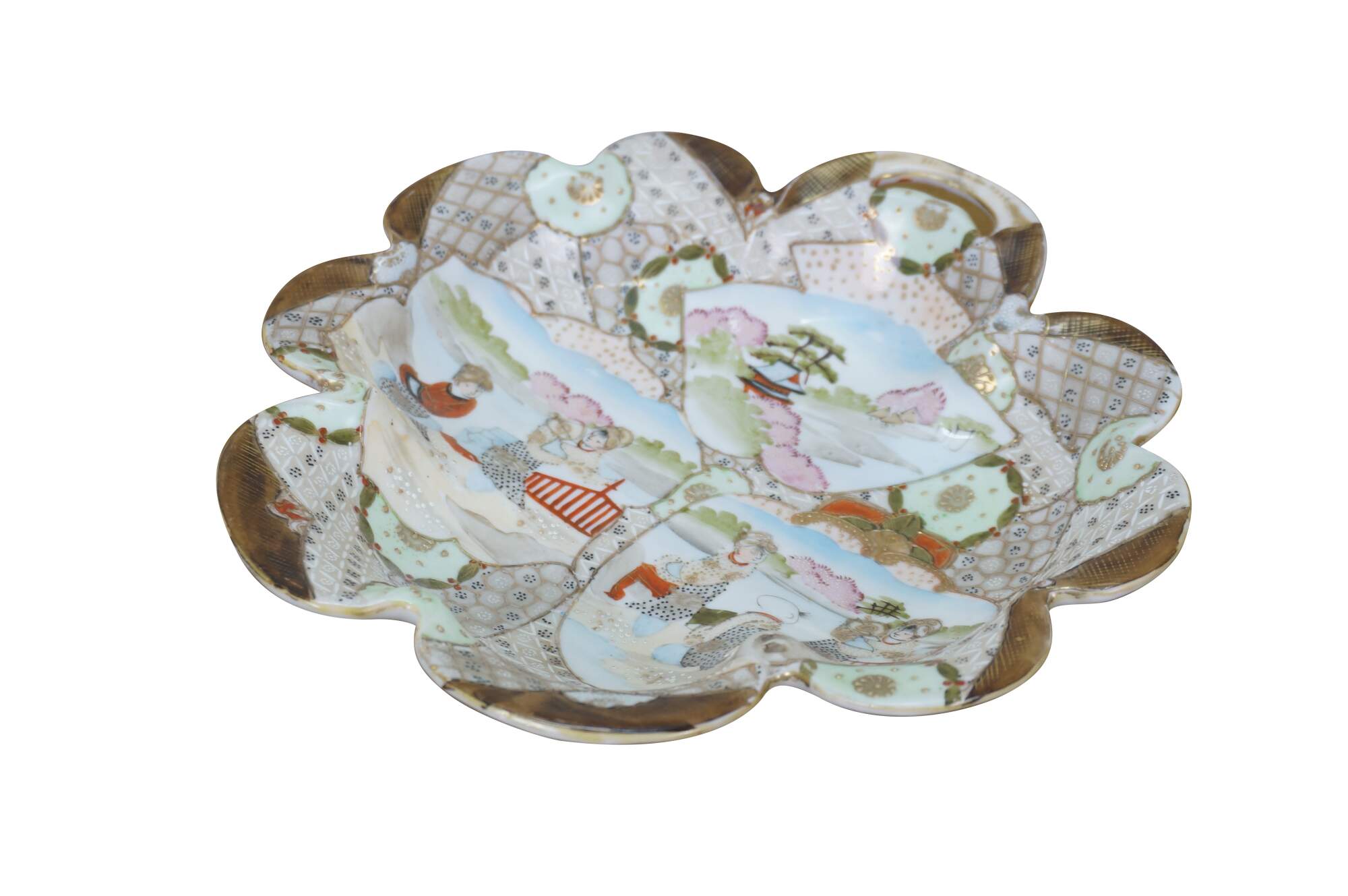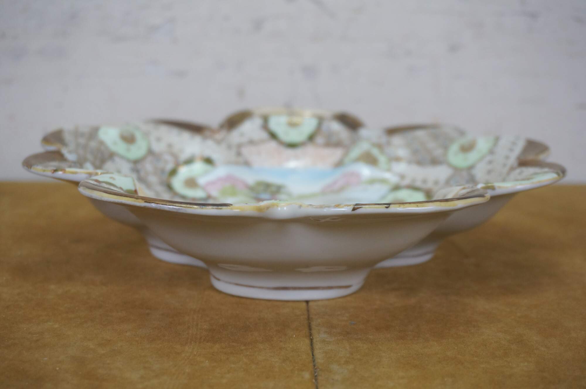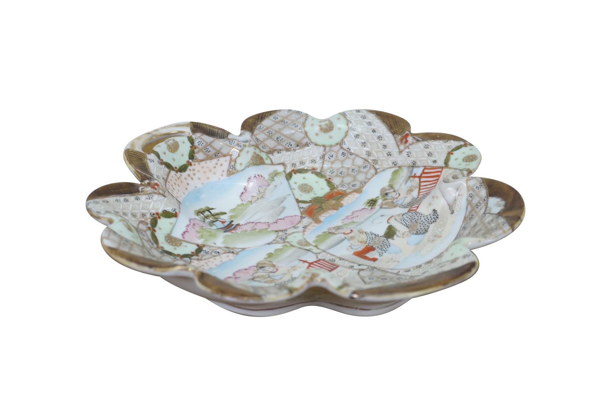 Early to mid-20th century Japanese satsuma style hand-painted porcelain serving dish/ bowl. Nine-petaled flower shape with pierced handle on one side. Hand-painted with patterns in beige and mint green surrounding small pagoda landscapes and scenes with geisha figures.