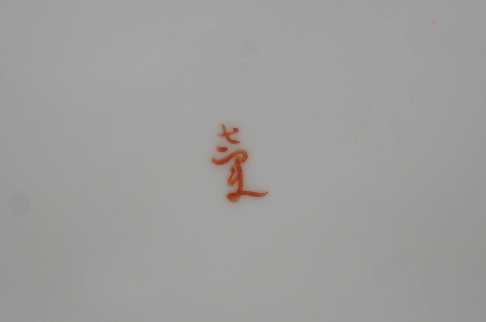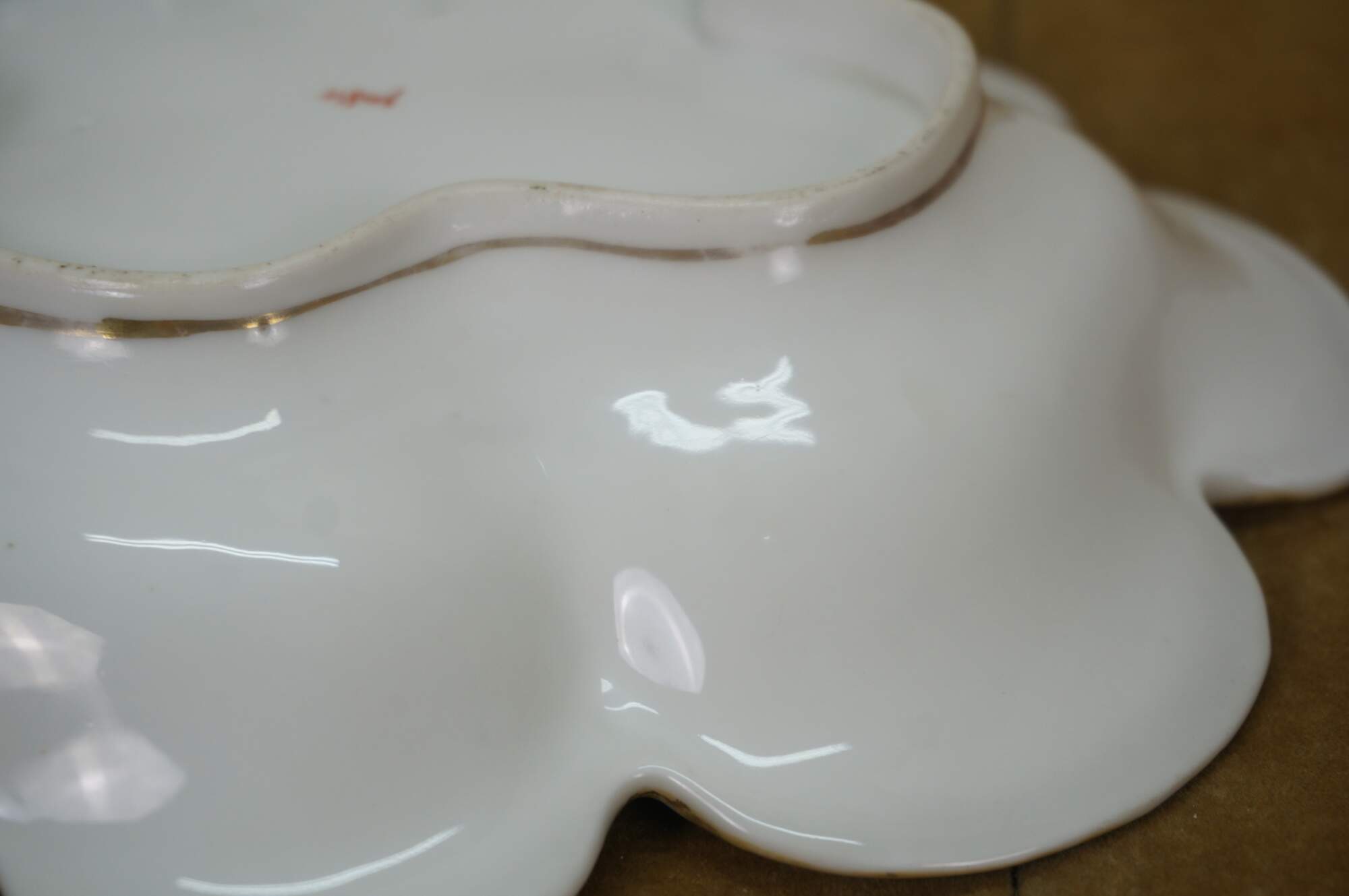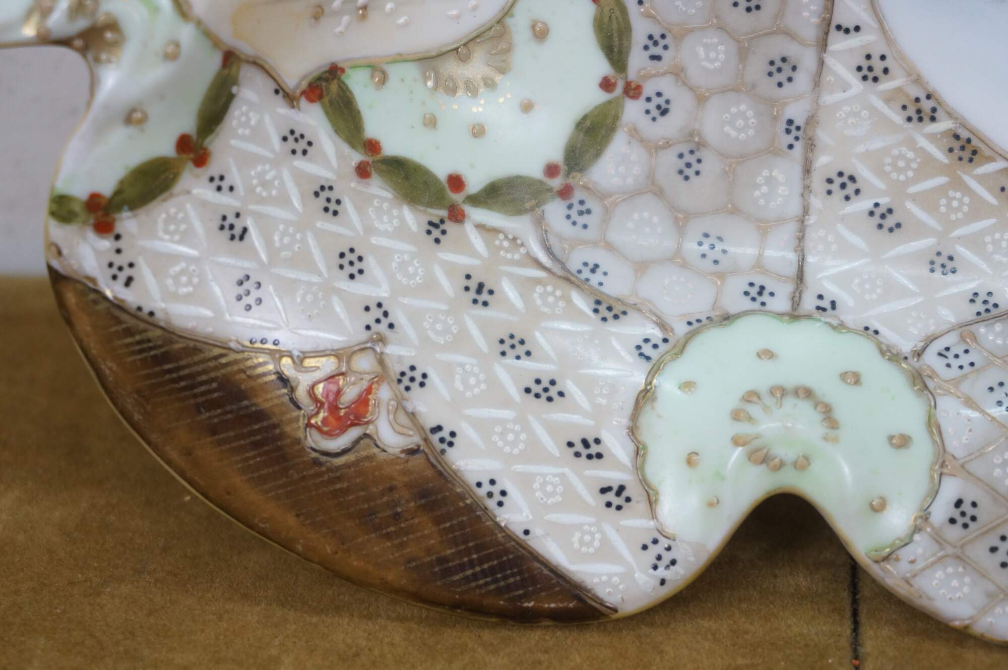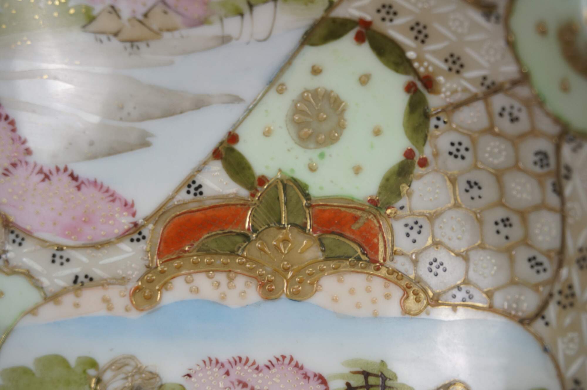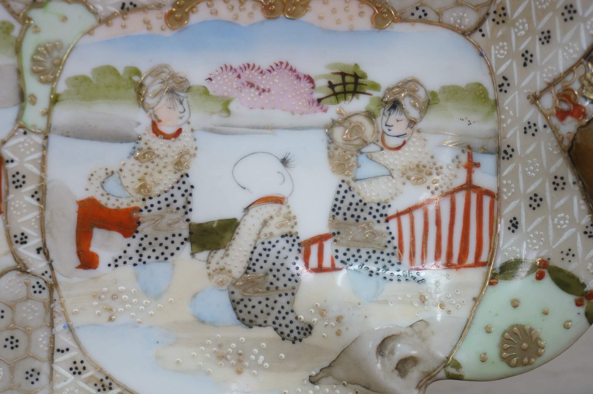 Early to mid-20th century Japanese satsuma style hand-painted porcelain serving dish/ bowl. Nine-petaled flower shape with pierced handle on one side. Hand-painted with patterns in beige and mint green surrounding small pagoda landscapes and scenes with geisha figures.