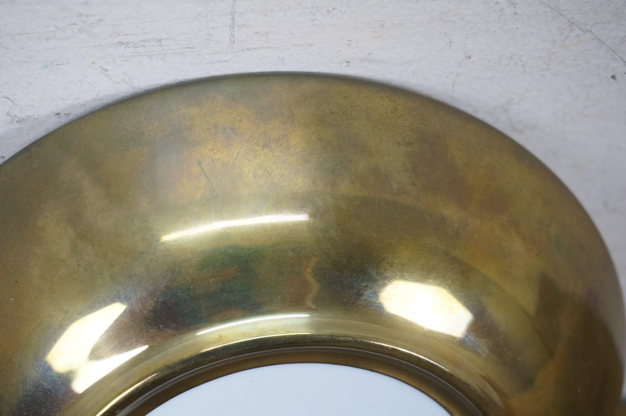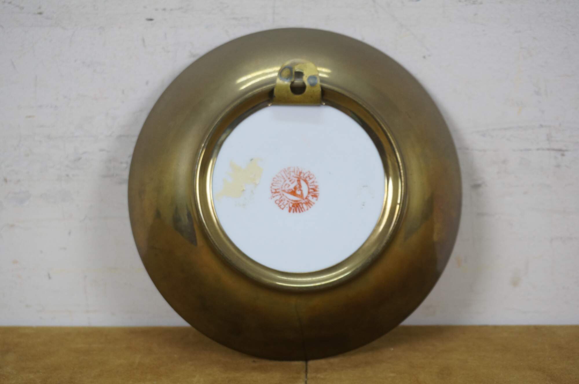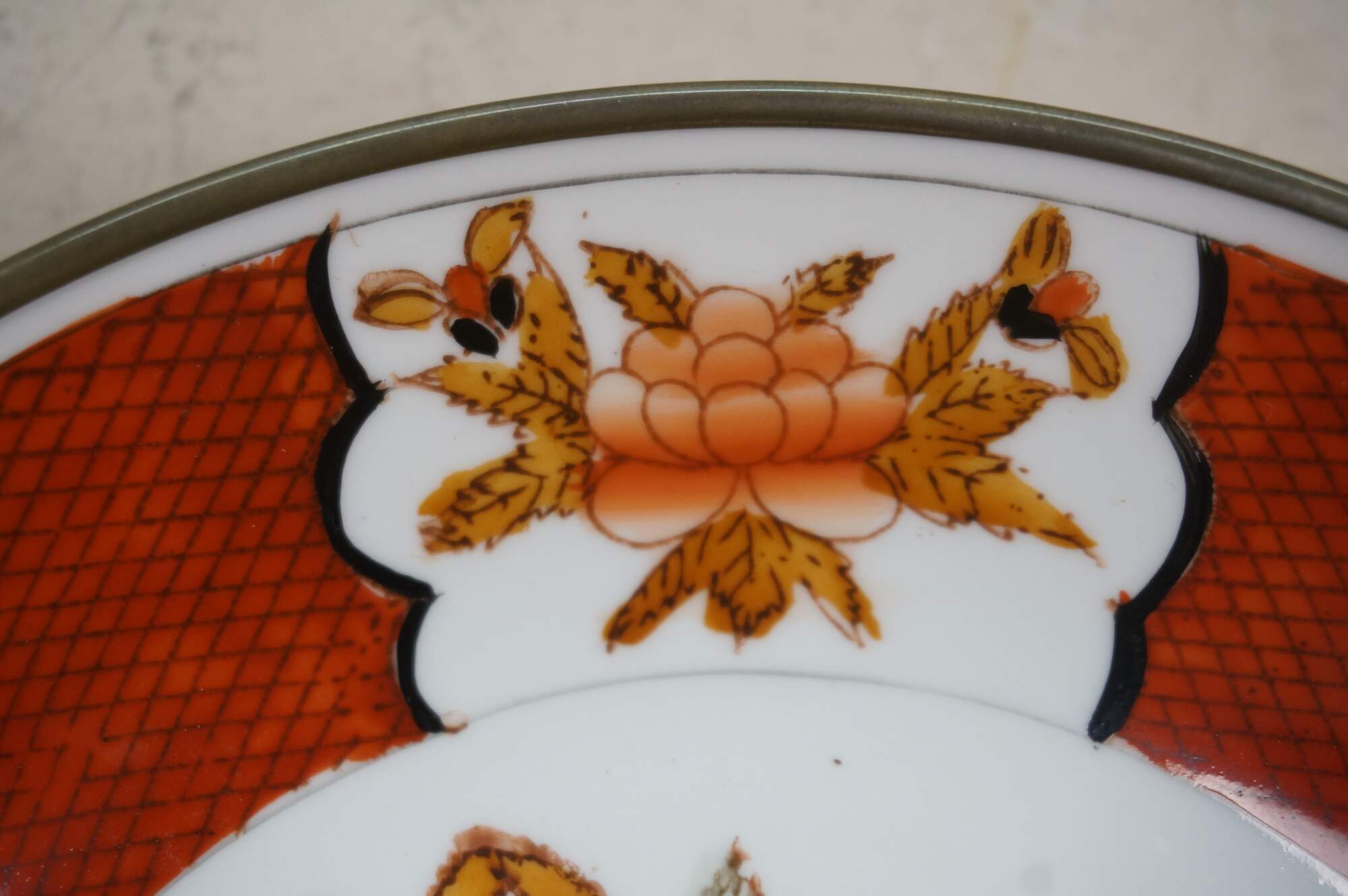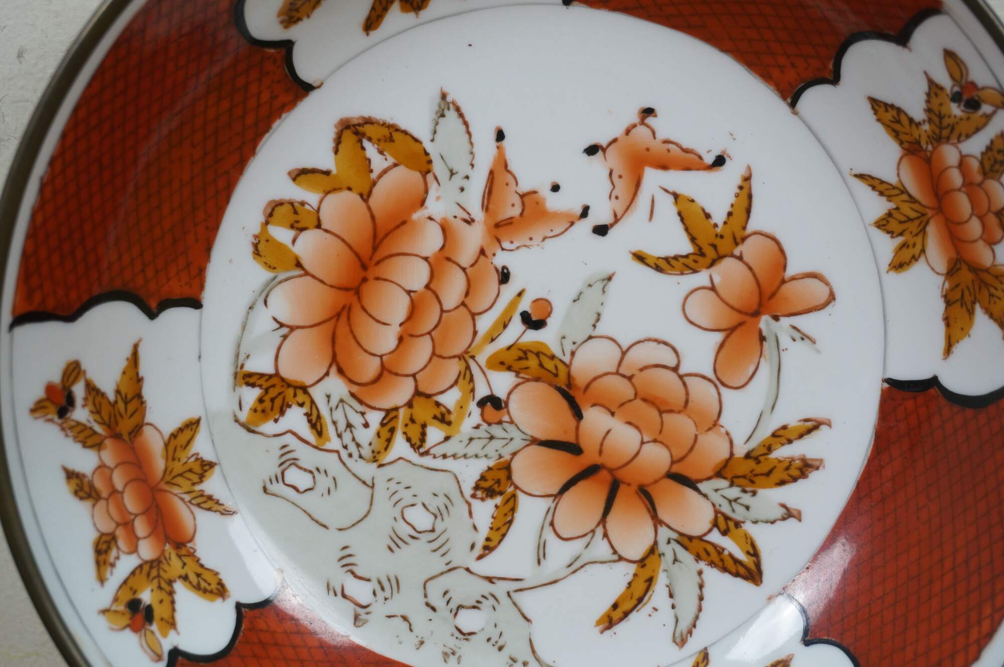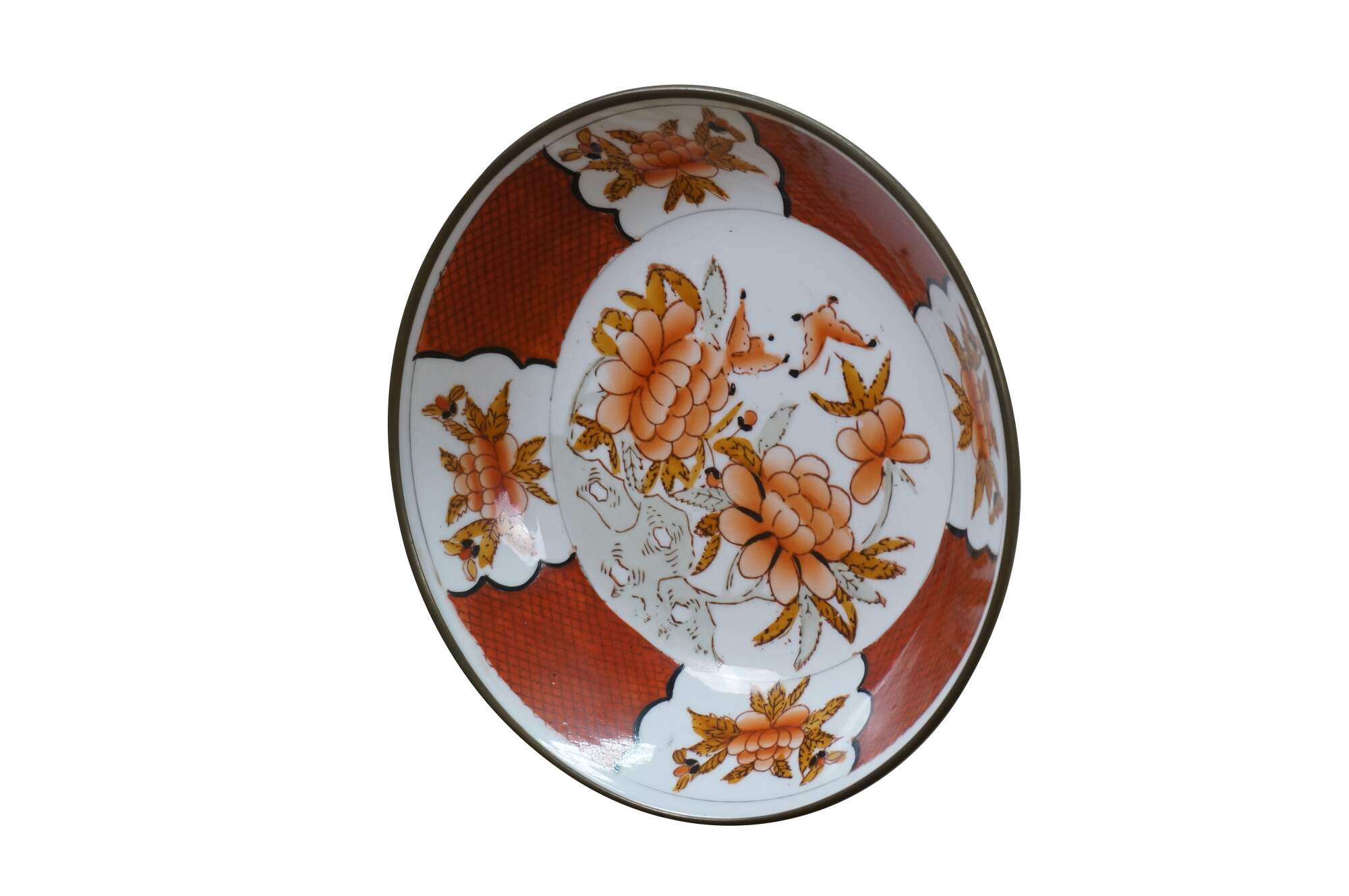 Vintage 20th century Chinese porcelain trinket dish / bowl encased in brass and hand painted with red panels and peachy orange flowers. Made in China - For Decorative Use Only.