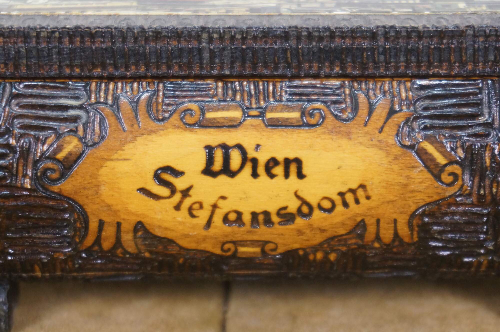 Mid to late 20th century Black Forest style carved wood trinket / keepsake Wein Stefansdombox with a print on the lid featuring Wein Stefansdom - St Stephen's Cathedral in Vienna Austria.