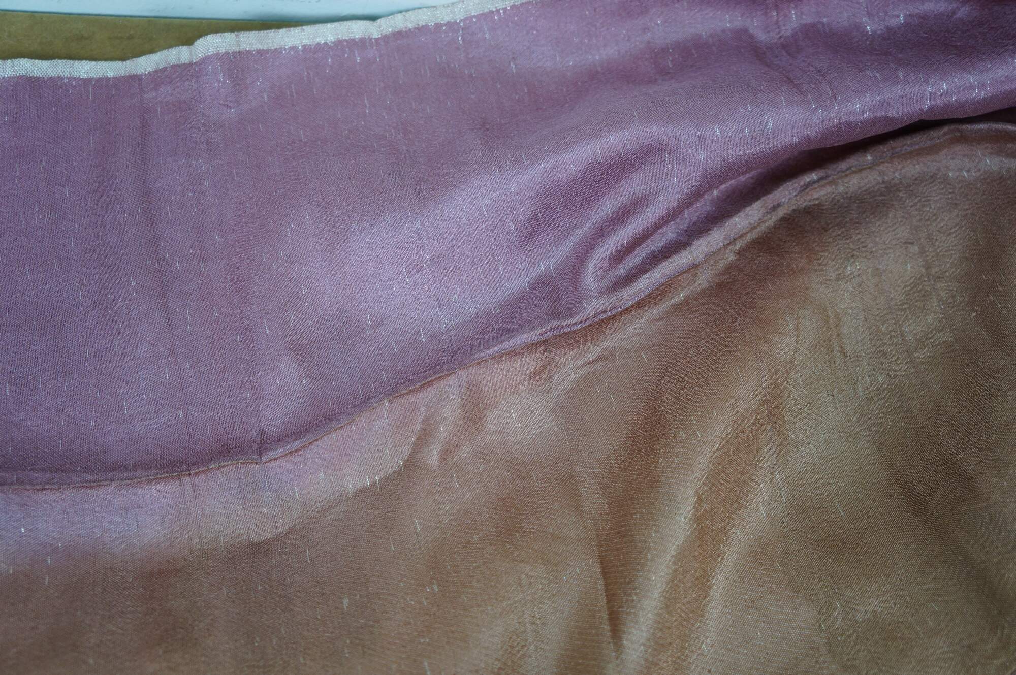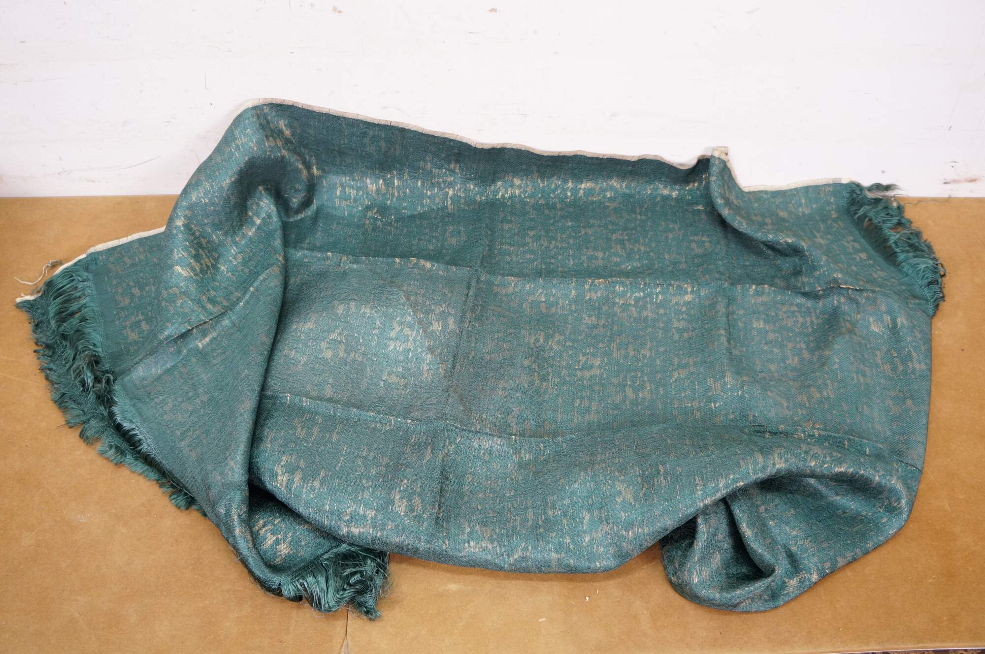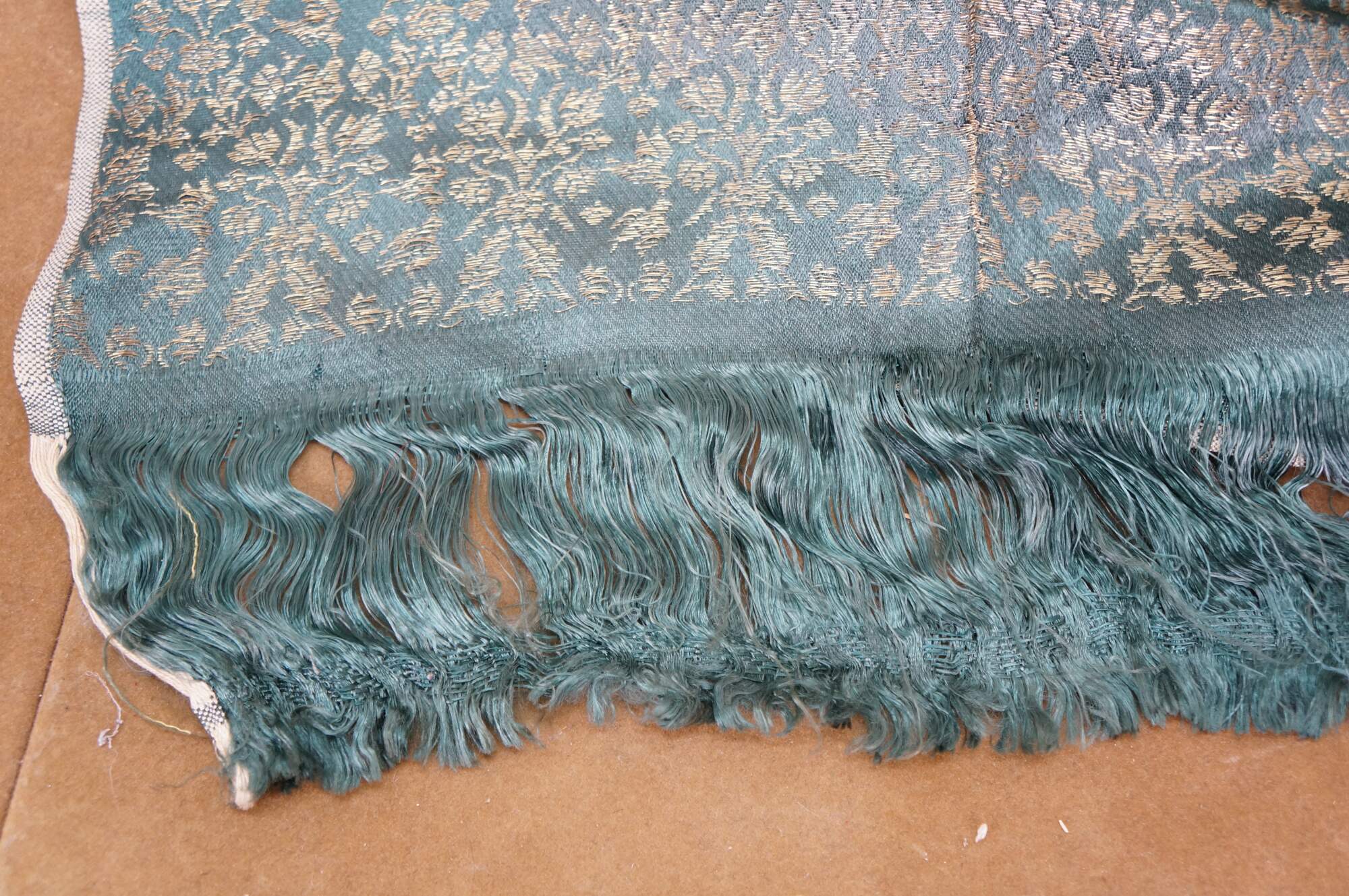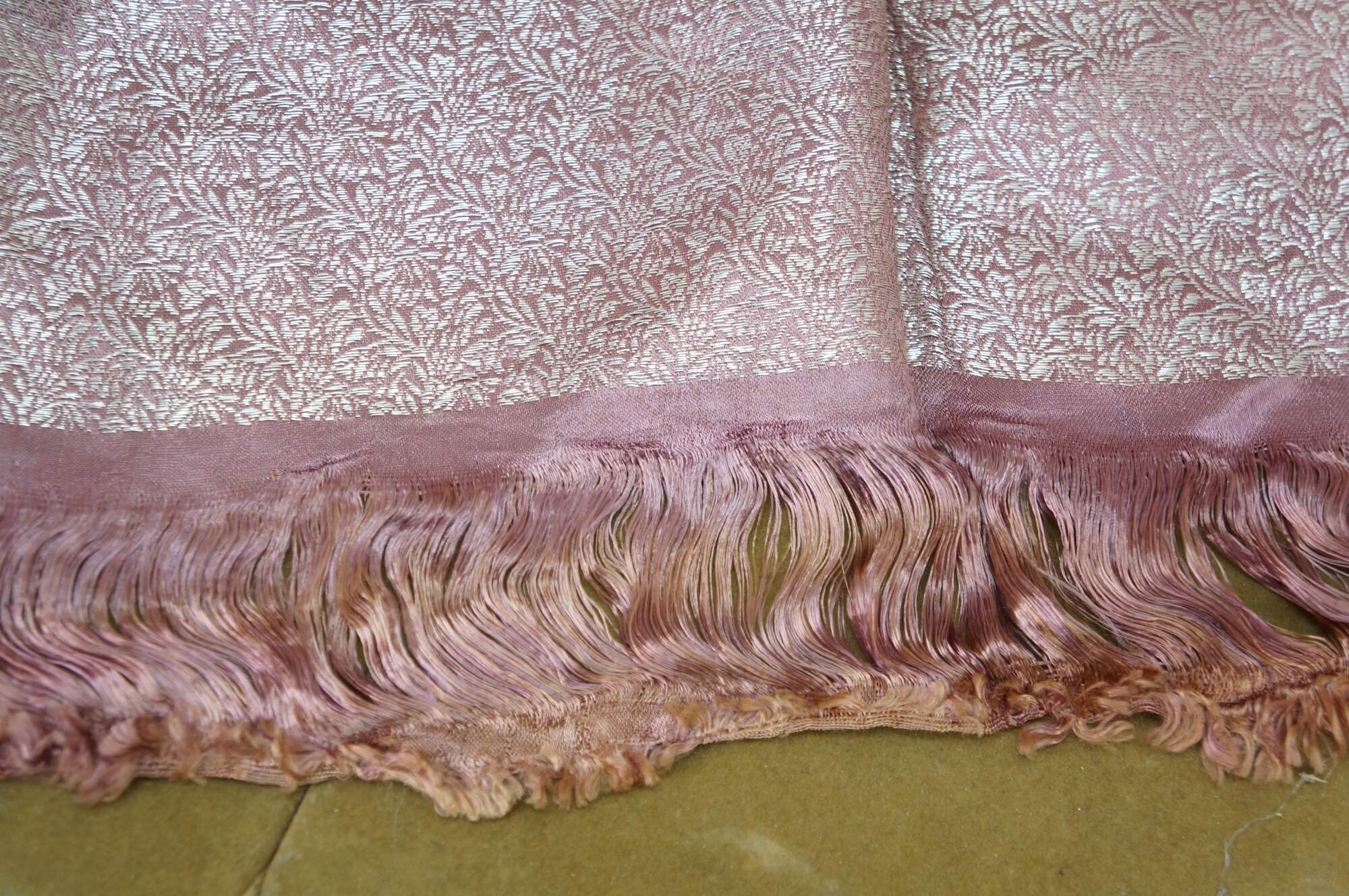 Pair of vintage woven silk shawls / wraps or tablecloths - soft pink and emerald green with fringed edges and floral /foliated designs in metallic gold thread.