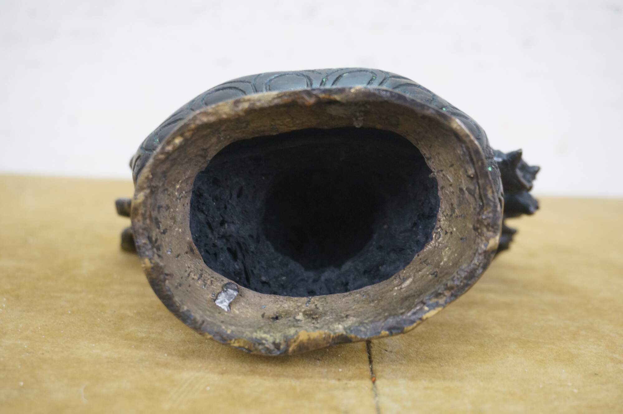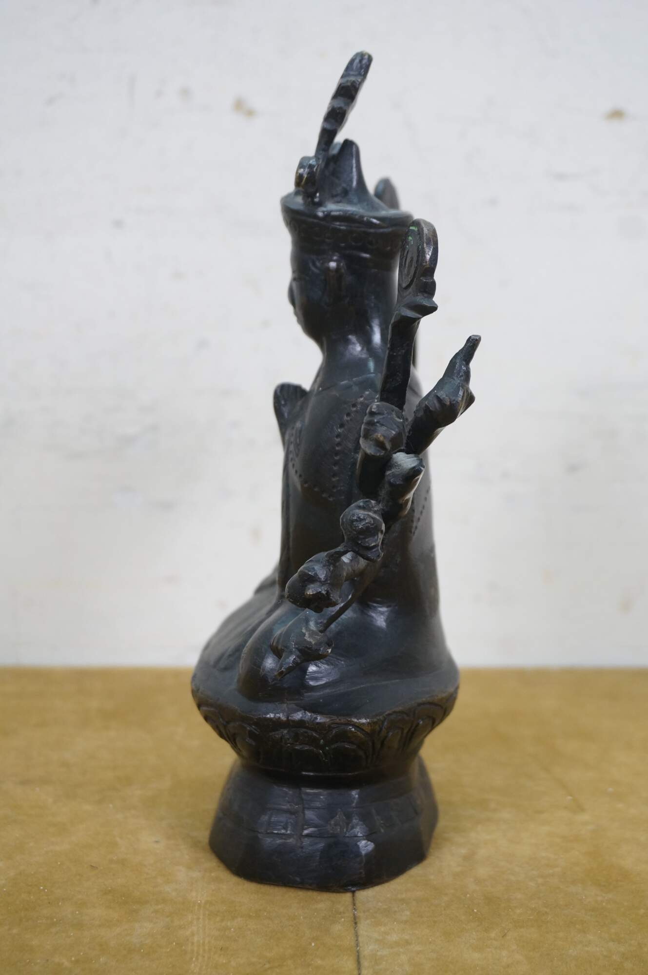Vintage cast bronze alter figurine of the Buddhist bodhuisattva Avalokiteshvara, aka Guanyin of the Thousand Arms. Made of dark patinaed bronze, the figure is seated in lotus position on a pedestal base, dressed in robes and sun shaped head piece, with one pair of hands folding in front and seven additional pairs of arms holding various objects.