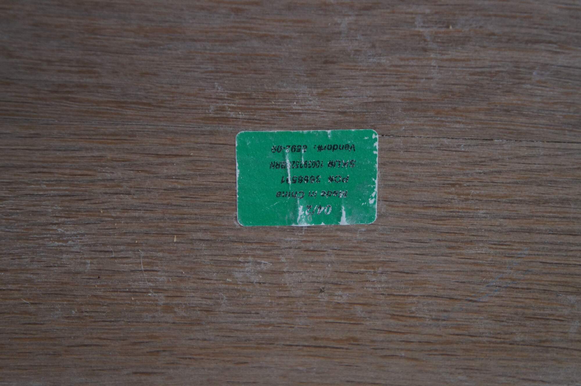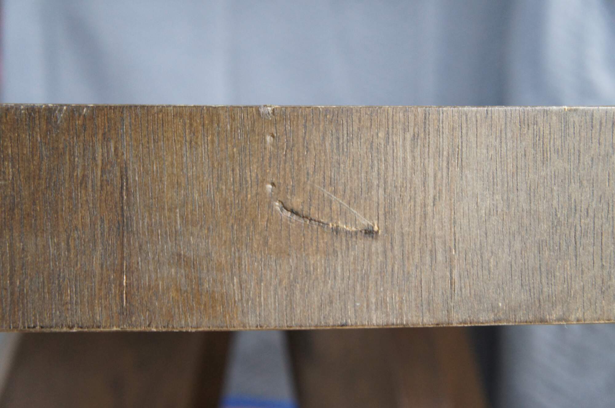 Good Overall; Wear commensurate with age and use. Some marking, scuffing, and finish wear. Some lifting to the veneer on the lower apron of one side of the table.