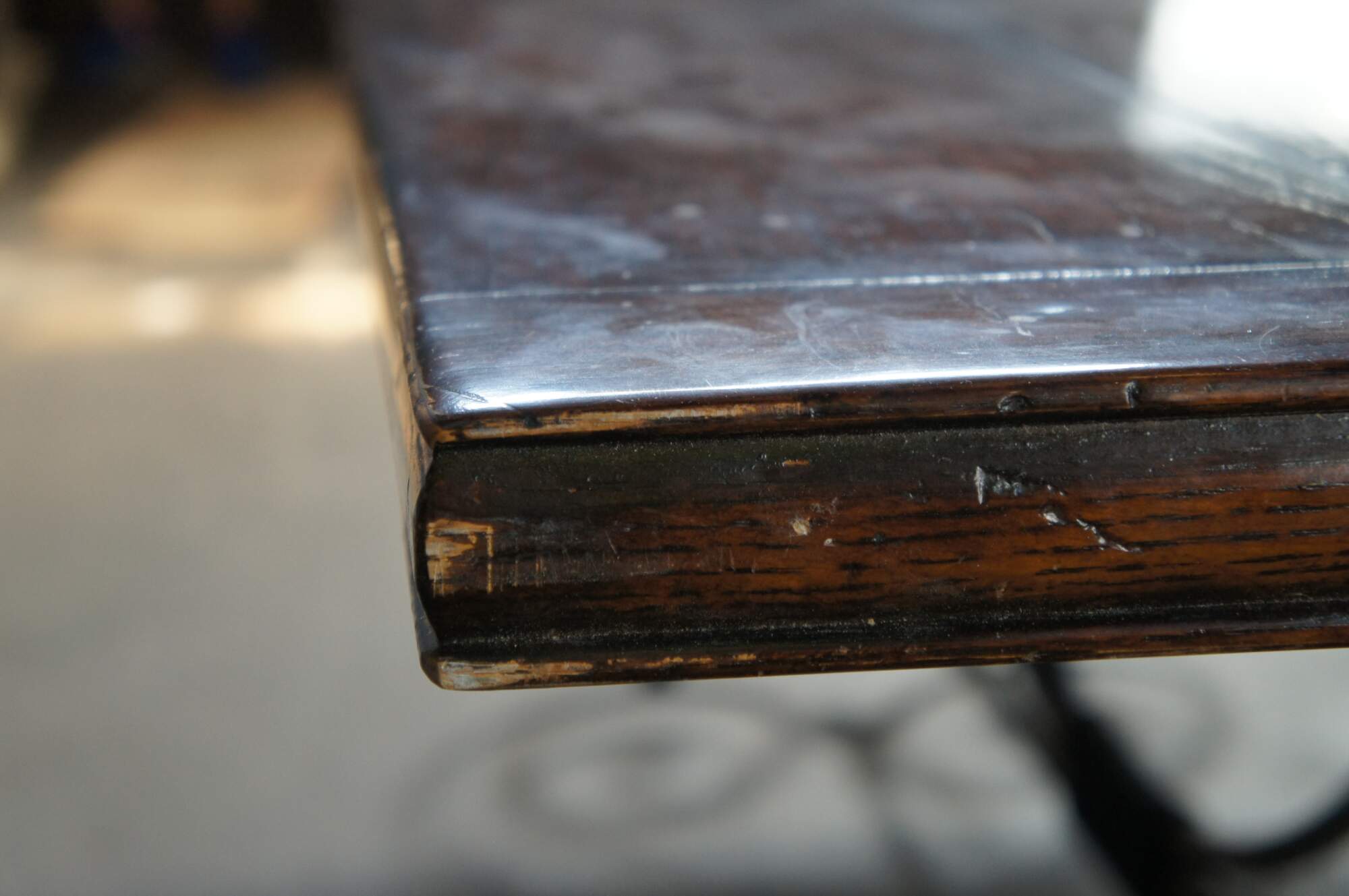 Theodore Alexander farmhouse dining table. Features a rectangular oak plank-style top over a scrolled iron footed base. Circa 2010s