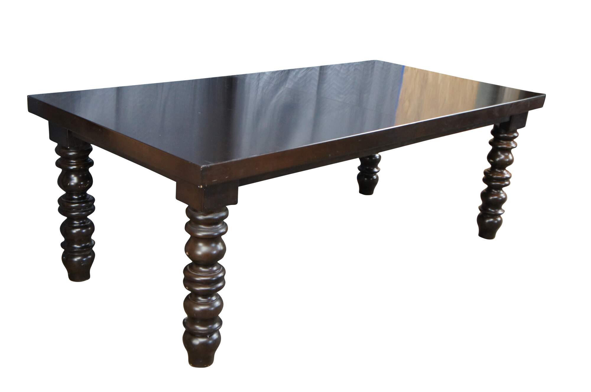 Drexel Heritage Postobello Wellsley Dining Table, circa 2010s. Features a rectangular contemporary form made from walnut with robust turned legs and turnip feet. Inlcudes two leaves that open for extension. 236-6691
