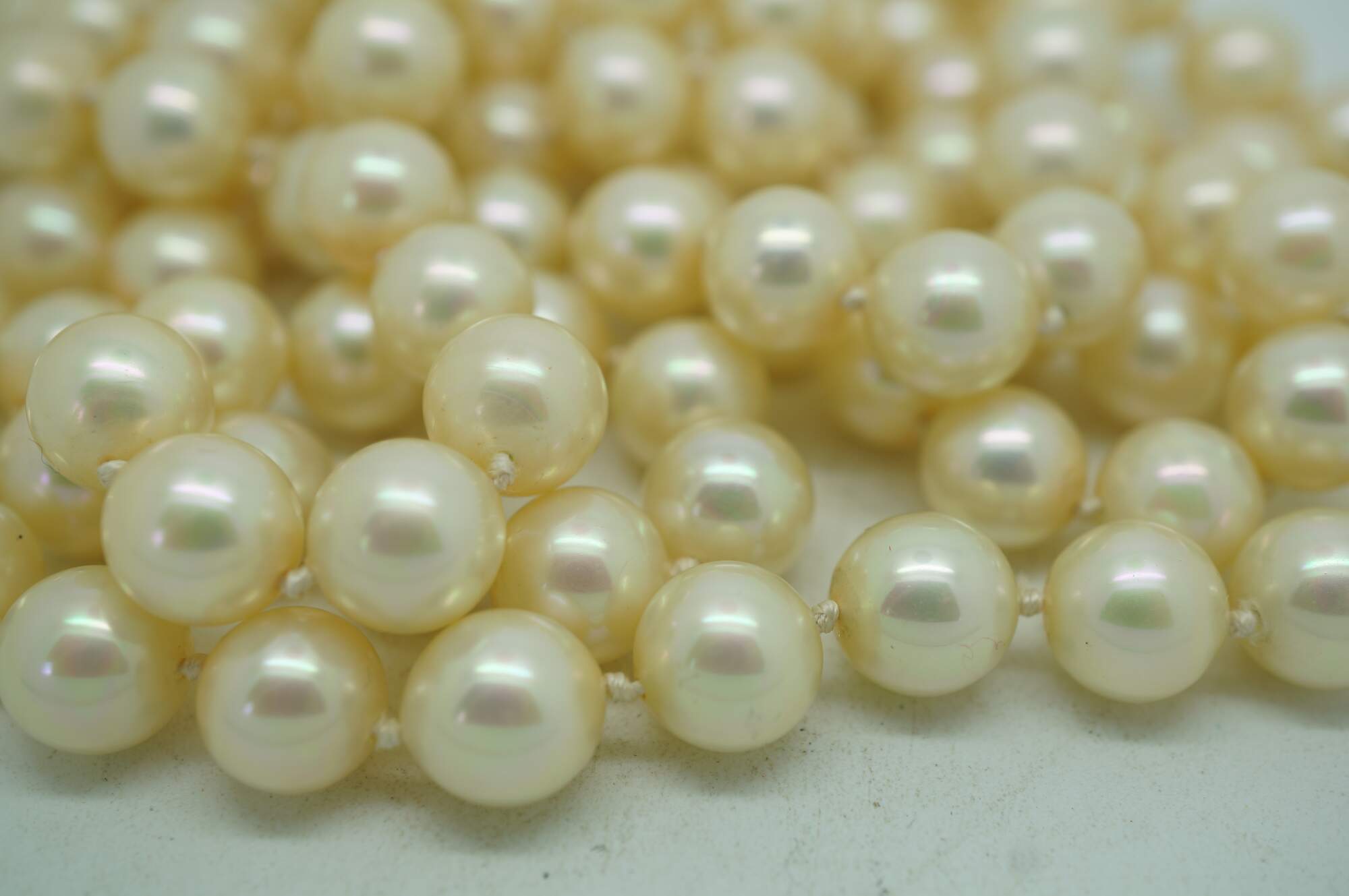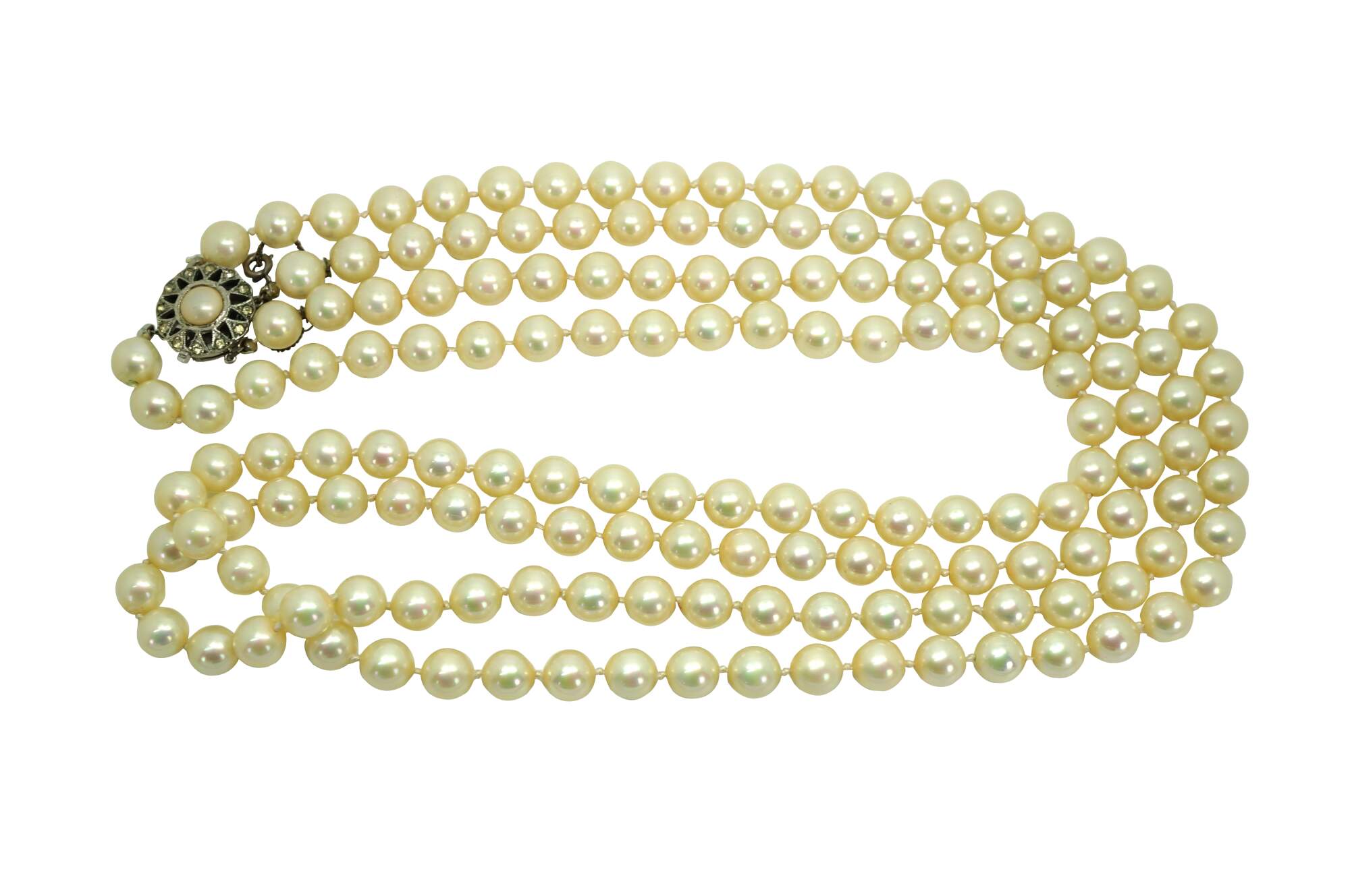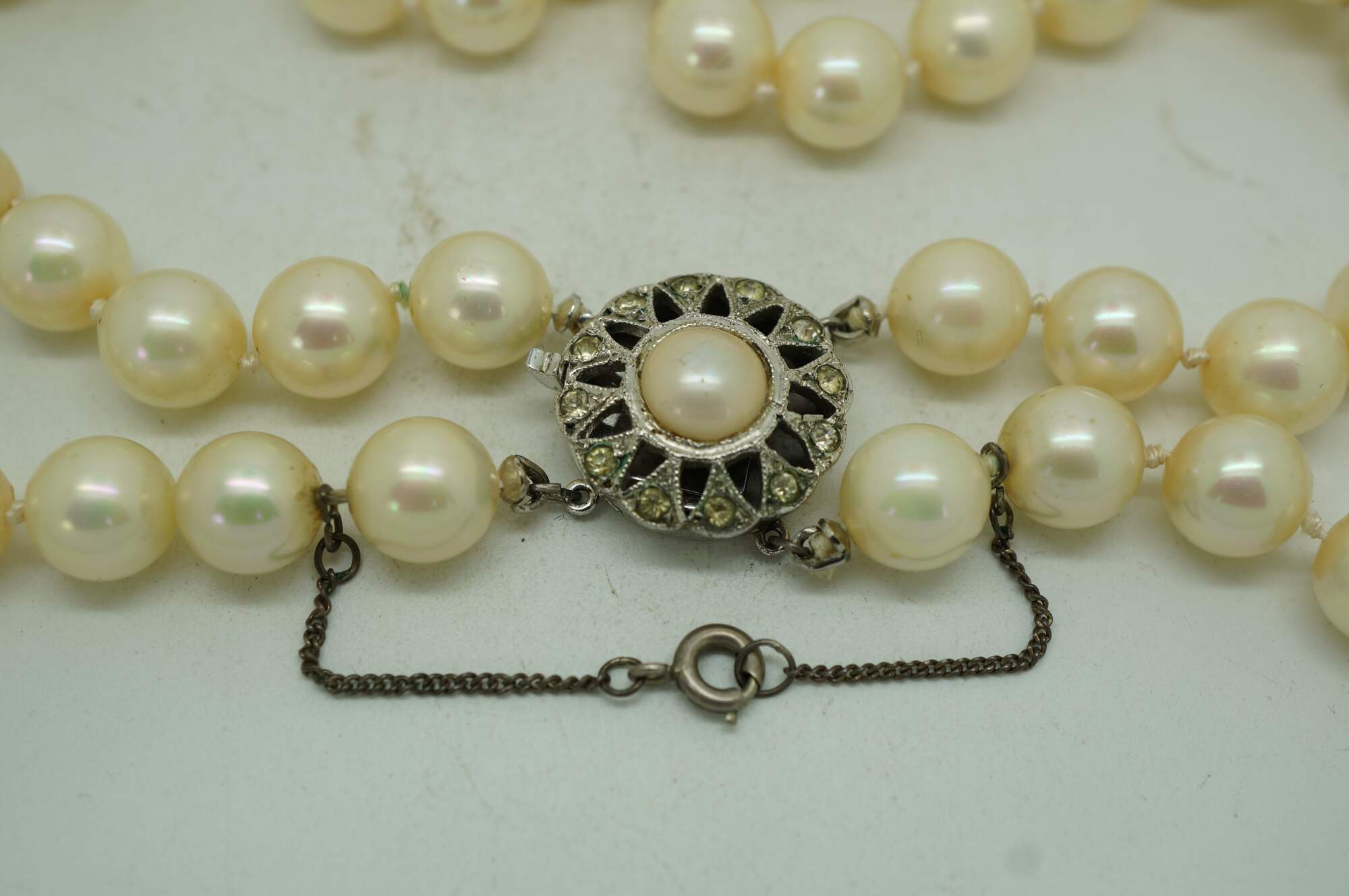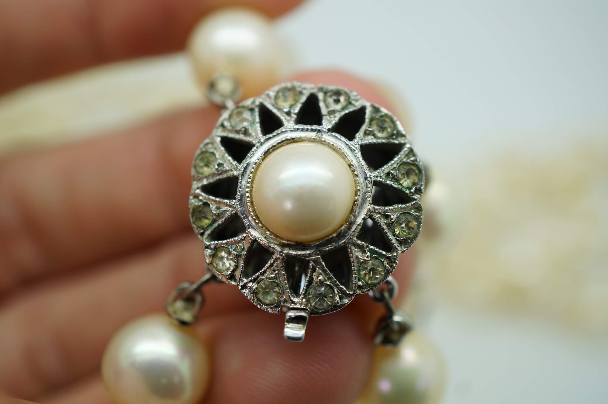 Vintage double strand necklace crafted of heavy cream-colored faux pearls, knotted between each bead and secured with a sunburst-shaped clasp studded with white rhinestones.