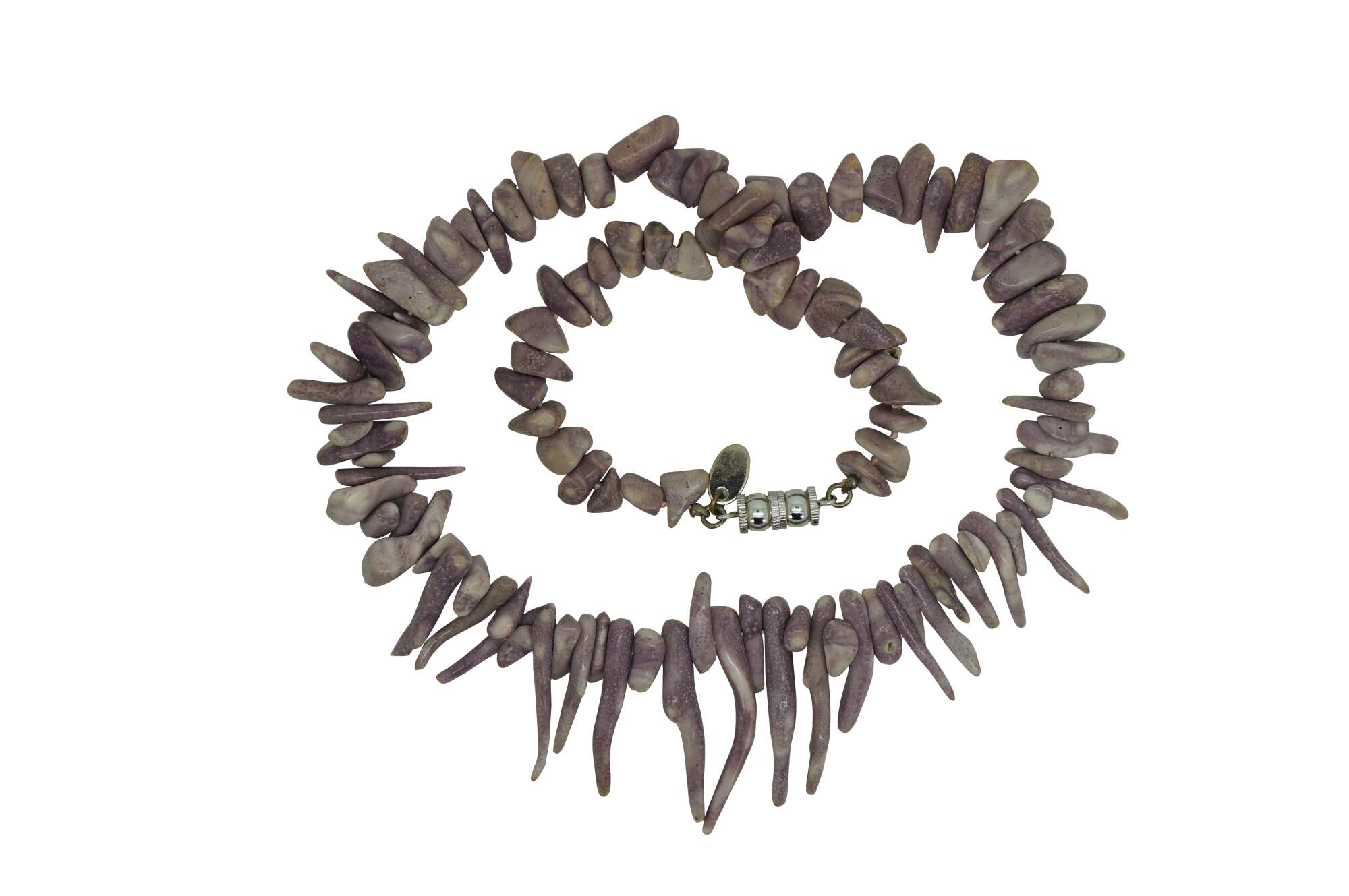 Vintage 20th century set of Les Bernard jewelry including two necklaces of graduated purple / lavender branch coral beads and a pair of matching post-back dangle earrings. Sterling silver clasps.