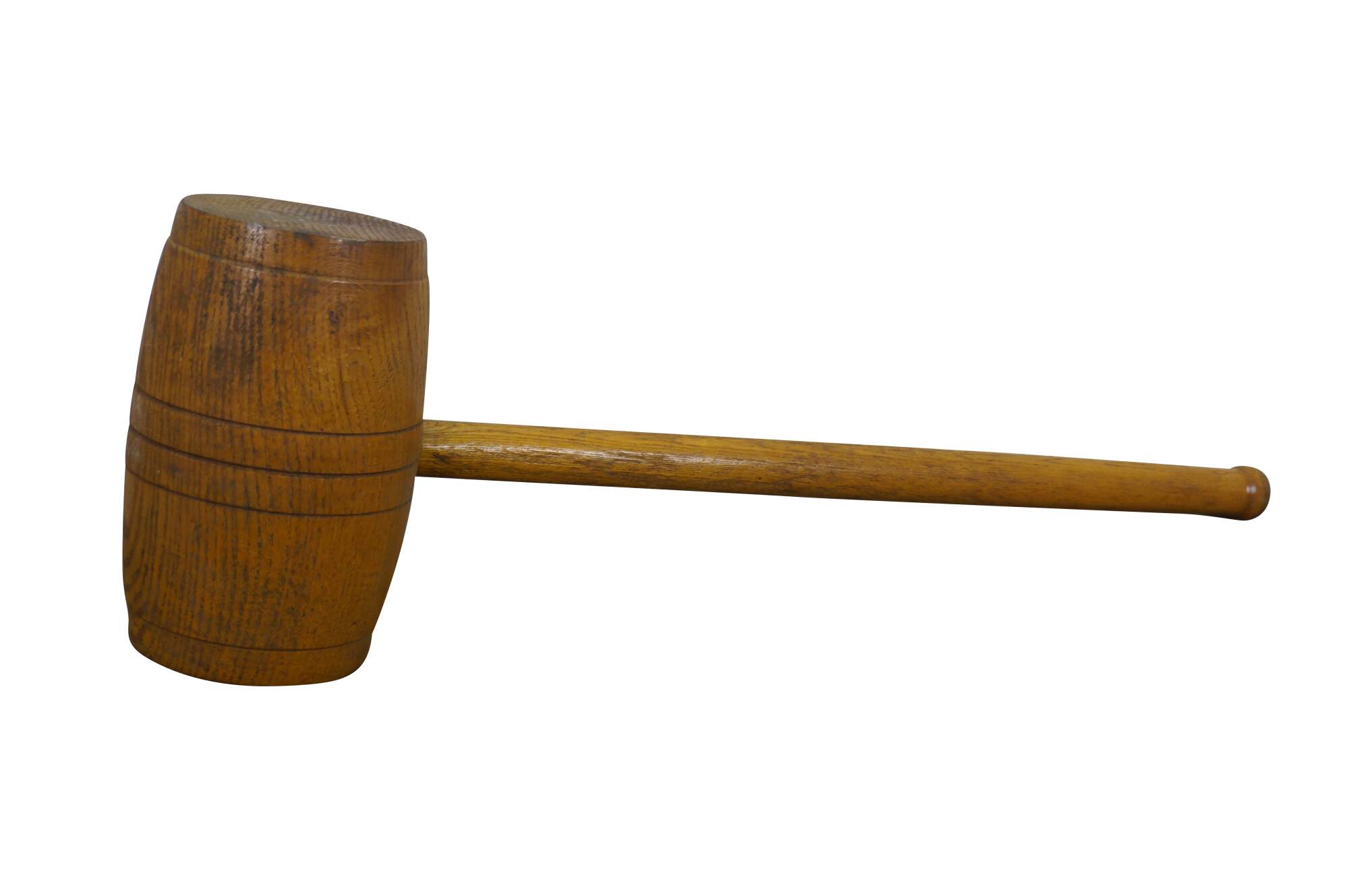 Vintage 20th-century oversized wooden mallet / hammer / sledge of the type used in strongman acts or attractions at a carnival / circus / or a novelty judges’ gavel for law and justice. Grooved head slightly resembles a barrel.
