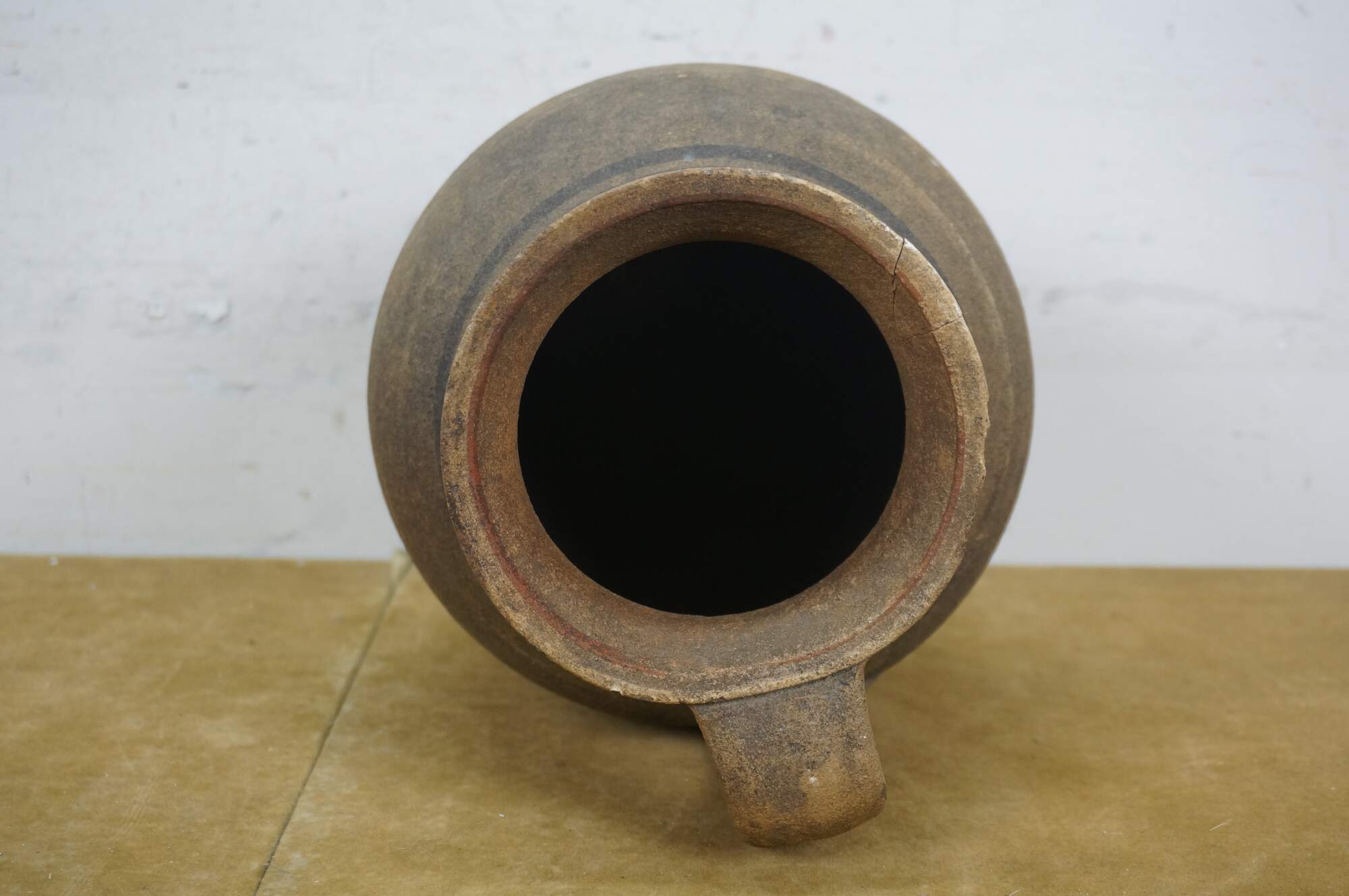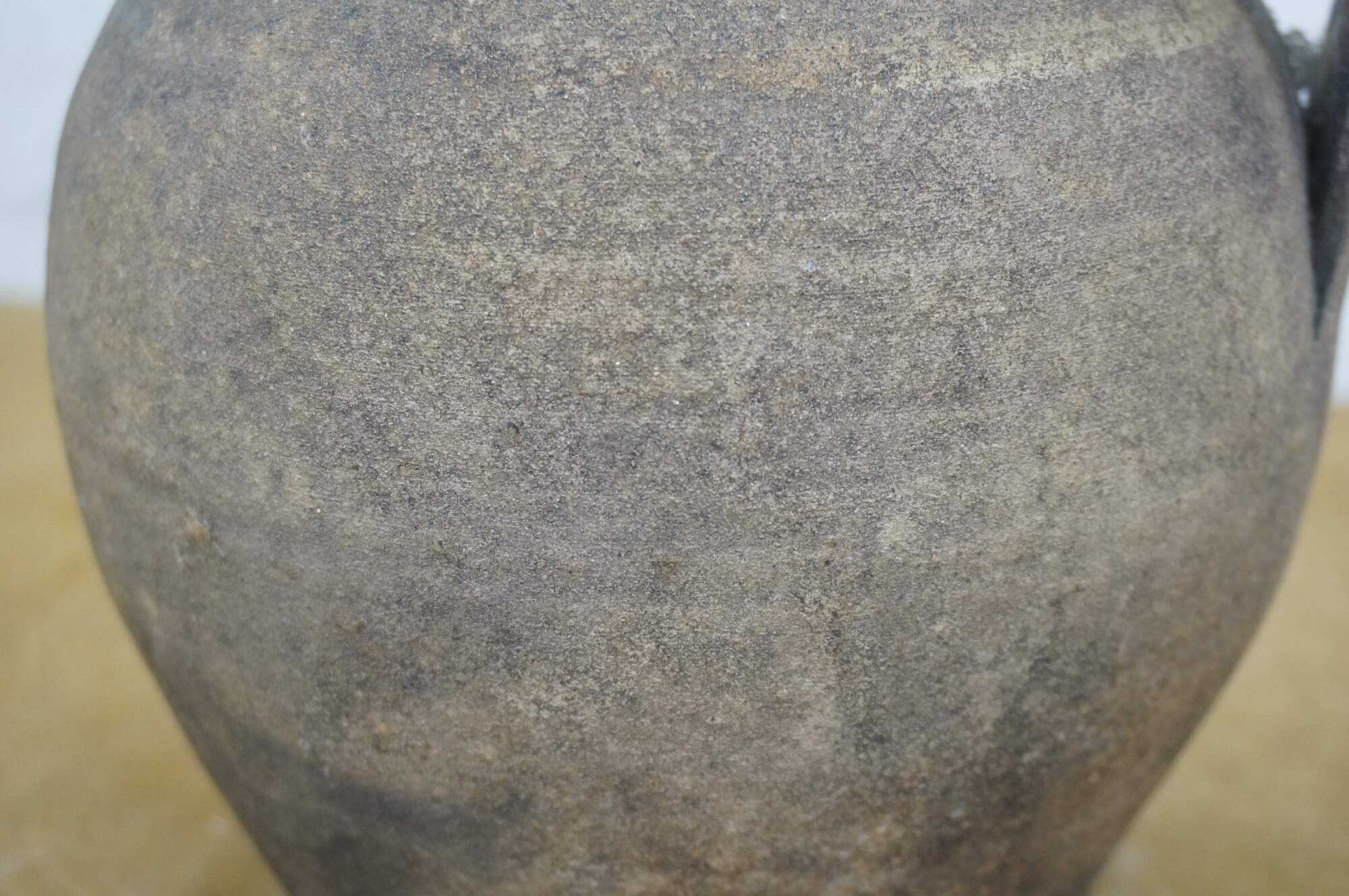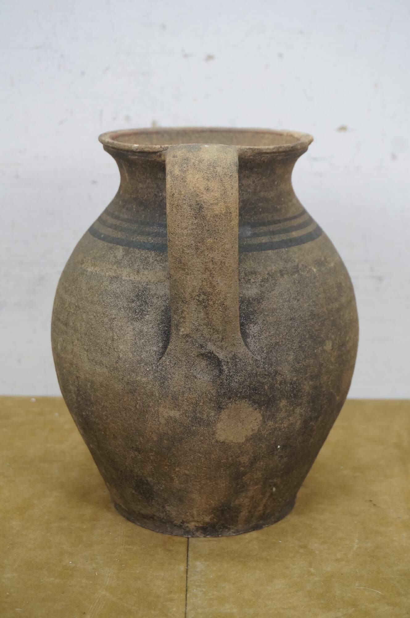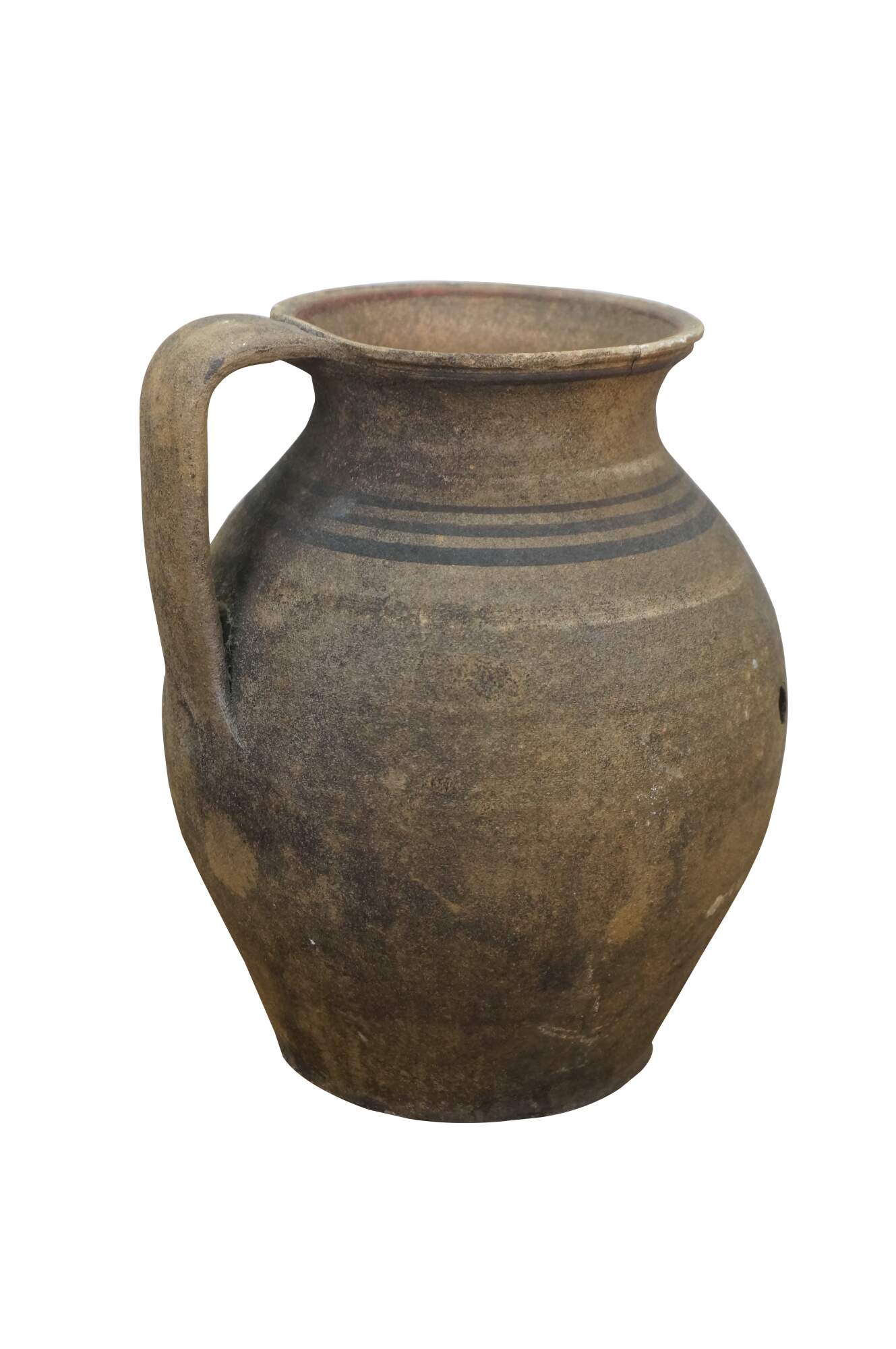Antique un-glazed earthenware pitcher / jug , decorated around the neck with a trio of dark lines.