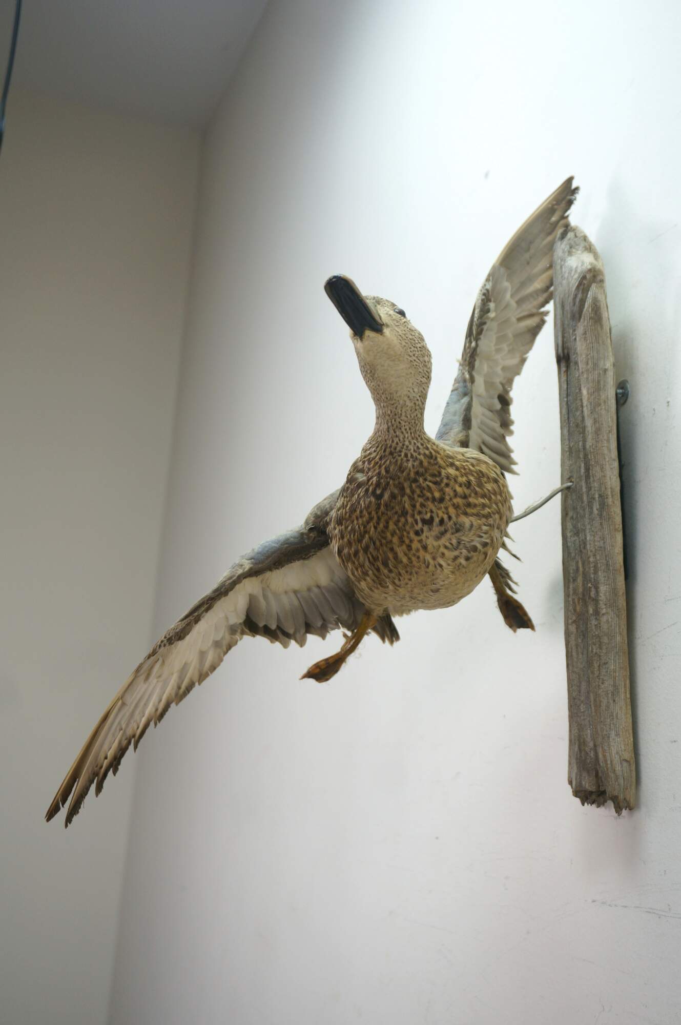 Vintage Blue Wing Teal Drake Duck waterfowl game bird taxidermy mount featuring the duck in flight on driftwood plaque.