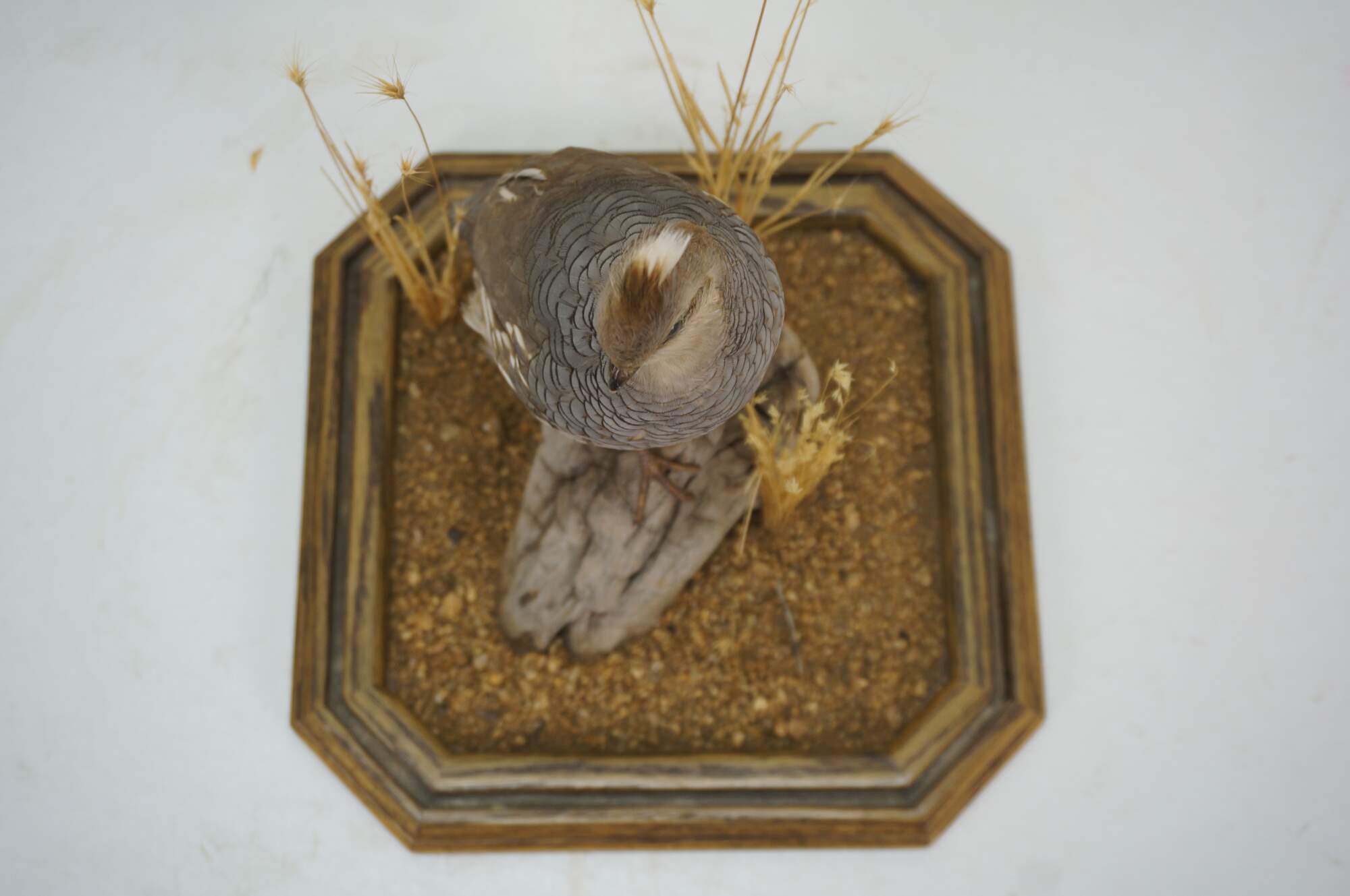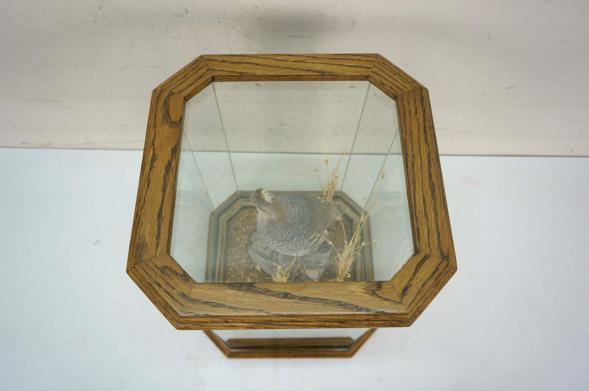 Vintage cased Blue Scaled Quail game bird taxidermy mount in octagonal oak and glass showcase with driftwood and foliage.