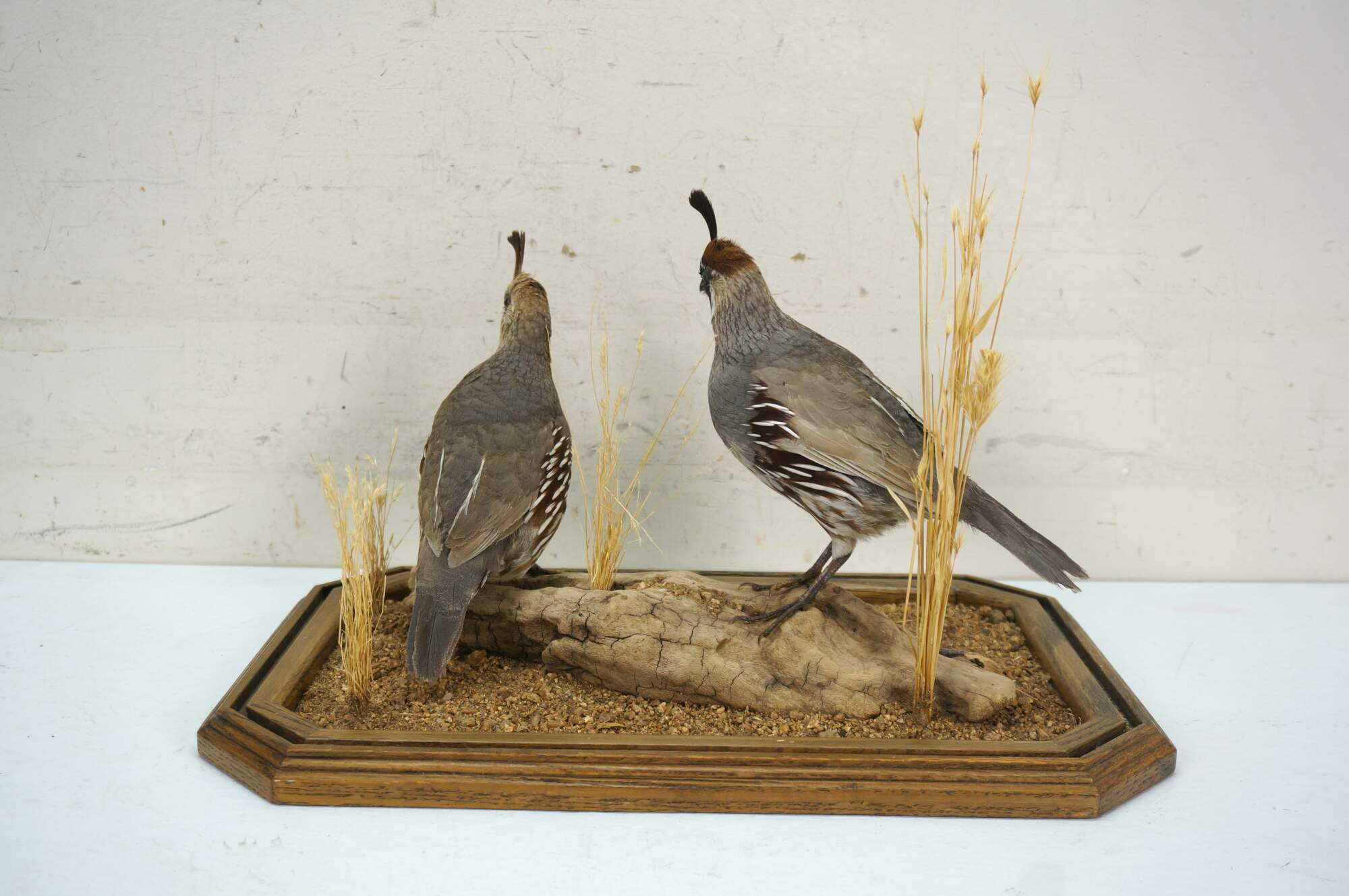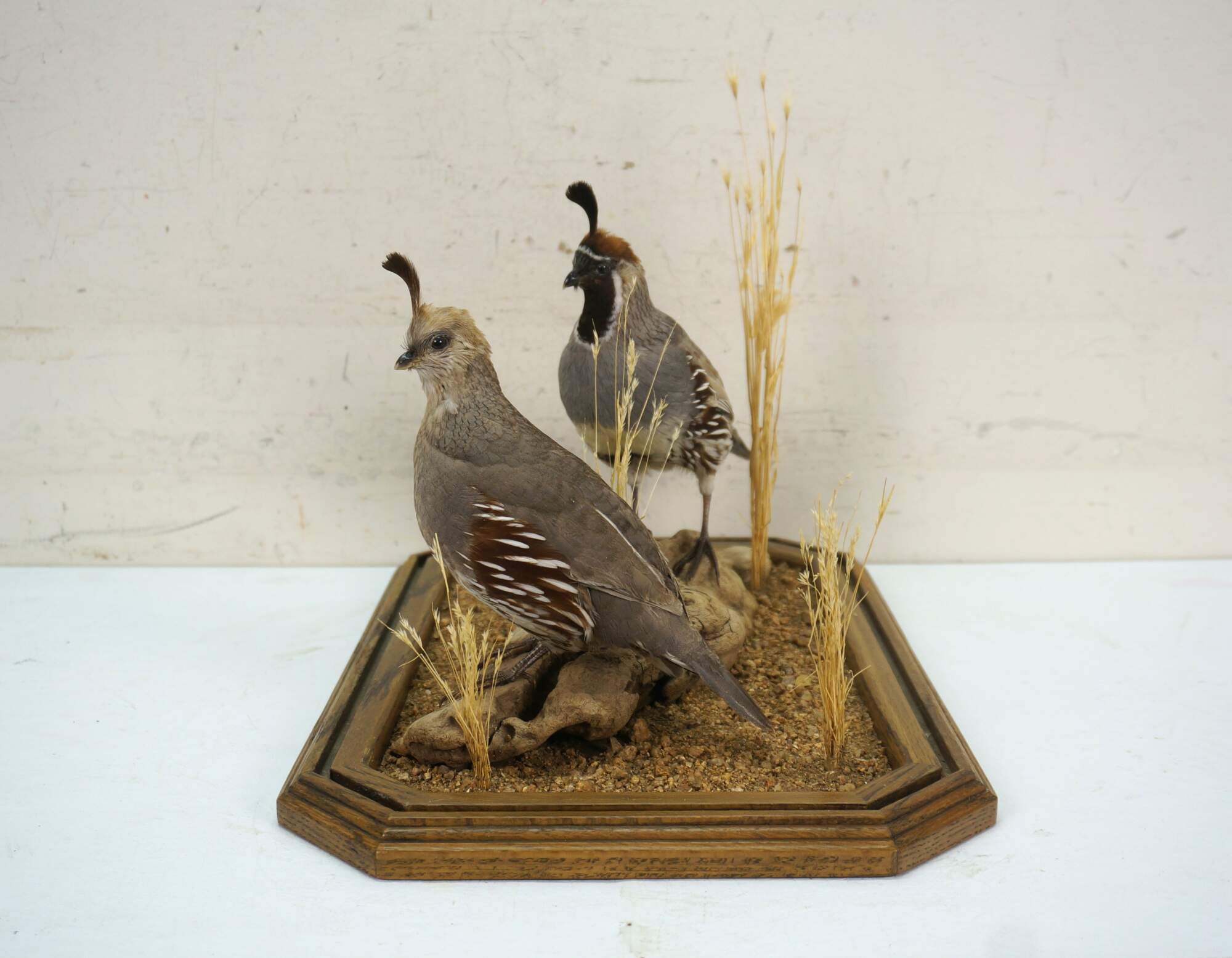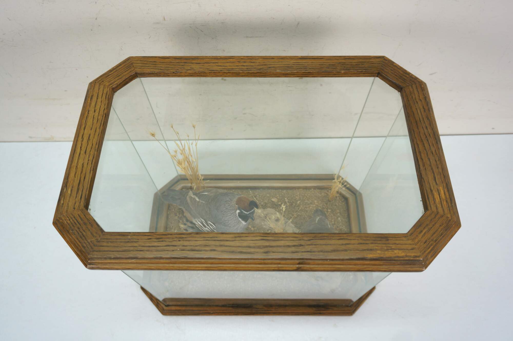 Vintage male and female cased Gambles Quail game bird taxidermy mount in octagonal oak and glass showcase with driftwood and foliage.