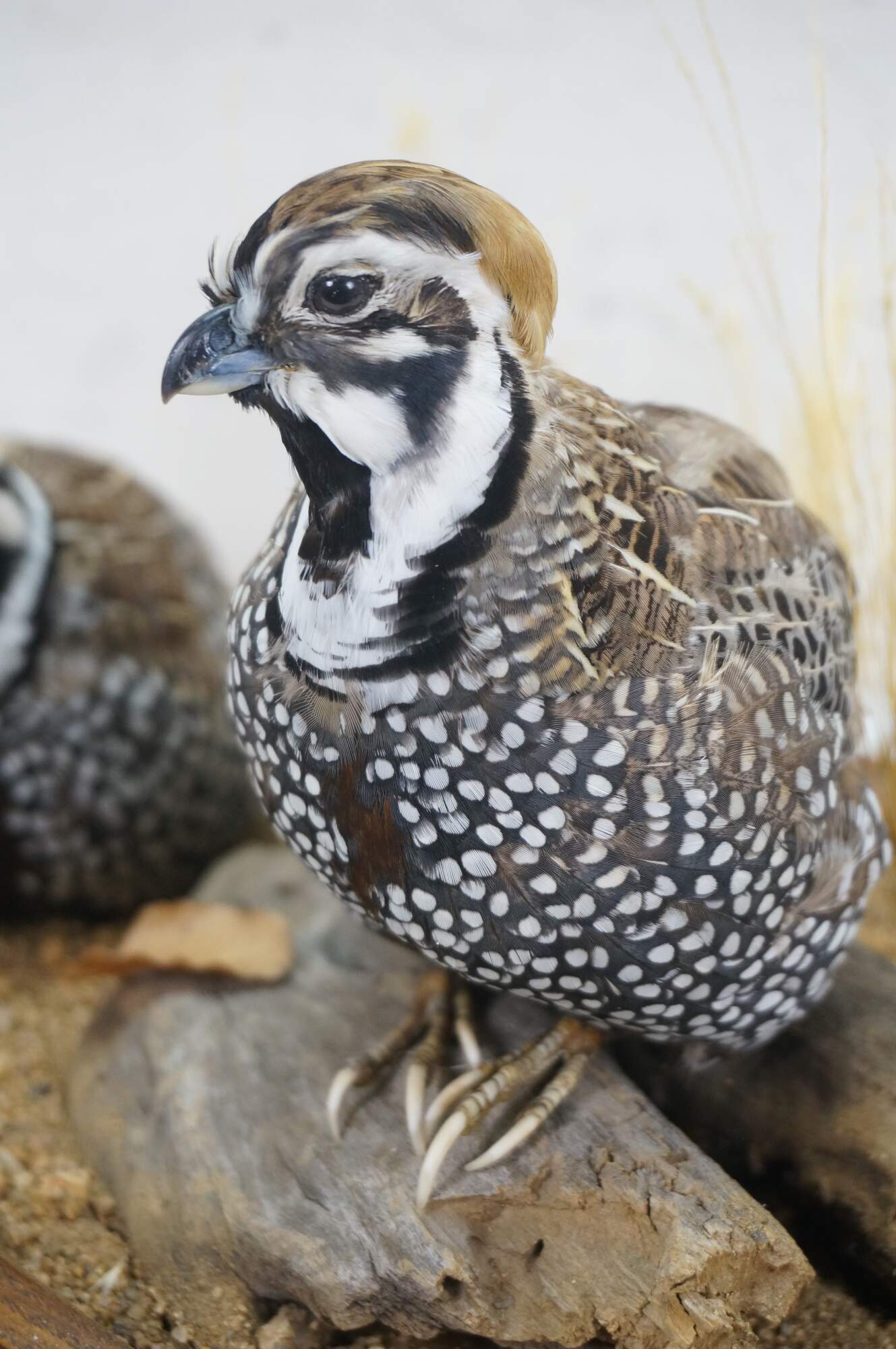 Vintage male and female cased Merns Quail game bird taxidermy mount in octagonal oak and glass showcase with driftwood and foliage.