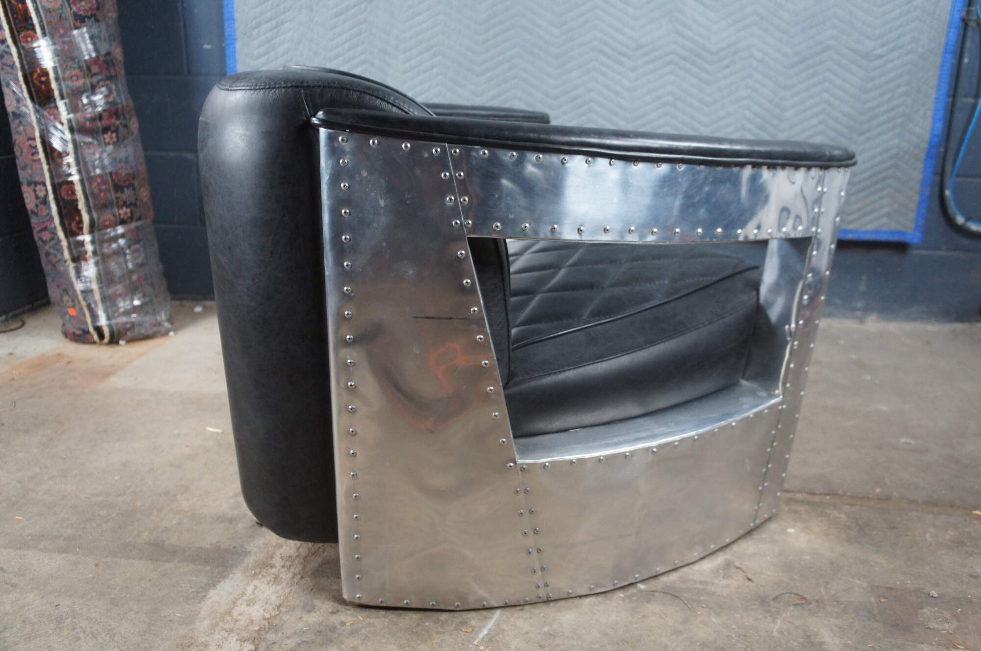 Vintage aviator pilot office / lounge chair featuring black leather diamond stitch upholstery with padded sloped arms and aluminum / chrome body with nailhead trim. Made by Home Meridian International a division of Hooker Furniture.
