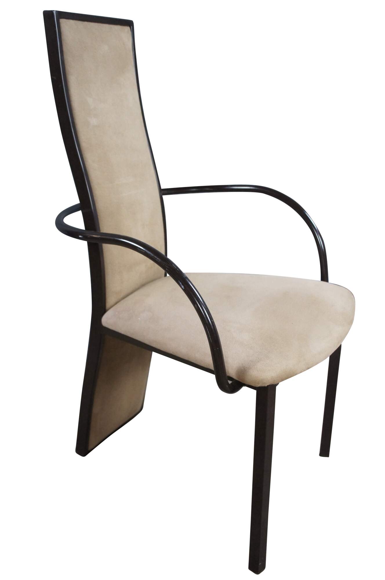 Vintage set of six Italian postmodern dining chairs featuring an abstract metal frame with microsuede upholstery and tubular armchairs.