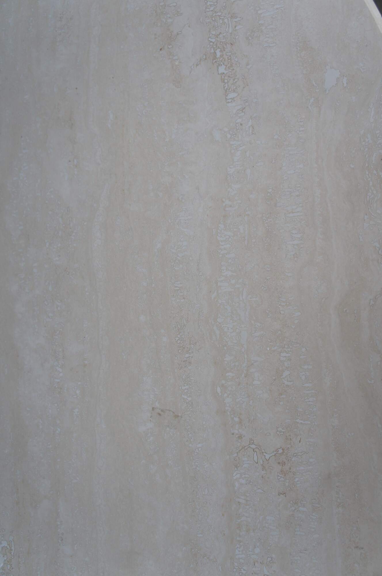 Vintage Henredon Furniture white washed side accent table featuring Louis XVI and neoclassical styling with travertine stone top and tapered fluted legs. Made in Italy circa 1994. 1509138.