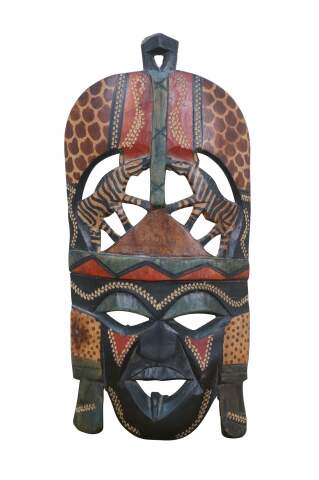 Decorative hand carved African folk art wall hanging mask depicting a human face with elongated ears and a tall highly decorated hat with cut out zebras and giraffe fur pattern. Black with carved details and red and green painted accents. Made in Kenya. Originally purchased at Walt Disney Parks & Resorts.