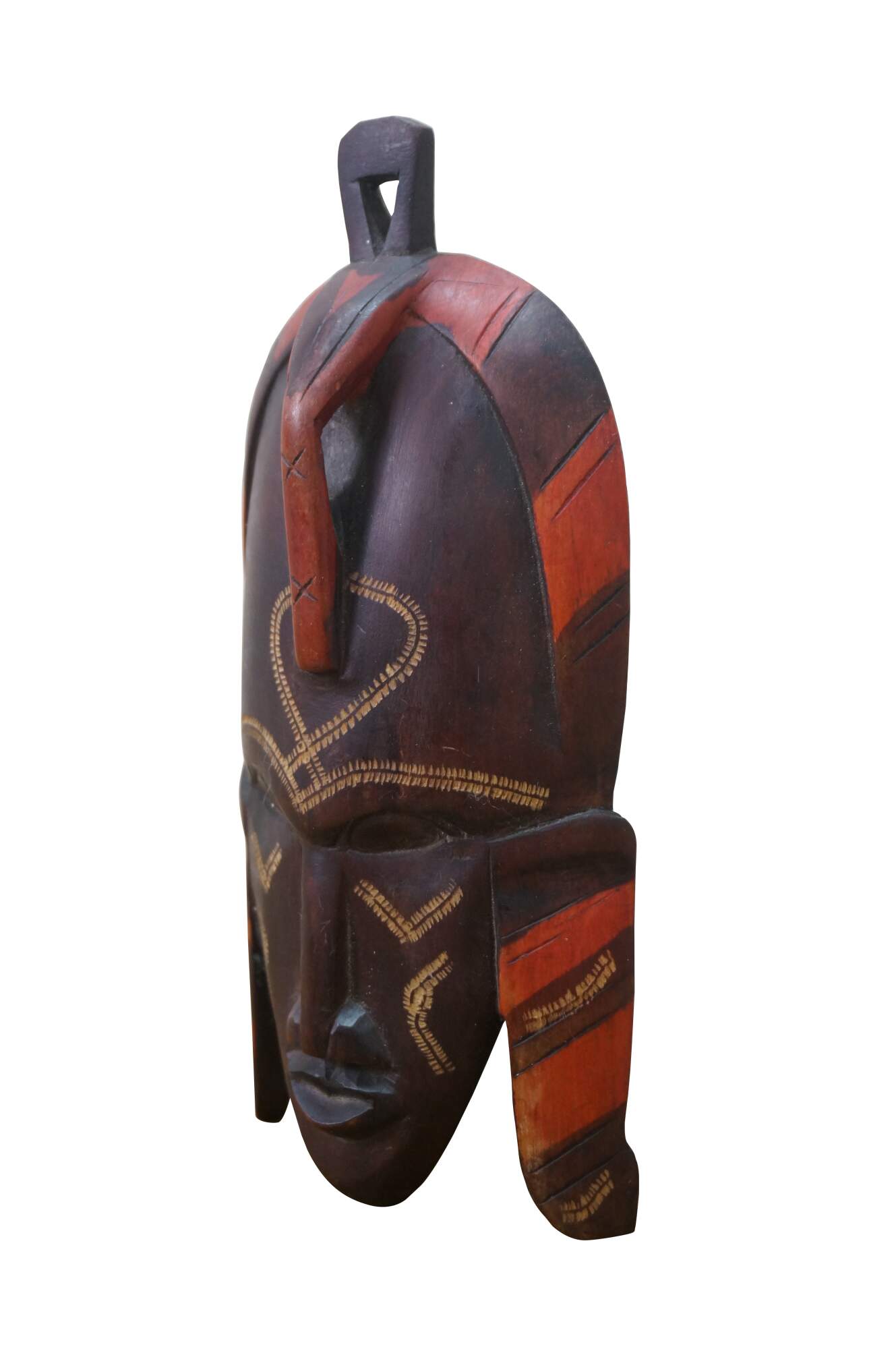 Decorative wall hanging African tribal folk art mask depicting a human face with elongated ears and exaggerated forehead. Brown with carved details and orange accents. Hand Carved. Made in Kenya. Originally purchased at Walt Disney World.