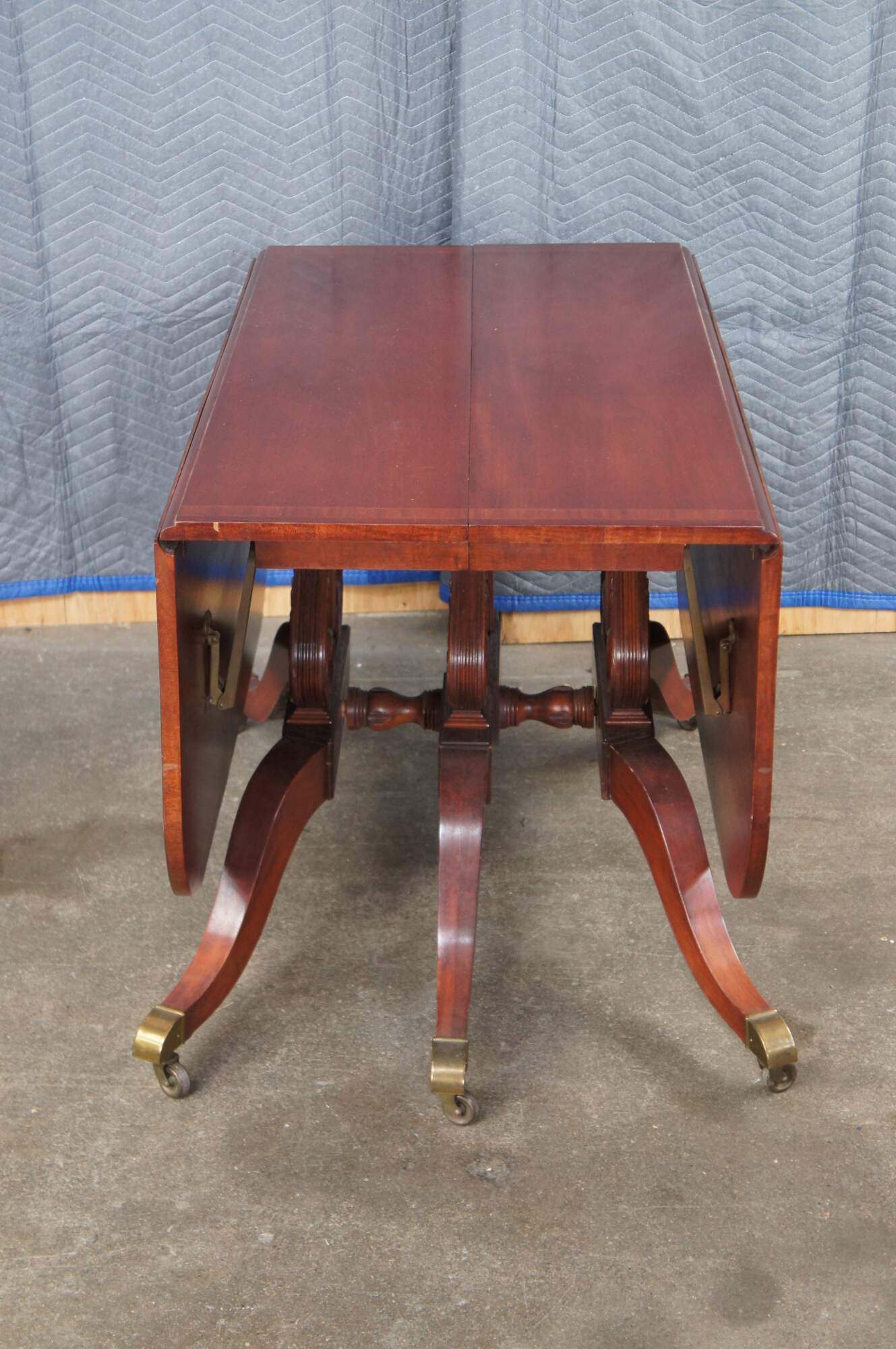 Mid-20th Century Union National Duncan Phyfe Style Drop Leaf Extendable Dining Table. Made from American mahogany with a banded top. Features a harp or lyre carved pedestal base leading to six downswept legs with brass capped feet and castors. This beautiful table will be the center of attention in any dining or breakfast room. For those with larger spaces it can be stowed away along a wall and used as a console when not in service and rolled into place for large gatherings. Includes three leaves for expansion up to 98.5"