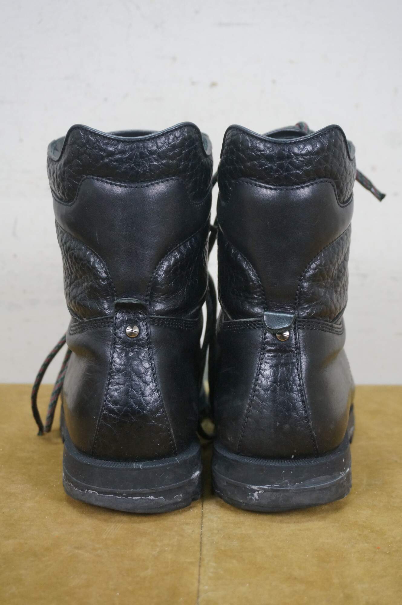 Vintage Gucci men's leather hiking / biker / combat boots. Black with pebbled peather accents. Lace-up closure with embroidered tongue. Black lug sole. 181853. Made in Italy. Includes original box, dust bags, and spare laces.