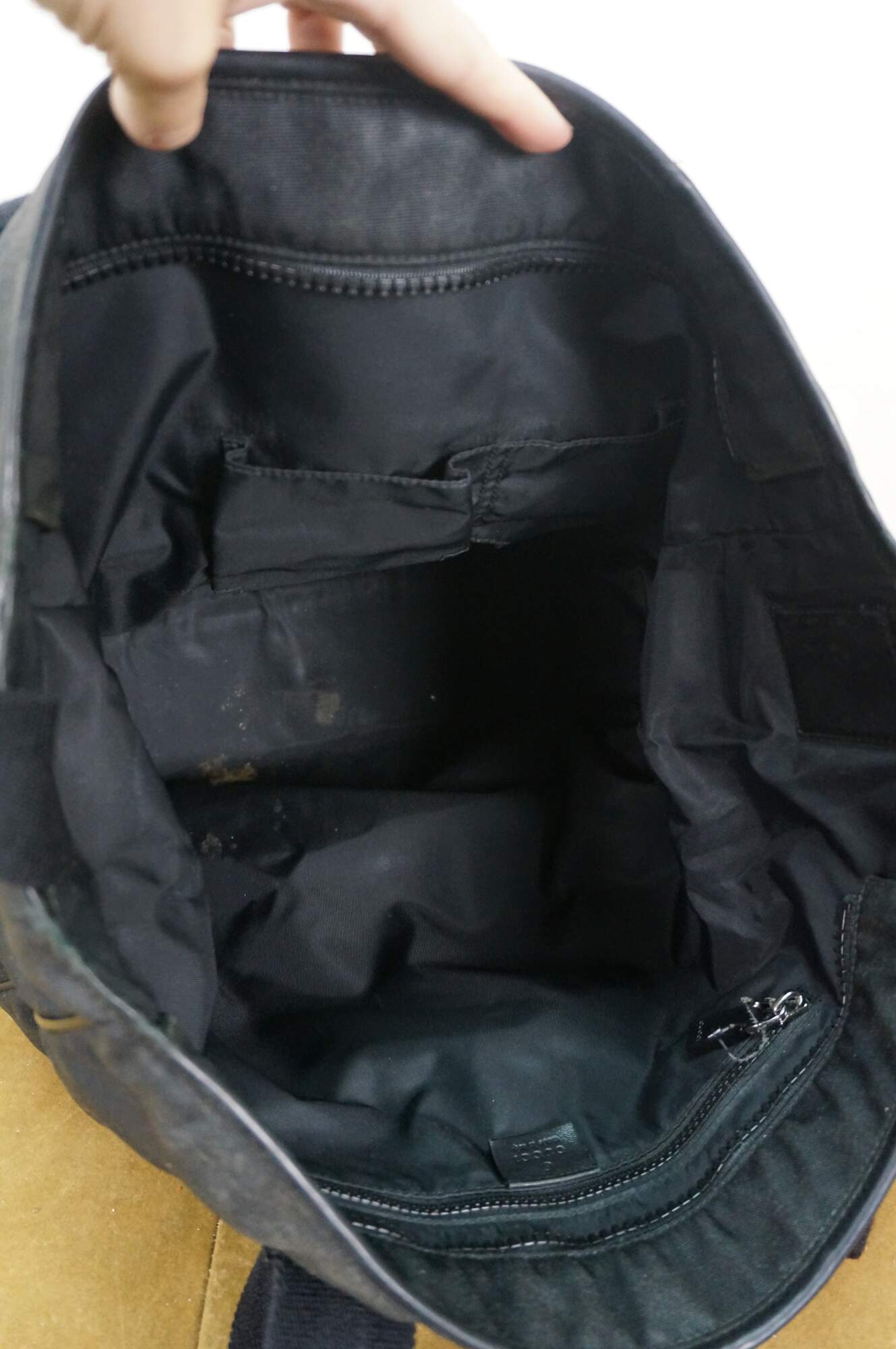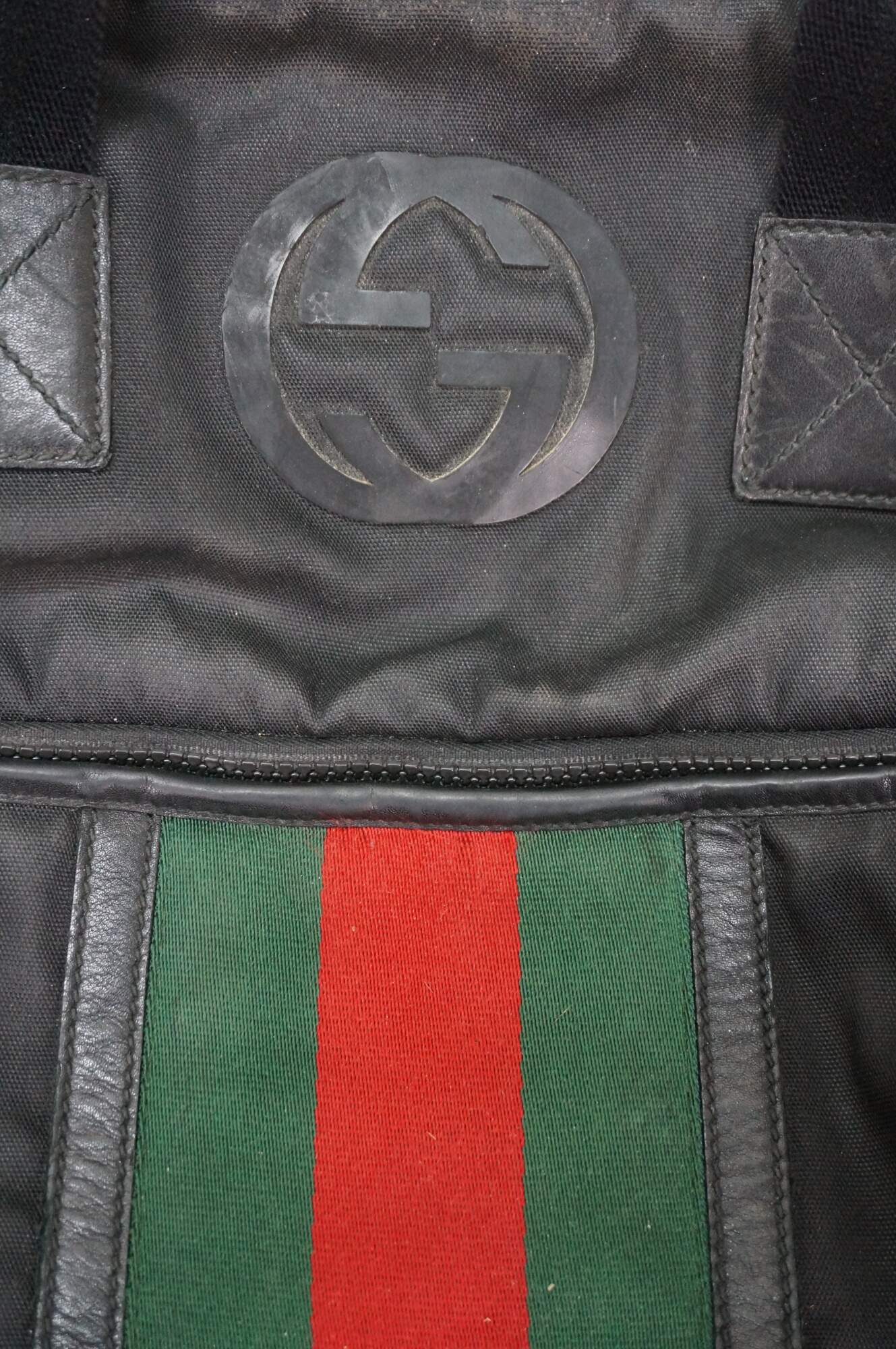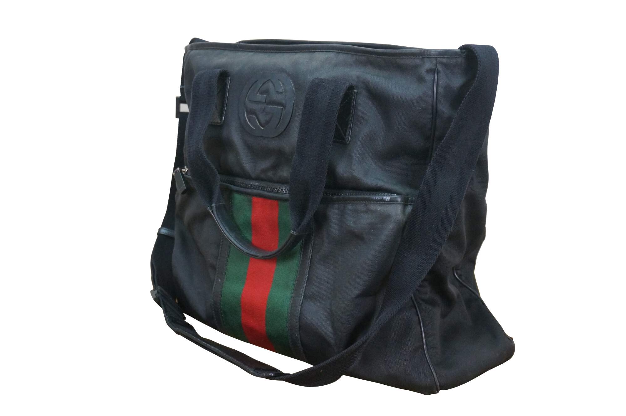Vintage Gucci black nylon tote / shoulder bag with leather trim, interlocking G logo, and red and green web detail on front. Adjustable shoulder strap; two top handles. One zippered exterior pocket. Top zipper closure. One interior zippered pocket and two interior slip pockets. Inside tag stamped 181063 / 204046.