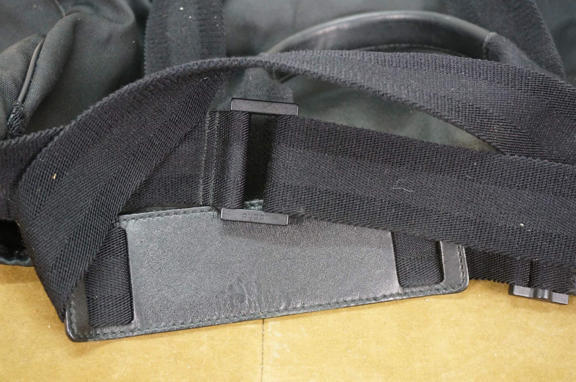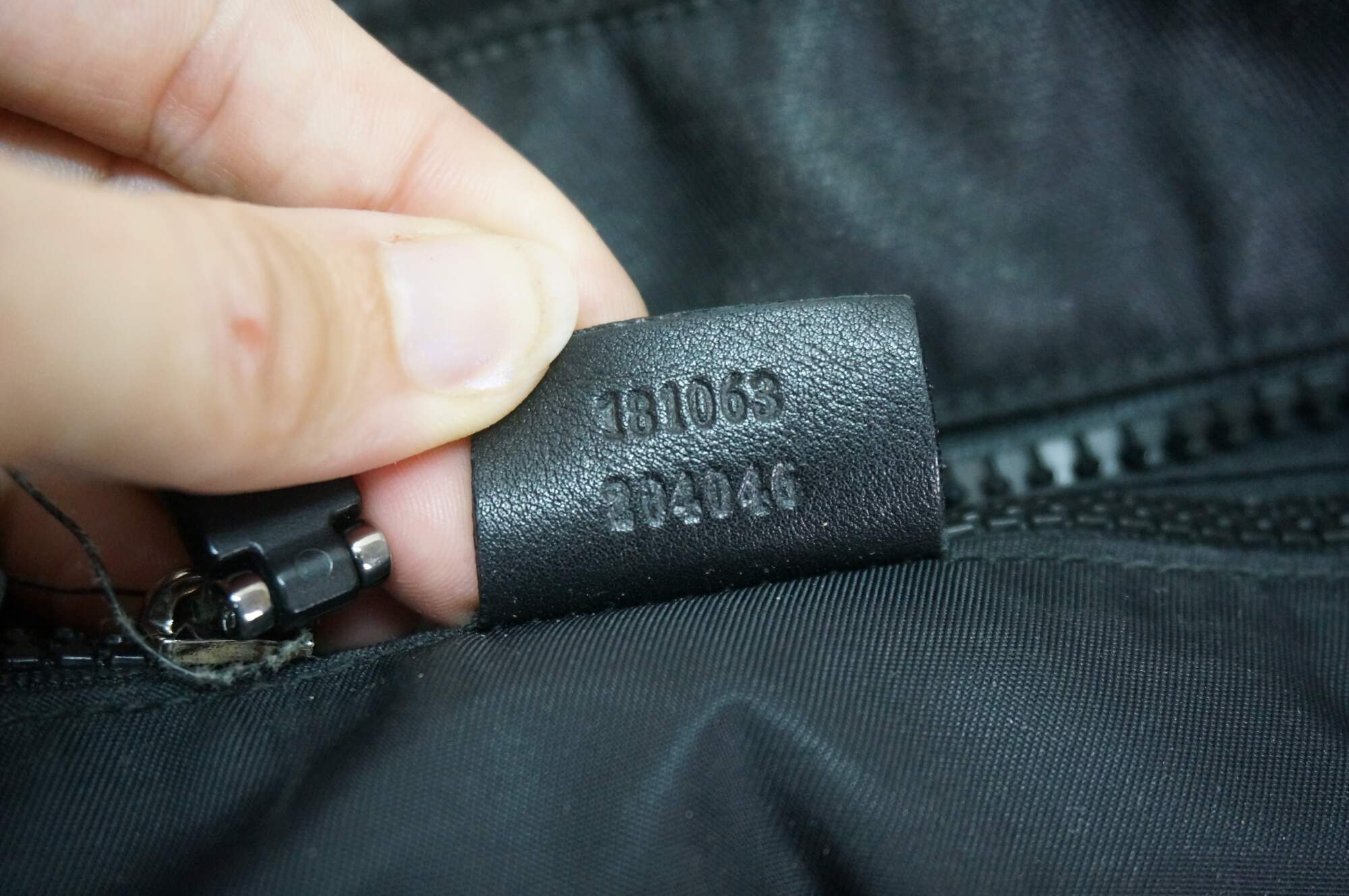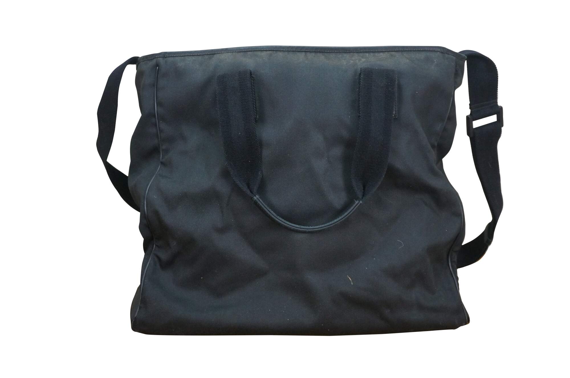 Vintage Gucci black nylon tote / shoulder bag with leather trim, interlocking G logo, and red and green web detail on front. Adjustable shoulder strap; two top handles. One zippered exterior pocket. Top zipper closure. One interior zippered pocket and two interior slip pockets. Inside tag stamped 181063 / 204046.