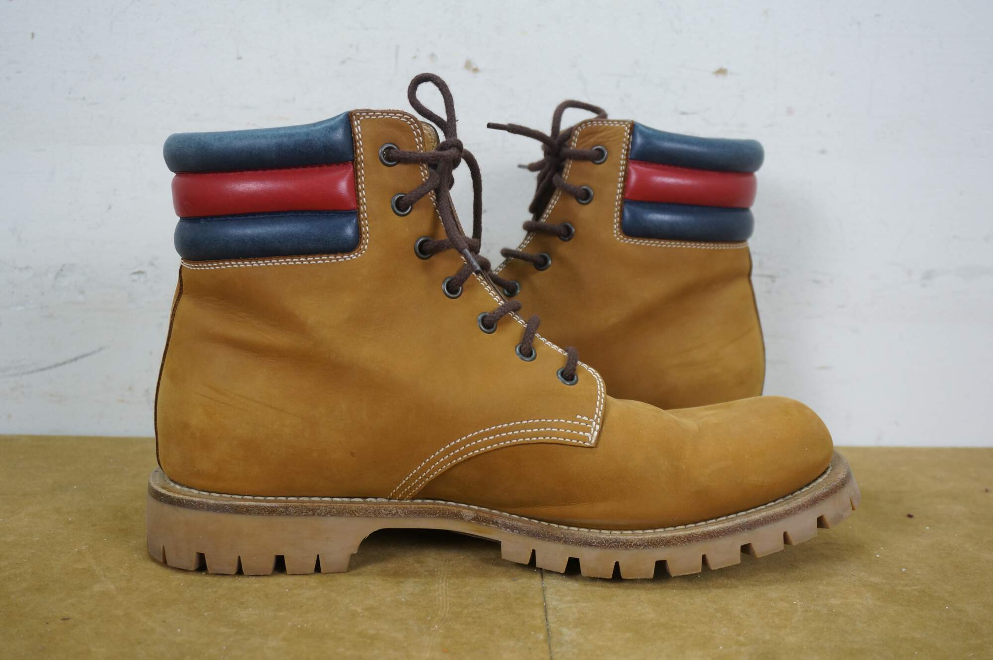 Vintage Gucci Marland plain toe hiking / combat boot. Brown suede leather with navy blue and red accents. Eugene/N. Pantoufle/N. Pantoufle. Cuir/Blu/Rosso. Lace-up closure. Black lug sole. 429220AIXN0. Made in Italy. Originally purchased at Saks Fifth Avenue. Includes original box and dust bags. MSRP $830.