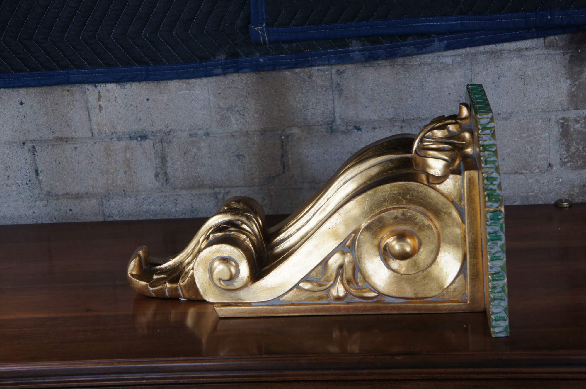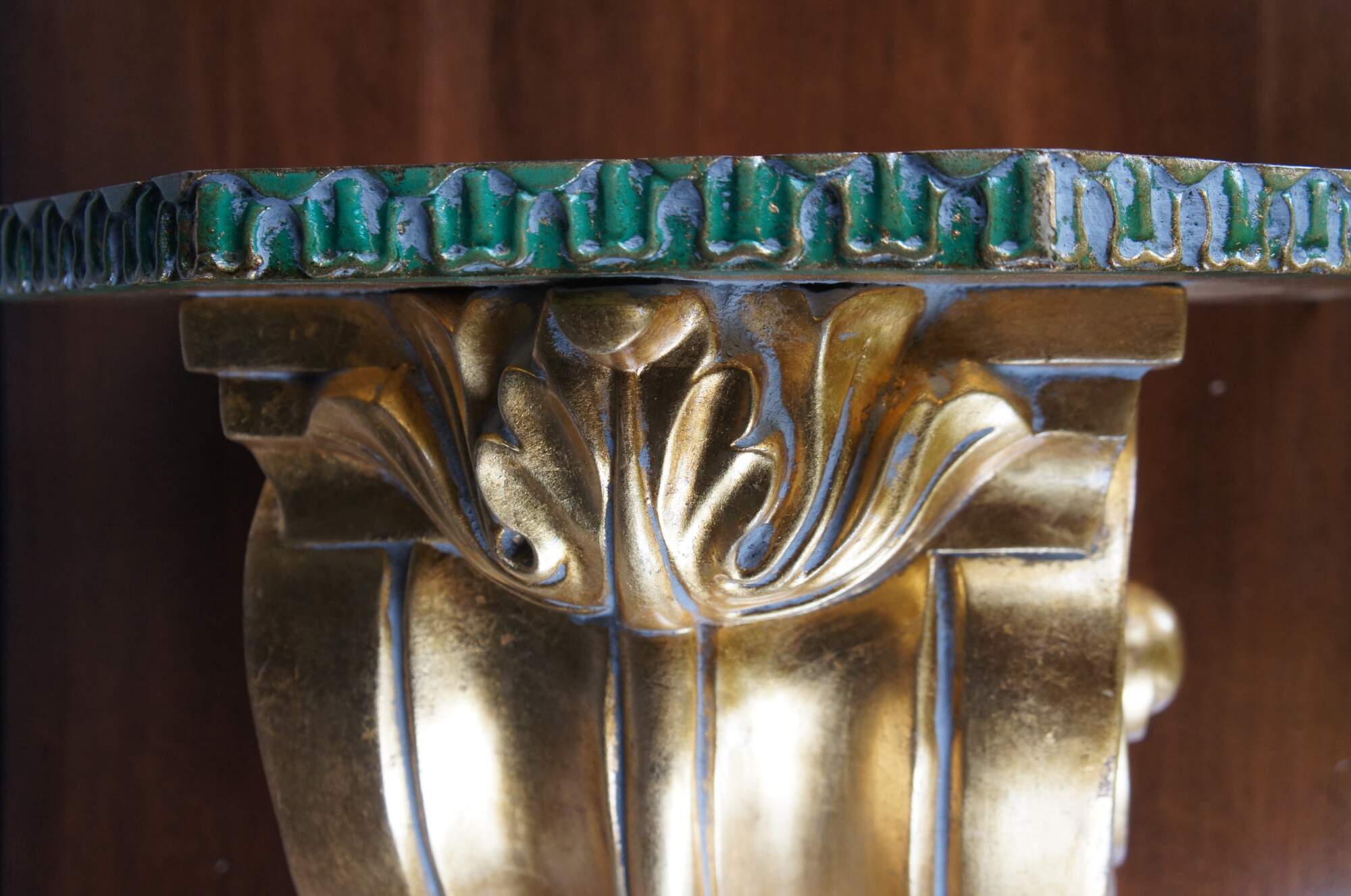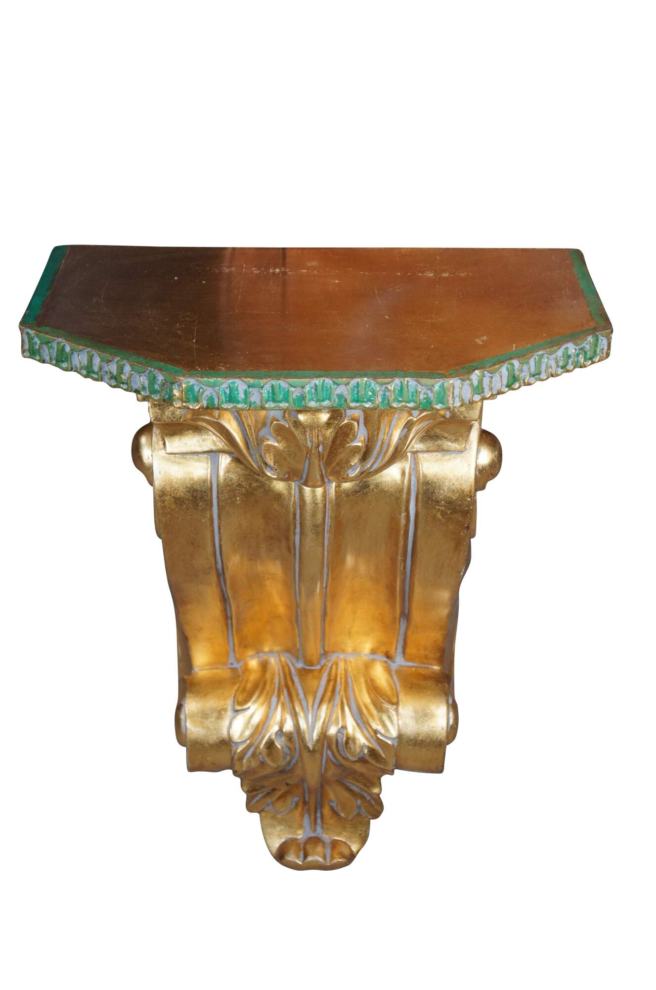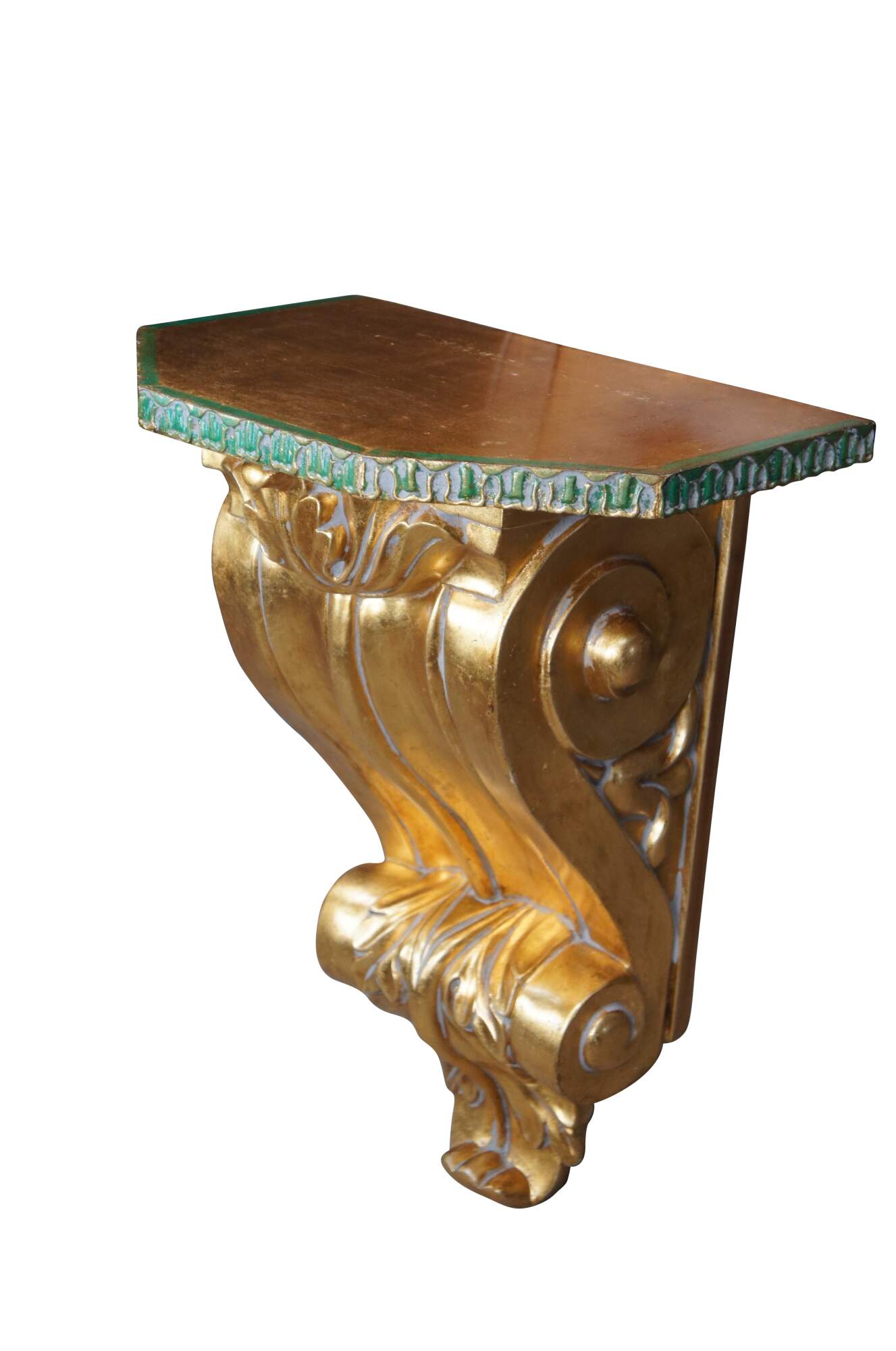 Early 21st century Baroque Style gold leaf designed gilt composite wall bracket / sconce / shelf, featuring a scrolled design accented with acanthus leaves and a pentagonal / clipped corner top edged in green.