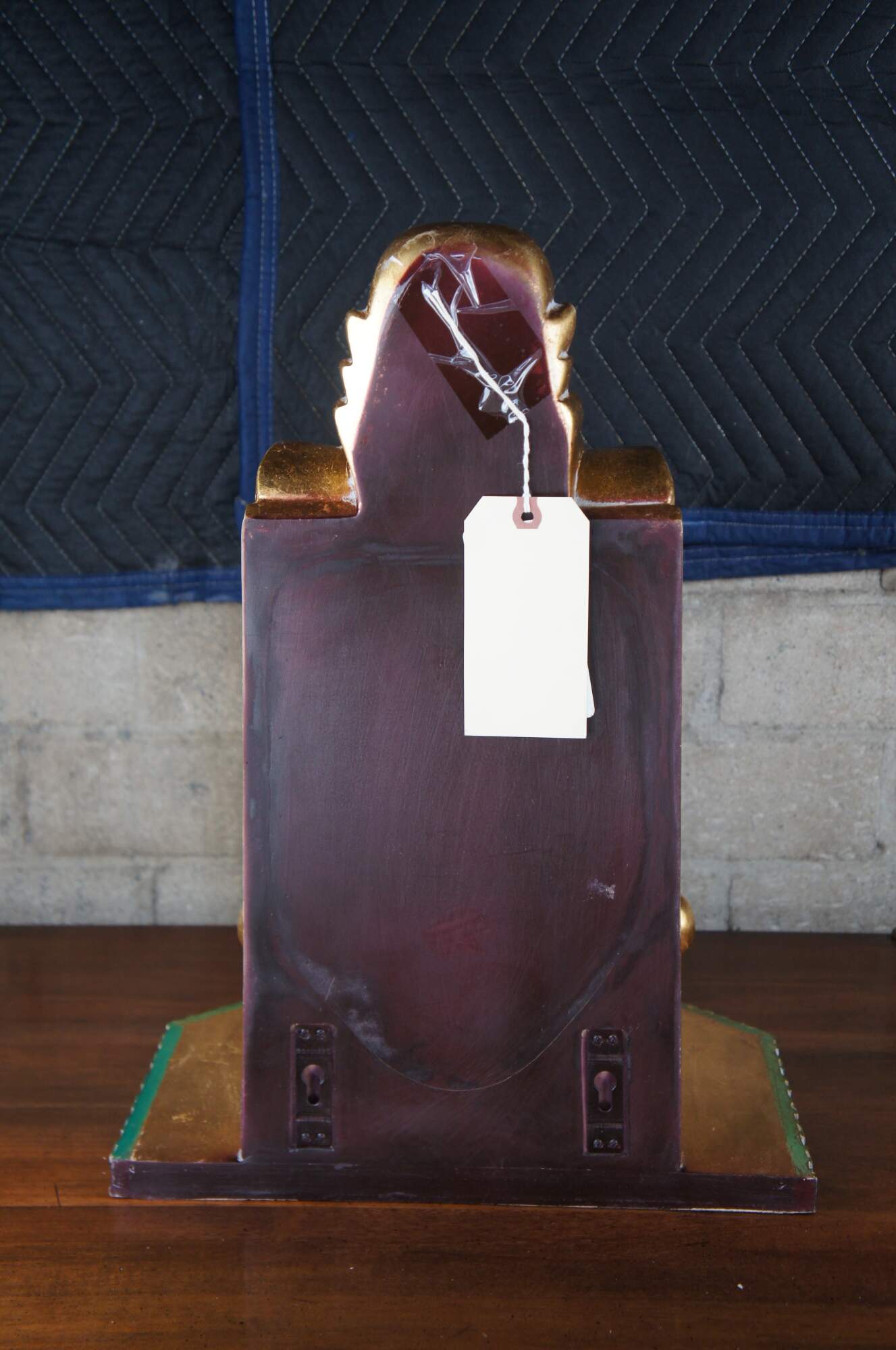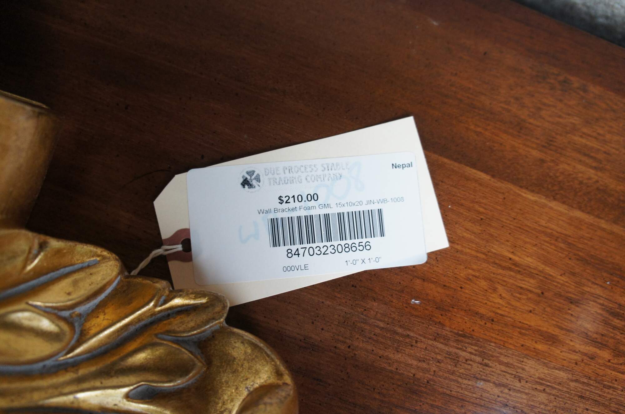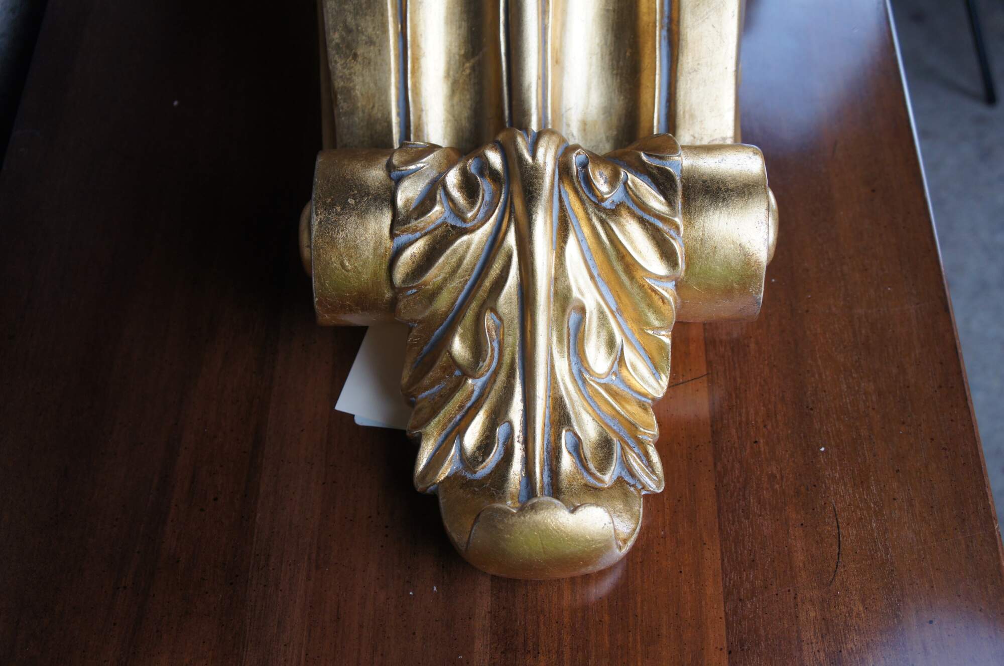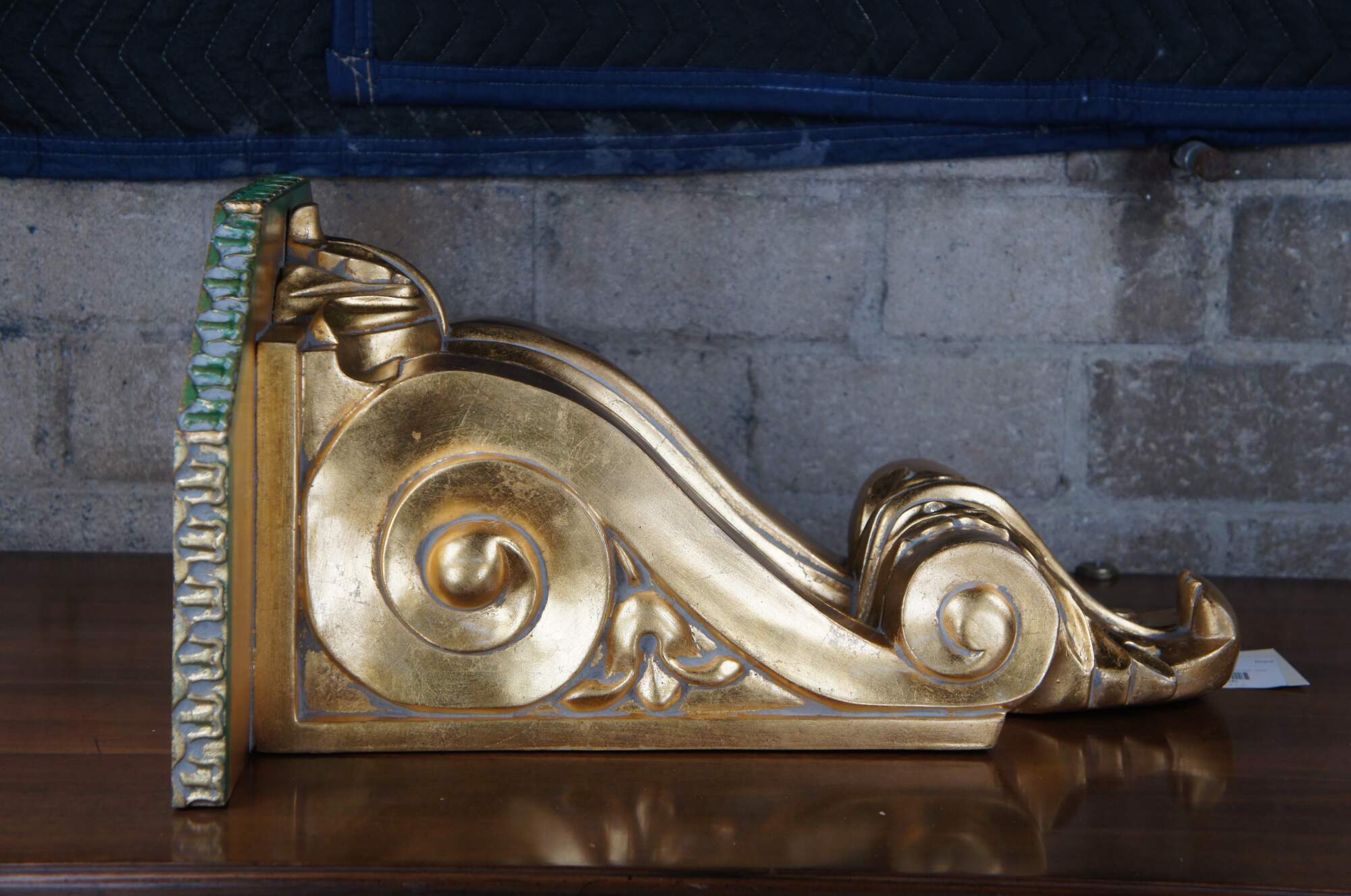 Early 21st century Baroque Style gold leaf designed gilt composite wall bracket / sconce / shelf, featuring a scrolled design accented with acanthus leaves and a pentagonal / clipped corner top edged in green.