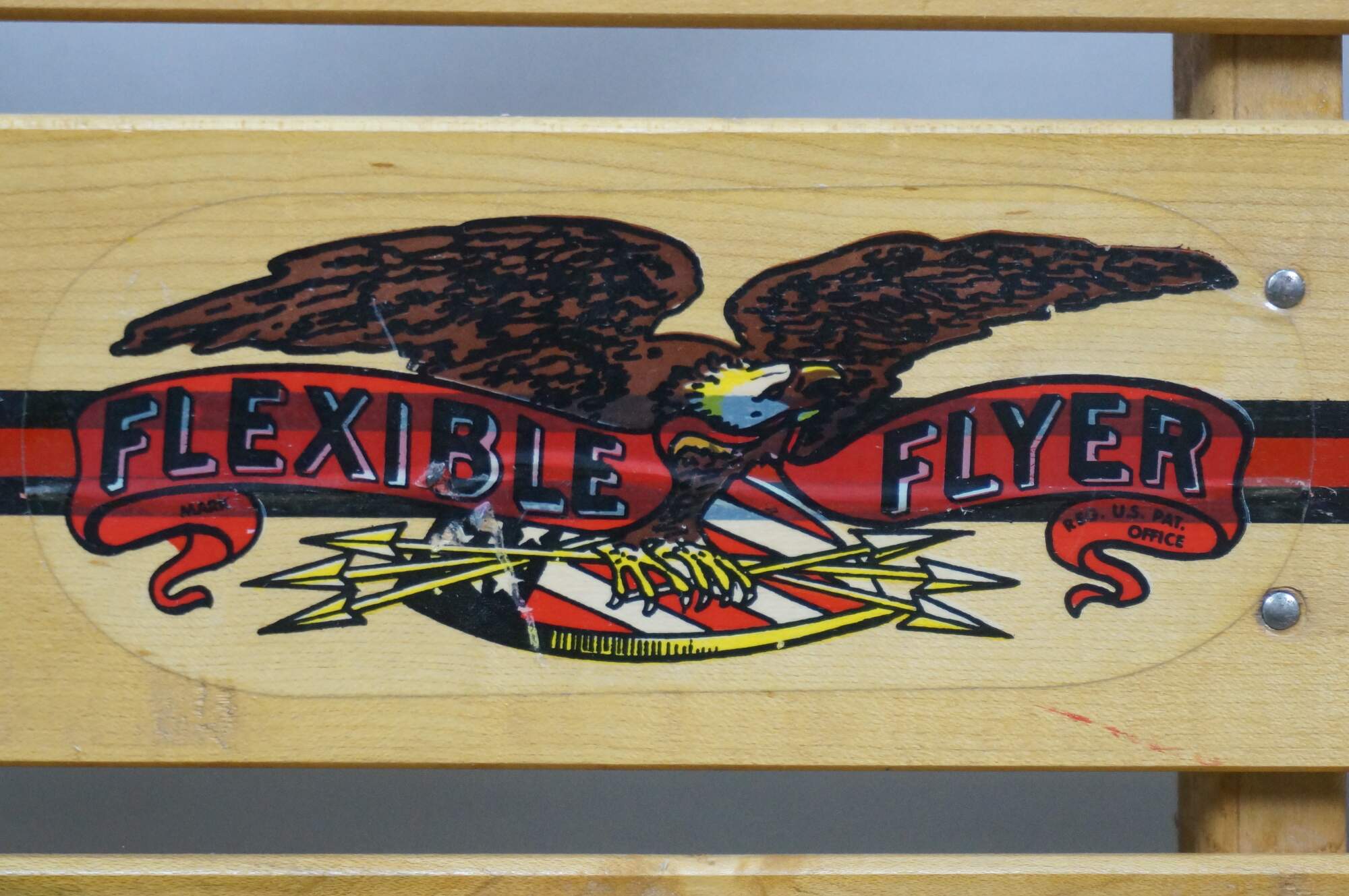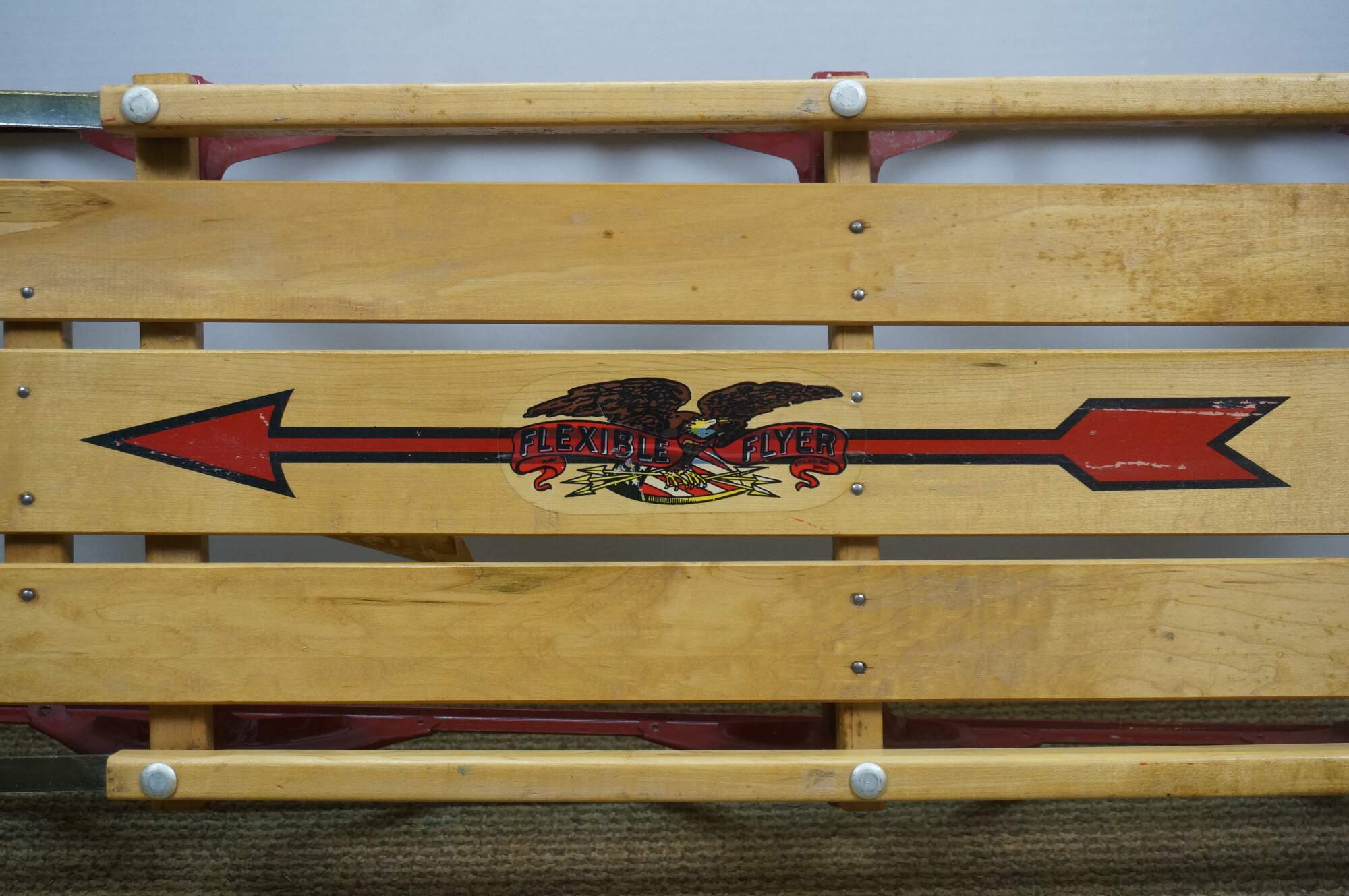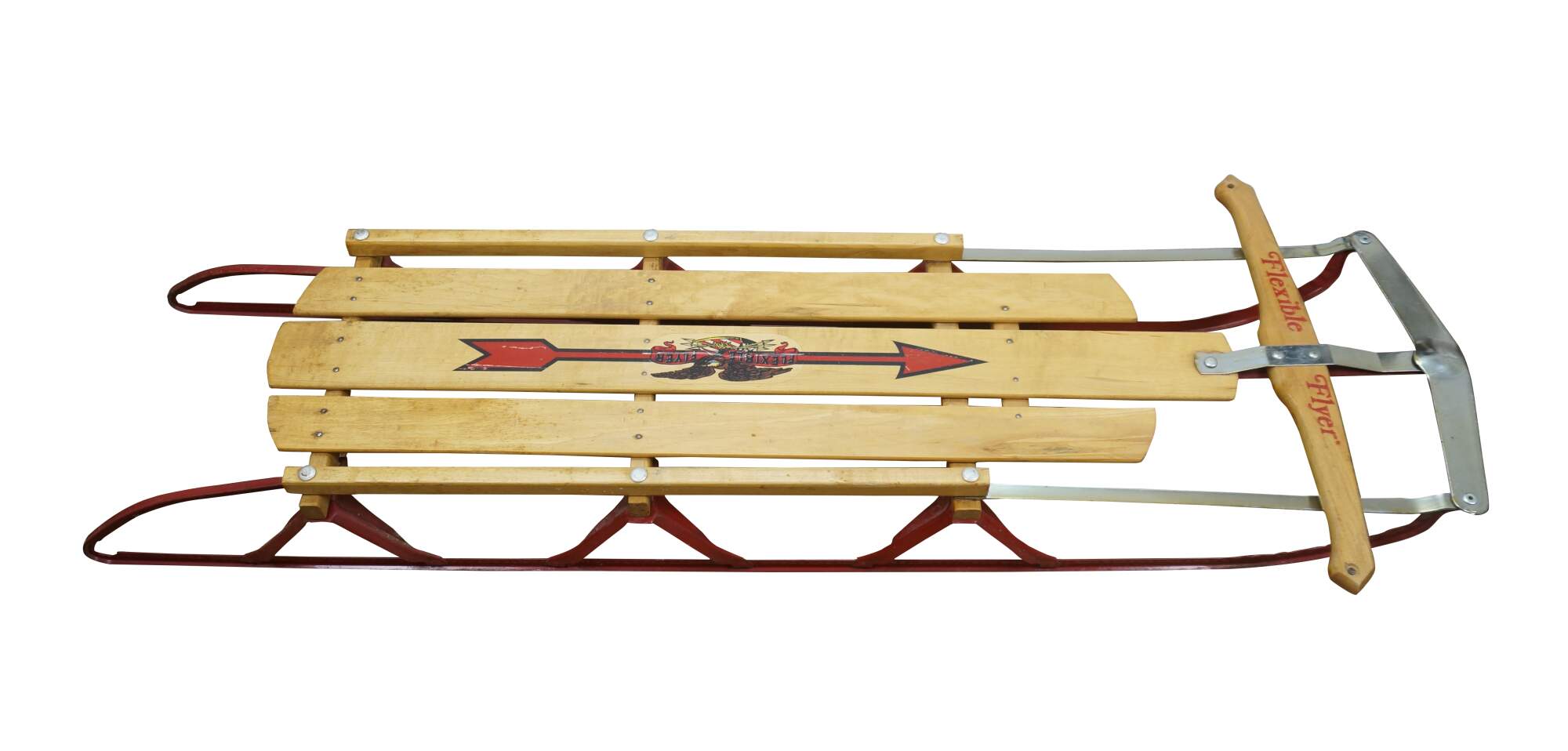 "Flexible Flyer is a toy and recreational equipment brand, best known for the sled of the same name, a steerable wooden sled with steel runners. Flexible Flyers are flexible both in design and usage. Riders may sit upright on the sled or lie on their stomachs, allowing the possibility to descend a snowy slope feet-first or head-first. To steer the sled, riders may either push on the wooden cross piece with their hands or feet, or pull on the rope attached to the wooden cross-piece. Shifting the cross-piece one way or the other causes the flexible rails to bend, turning the sled. Samuel Leeds Allen patented the Flexible Flyer in 1889 in Cinnaminson, New Jersey, using local children and adults to test prototypes. Allen's company flourished by selling these speedy and yet controllable sleds at a time when others were still producing toboggans and "gooseneck" sleds. Allen began producing sleds in his farm equipment factory to keep his workers busy even when it was not the farm season. He developed many prototypes before he created the Flexible Flyer. The sleds did not sell well until he began marketing them to the toy departments of department stores. In 1915, around 120,000 Flexible Fliers were sold, and almost 2,000 Flexible Flyers were sold in one day. In 1968, Leisure Group of Los Angeles, California, bought the S. L. Allen Company. Leisure Group continued to produce Flexible Flyers in Medina, Ohio. In 1973, a group of private investors bought Leisure Group's toy division and started manufacturing the sleds under the name "Blazon Flexible Flyer" in West Point, Mississippi. In 1993, Roadmaster purchased the rights to production and moved production to Olney, Illinois, and in 1998, production was moved to China. As of 2012, Flexible Flyers are mostly made in China, and some are made in South Paris, Maine, by Paricon, Inc." (Source: Wikipedia)