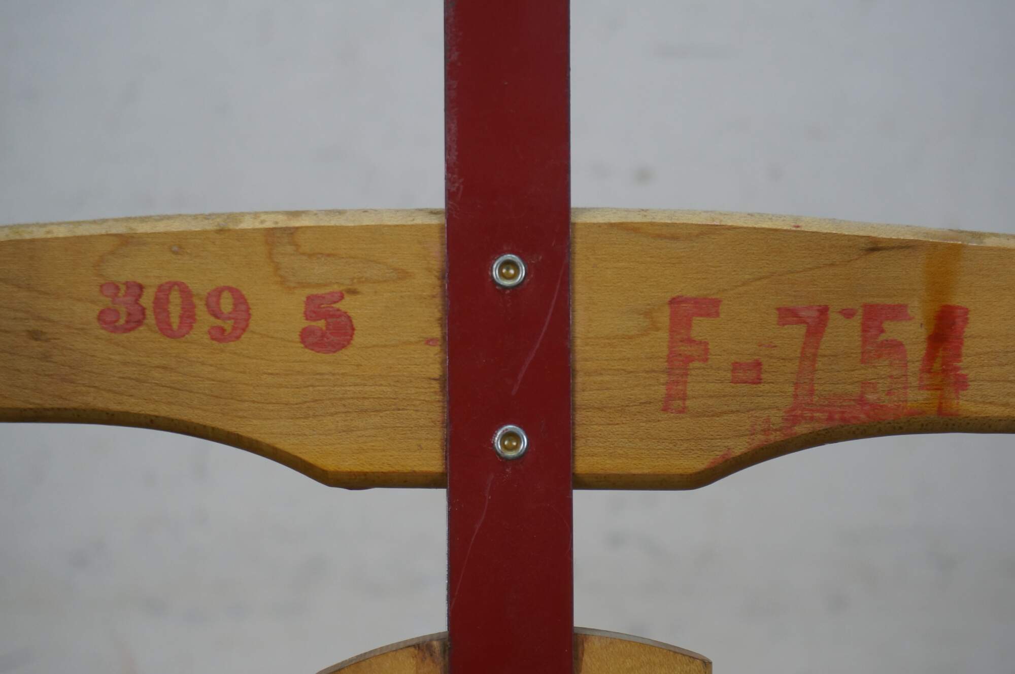 Circa 1970's Blazon Flexible Flyer winter sled. Crafted of wood slats with red-painted iron runners. Marked on reverse 309 5 / F-754. Blazon Flexible Flyer, Inc., West Point, MS.
