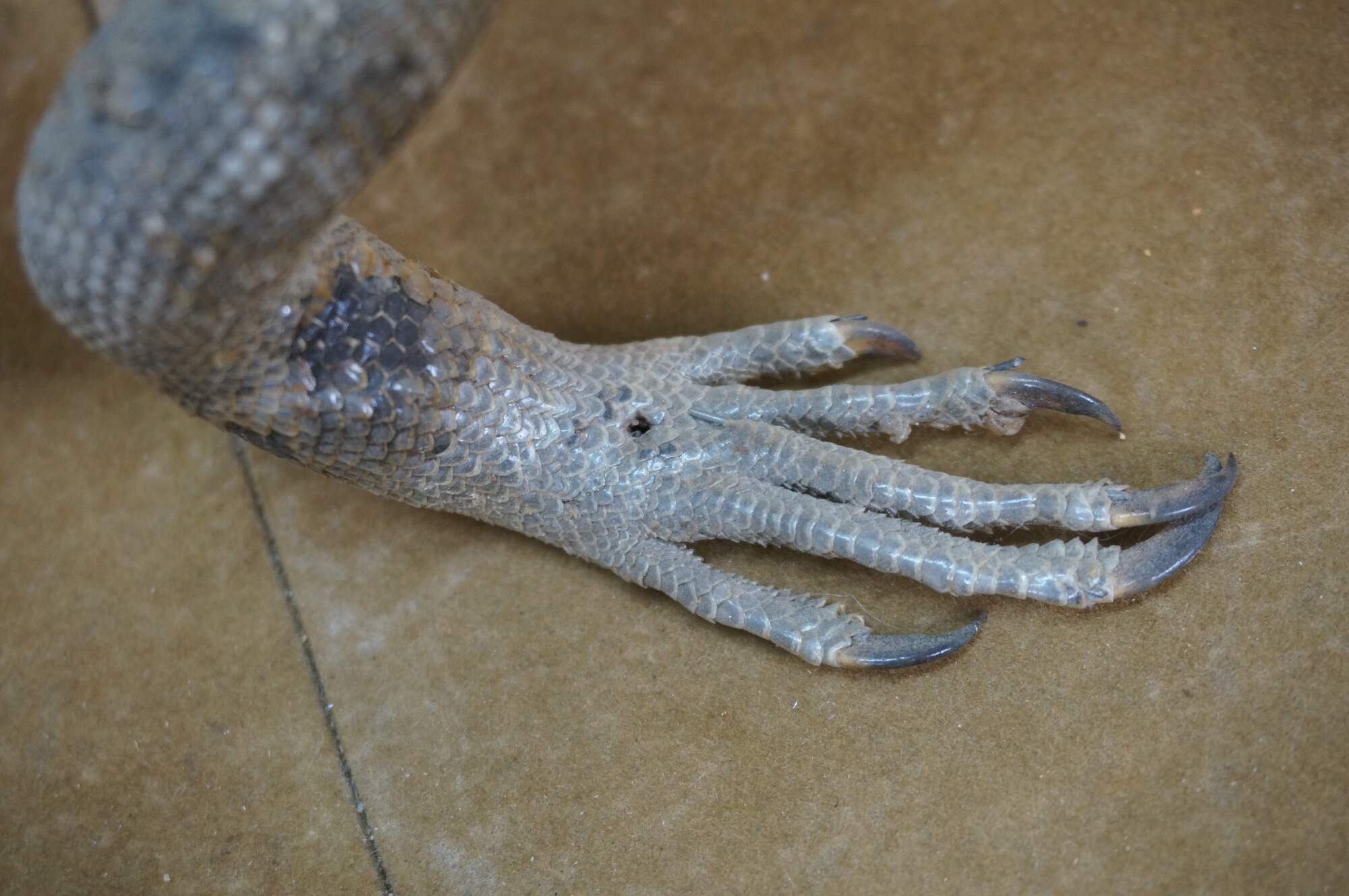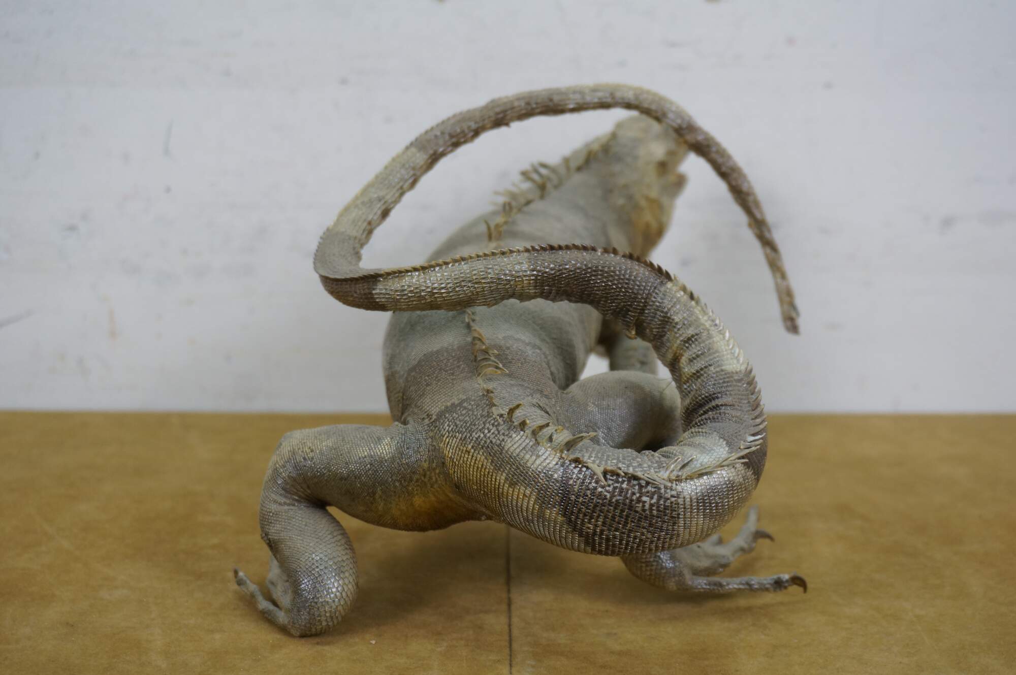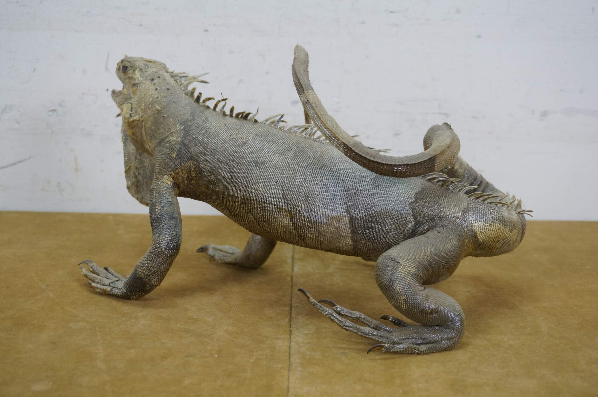 Vintage 20th century taxidermied gray iguana / lizard, posed in a standing position with mouth slightly open and tail curled over the back and side.
