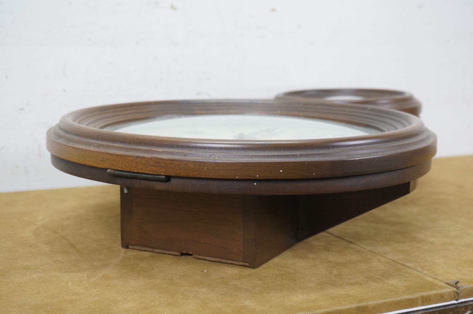 Mid 20th century Howard Miller 8 day, key wound, calendar wall clock, Model 644. Figure eight walnut case with carved details. Brass pendulum. Black speckled white face with black Roman numerals, Arabic numerals for date, and hands (missing date hand). UW 21/21 / Howard Miller Clock Company / No (0) Jewels / Zeeland, Michigan / Unadjusted / Made in Germany.
