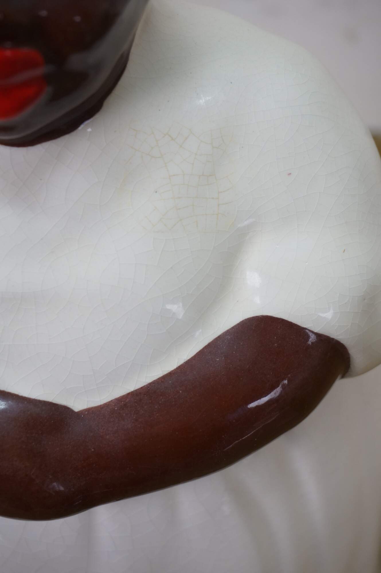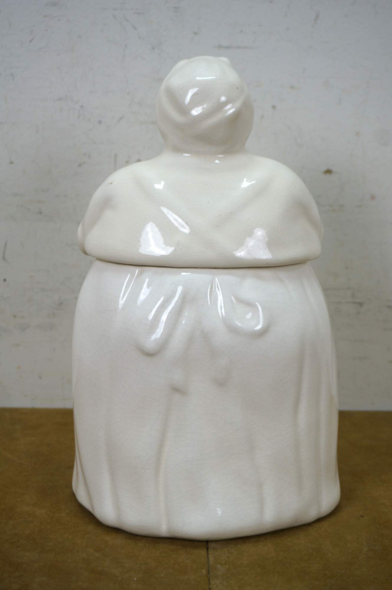 Circa 1940s porcelain "mammy" / "Aunt Jemima" cookie jar attributed to McCoy Pottery. White dress, apron, and kerchief with painted features.