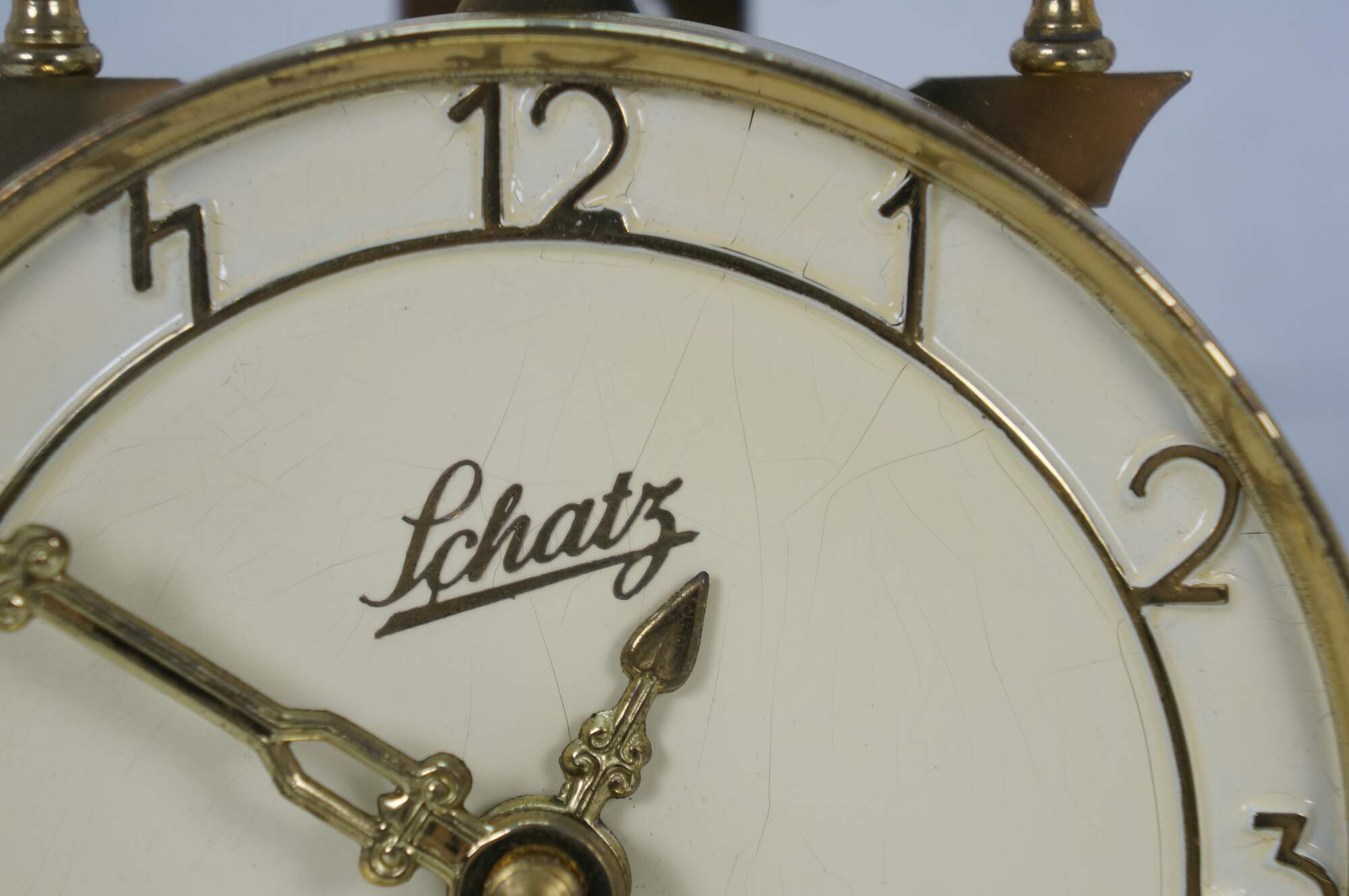 Vintage 1953 400 day Schatz anniversary clock. Brass clock with metallic painted plastic base, cased in a glass bell jar. Off white round face over two plain columns, with gilt Arabic numerals and hands. Movement marked: RR - No (0) Jewels Unadjusted - 3 - 53 - Jahresuhrenfabrik 49 Germany. Two leveling feet on base. Made in Germany.
