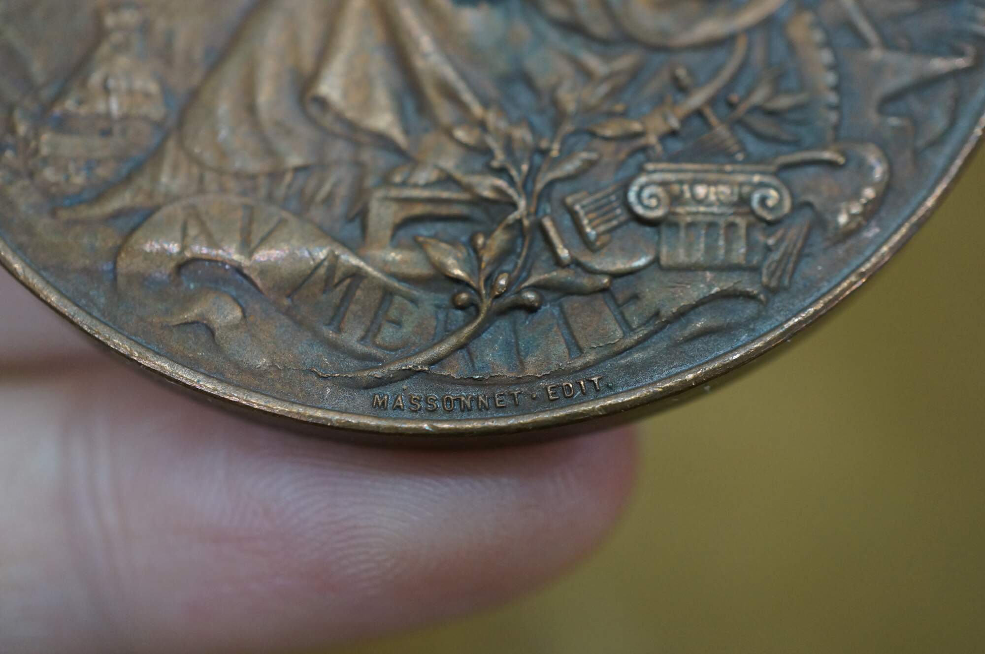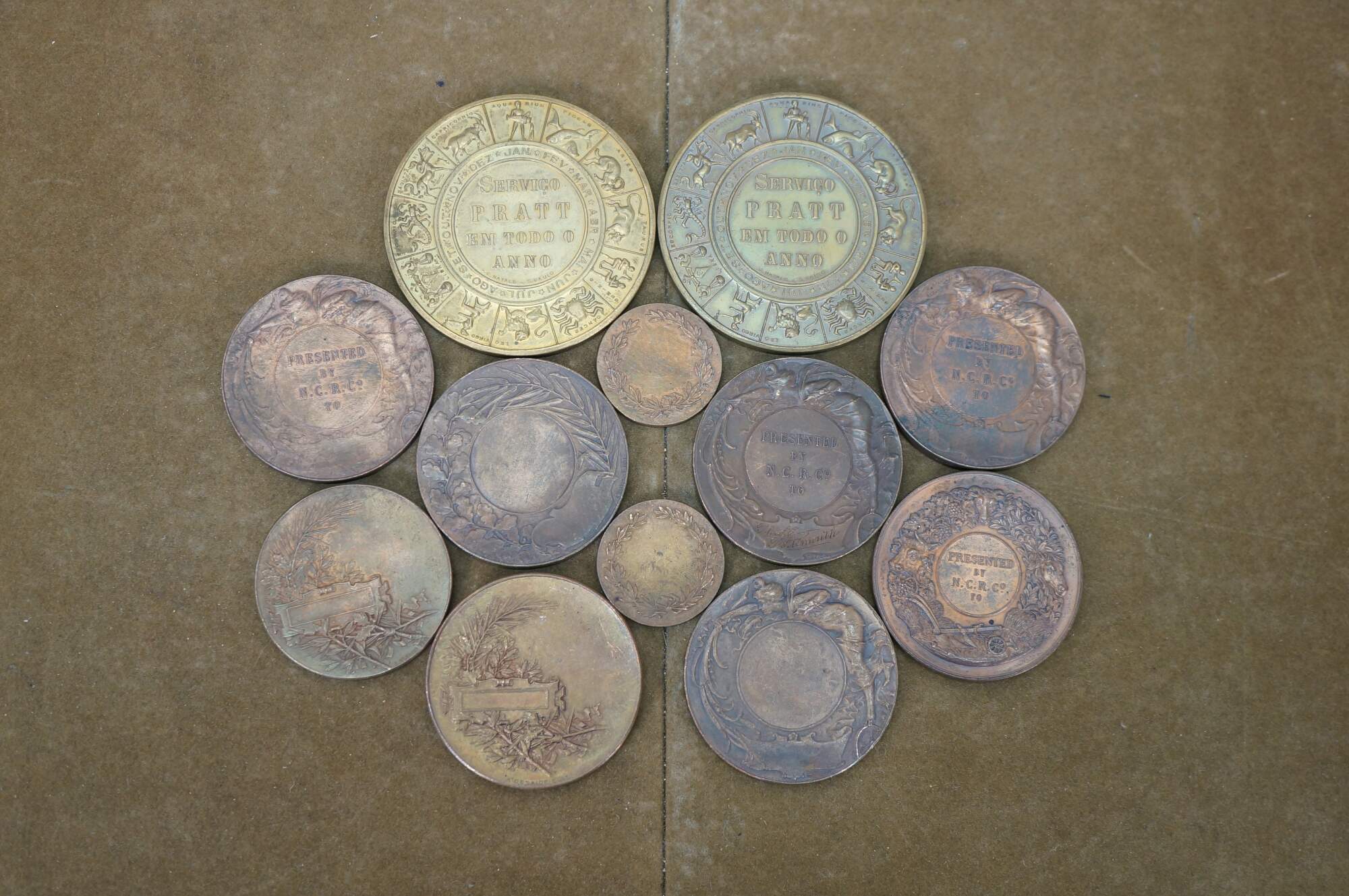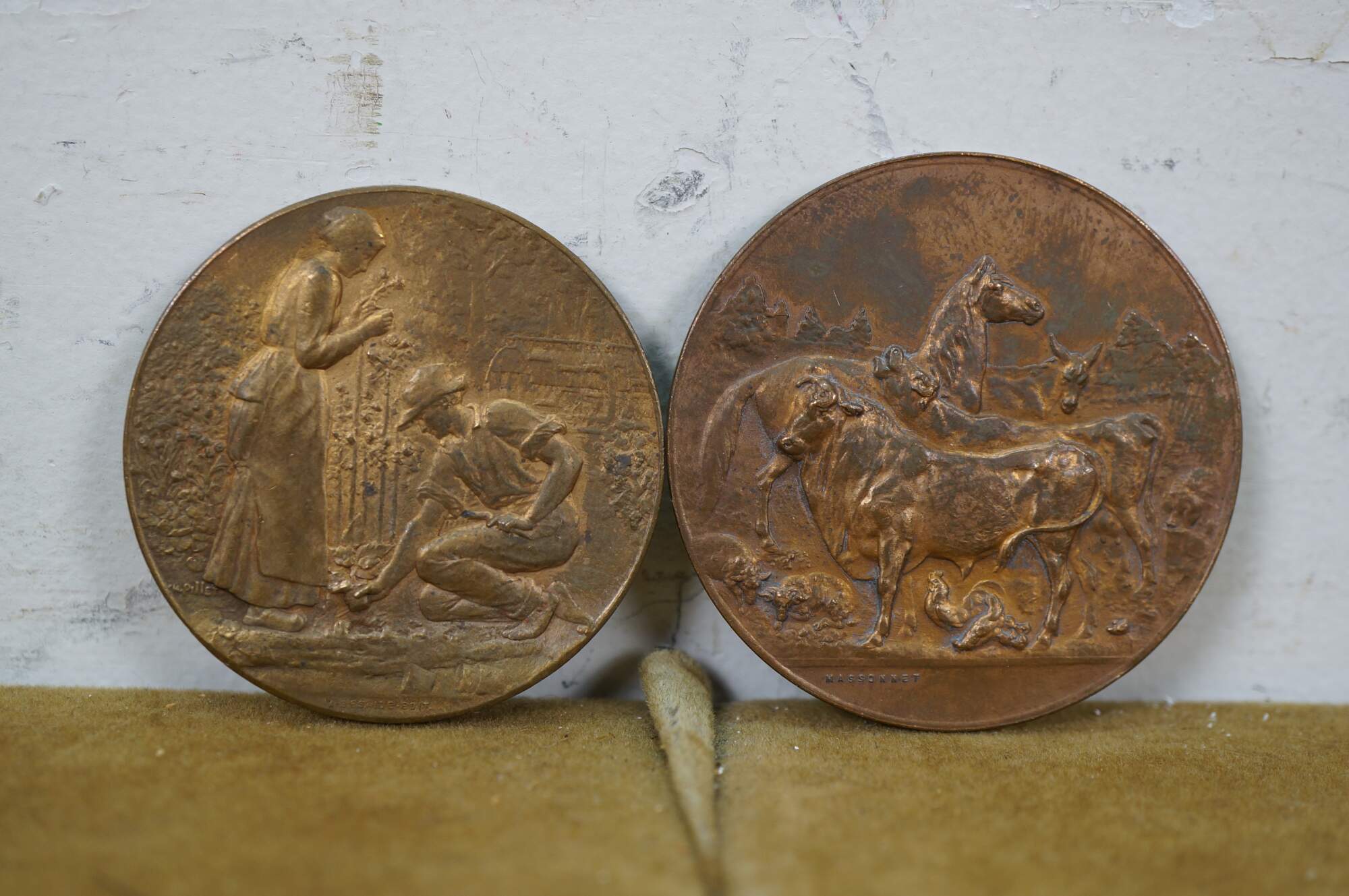 Lot of 12 rare antique employee recognition / appreciation bronze medals / medallions / plaques / coins. Designs include: Two from Casa Pratt, Brasil for "Service All Year Round" - C. Natale - S. Paulo. Three with seated neoclassical woman holding out a laurel wreath over the motto "Av Merite" (Of Merit) - one with blank spaces for engraving on reverse; two marked "Presented by NCR Co to," and one including the name Thos. C. Portmouth - Massonnet, Edit. Man and woman in a garden - black spaces for engraving on reverse - A. Desaide, Edit. Horses, cattle, sheep and chickens - marked "Presented by National Cash Registers Co to" - Massonnet. Standing neoclassical woman next to tree and lyre - blank spaces on reverse - A. Desaide, Edit - A. Massoulle. Standing neoclassical woman with hammer and child - blank spaces on reverse - Massonnet, Edit. Farmer with watering can - blank space on reverse. Greco-Roman soldier with the word "Patria" - marked "Presented by NCR Co to" over a blank space on reverse. Landscape surrounded by the words "Plant in Masses - Avoid Straight Lines - Open Spaces" - blank space on reverse.