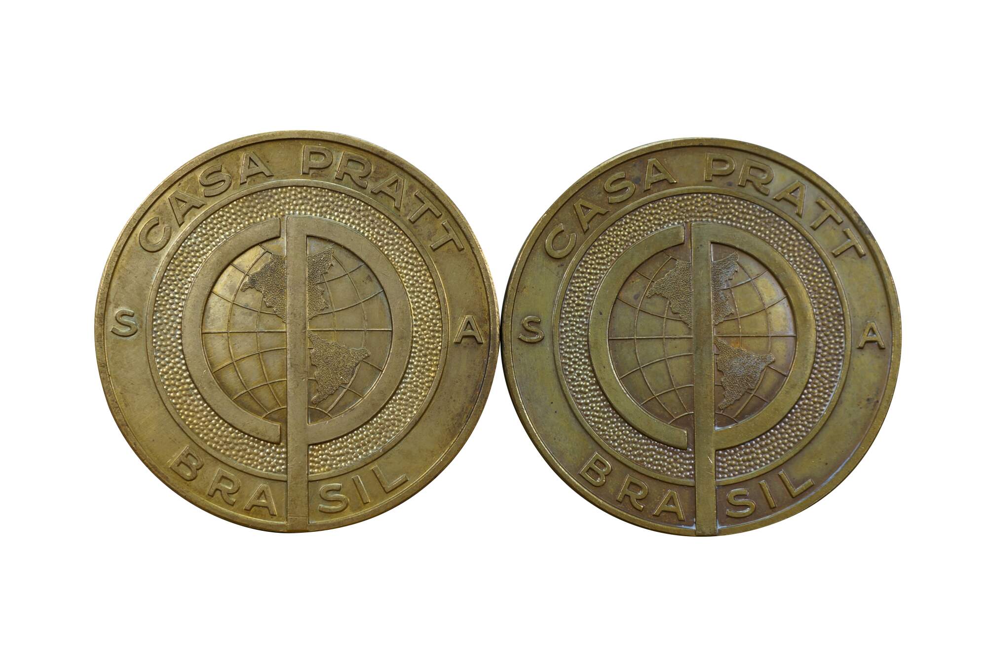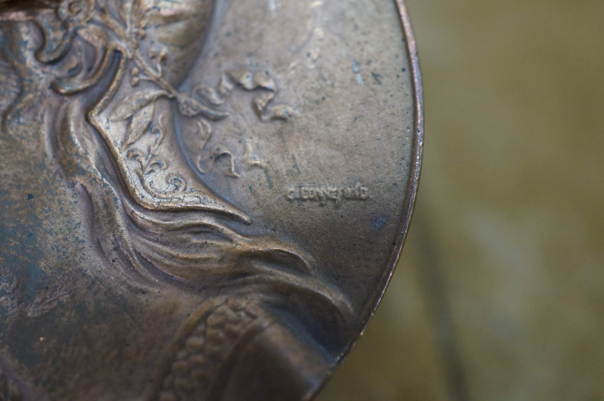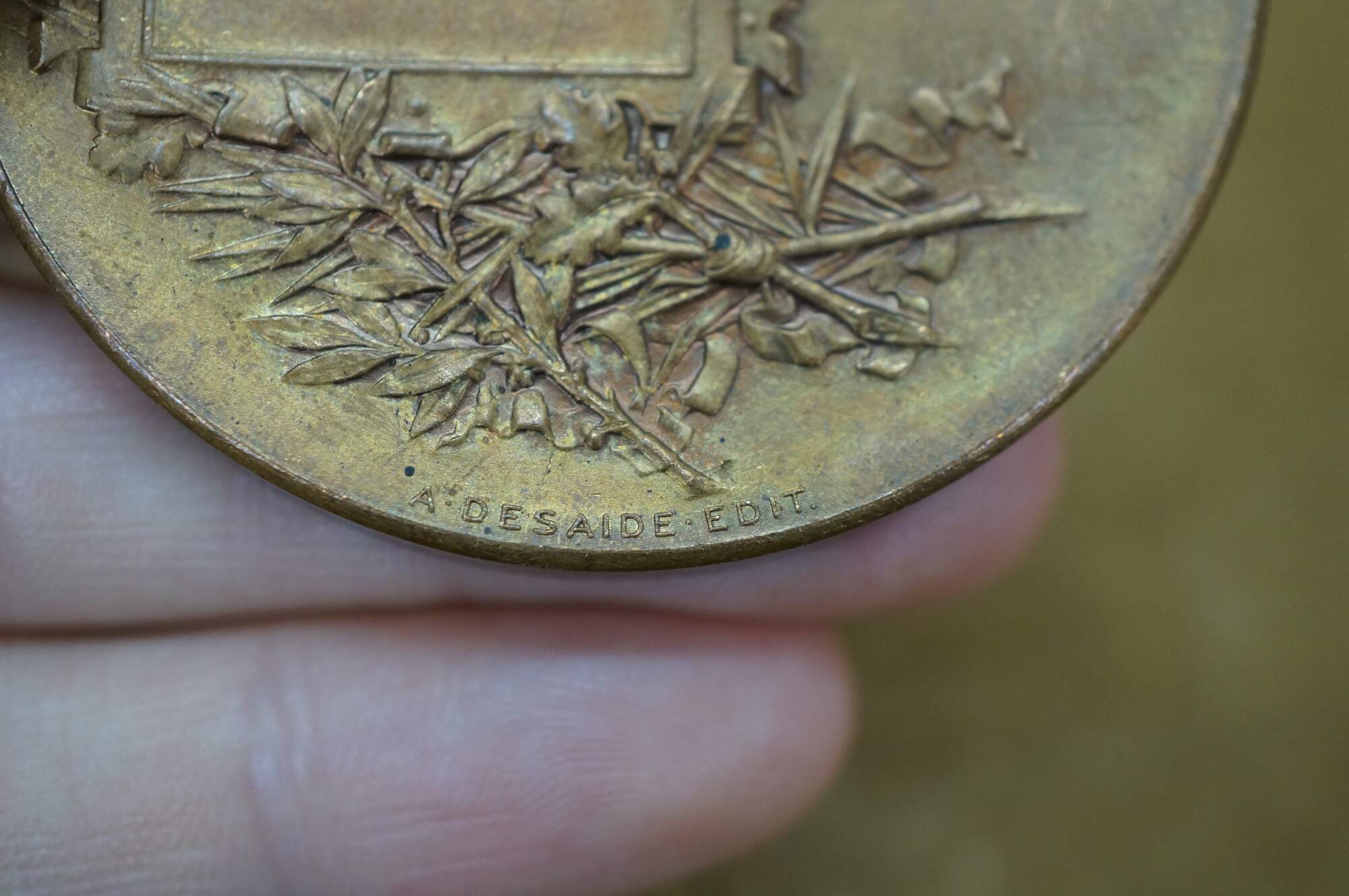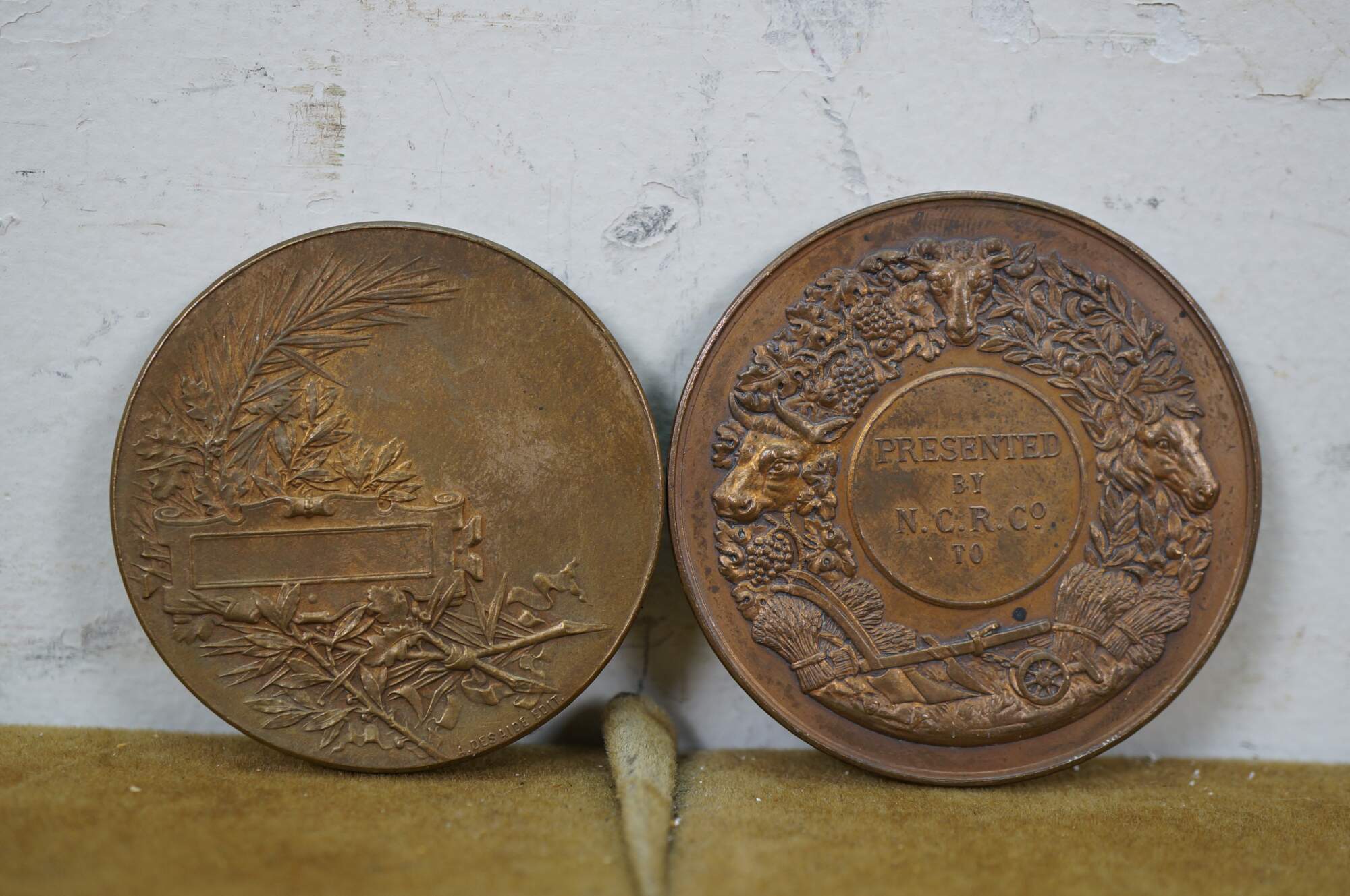 Lot of 12 rare antique employee recognition / appreciation bronze medals / medallions / plaques / coins. Designs include: Two from Casa Pratt, Brasil for "Service All Year Round" - C. Natale - S. Paulo. Three with seated neoclassical woman holding out a laurel wreath over the motto "Av Merite" (Of Merit) - one with blank spaces for engraving on reverse; two marked "Presented by NCR Co to," and one including the name Thos. C. Portmouth - Massonnet, Edit. Man and woman in a garden - black spaces for engraving on reverse - A. Desaide, Edit. Horses, cattle, sheep and chickens - marked "Presented by National Cash Registers Co to" - Massonnet. Standing neoclassical woman next to tree and lyre - blank spaces on reverse - A. Desaide, Edit - A. Massoulle. Standing neoclassical woman with hammer and child - blank spaces on reverse - Massonnet, Edit. Farmer with watering can - blank space on reverse. Greco-Roman soldier with the word "Patria" - marked "Presented by NCR Co to" over a blank space on reverse. Landscape surrounded by the words "Plant in Masses - Avoid Straight Lines - Open Spaces" - blank space on reverse.
