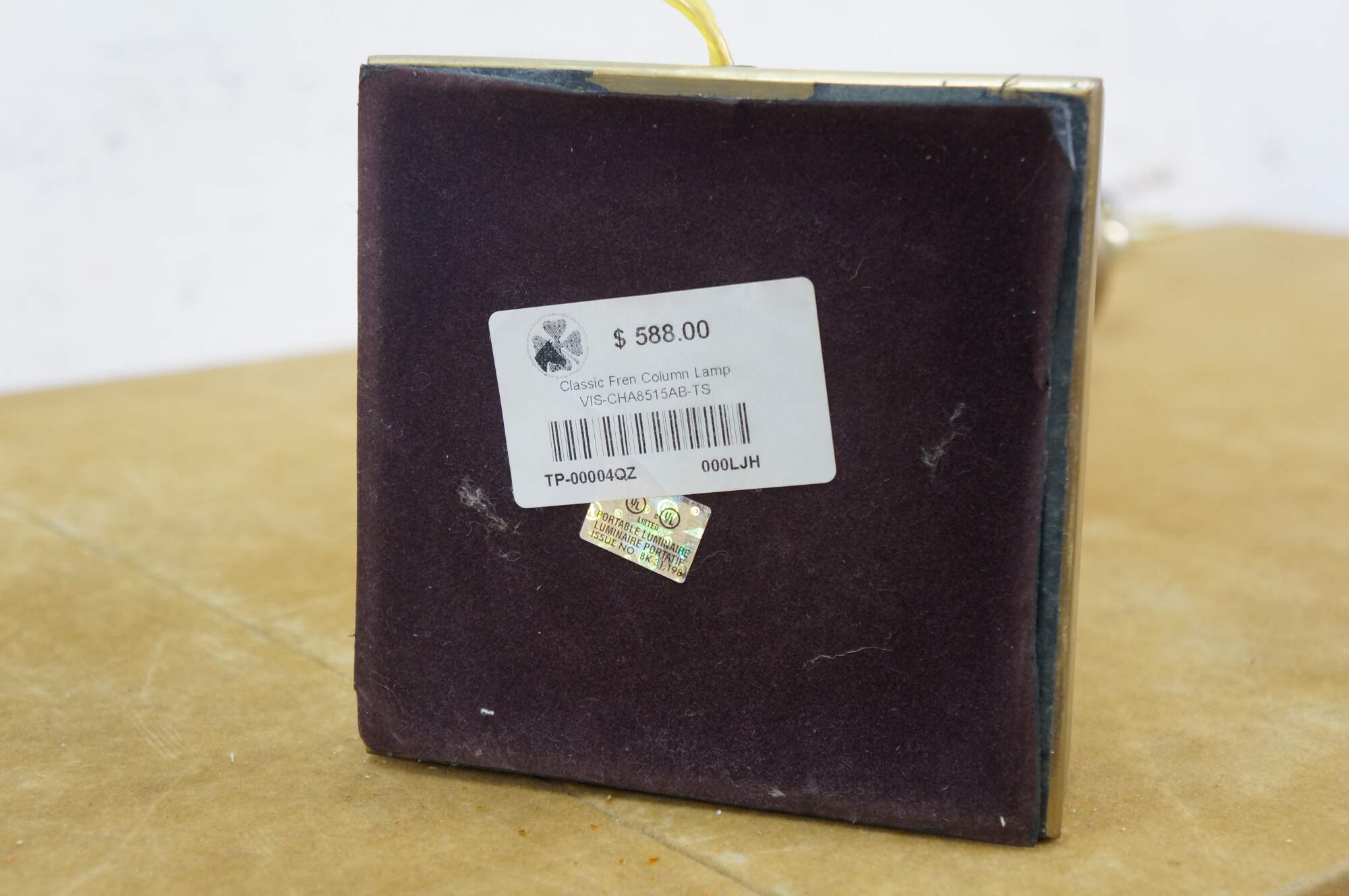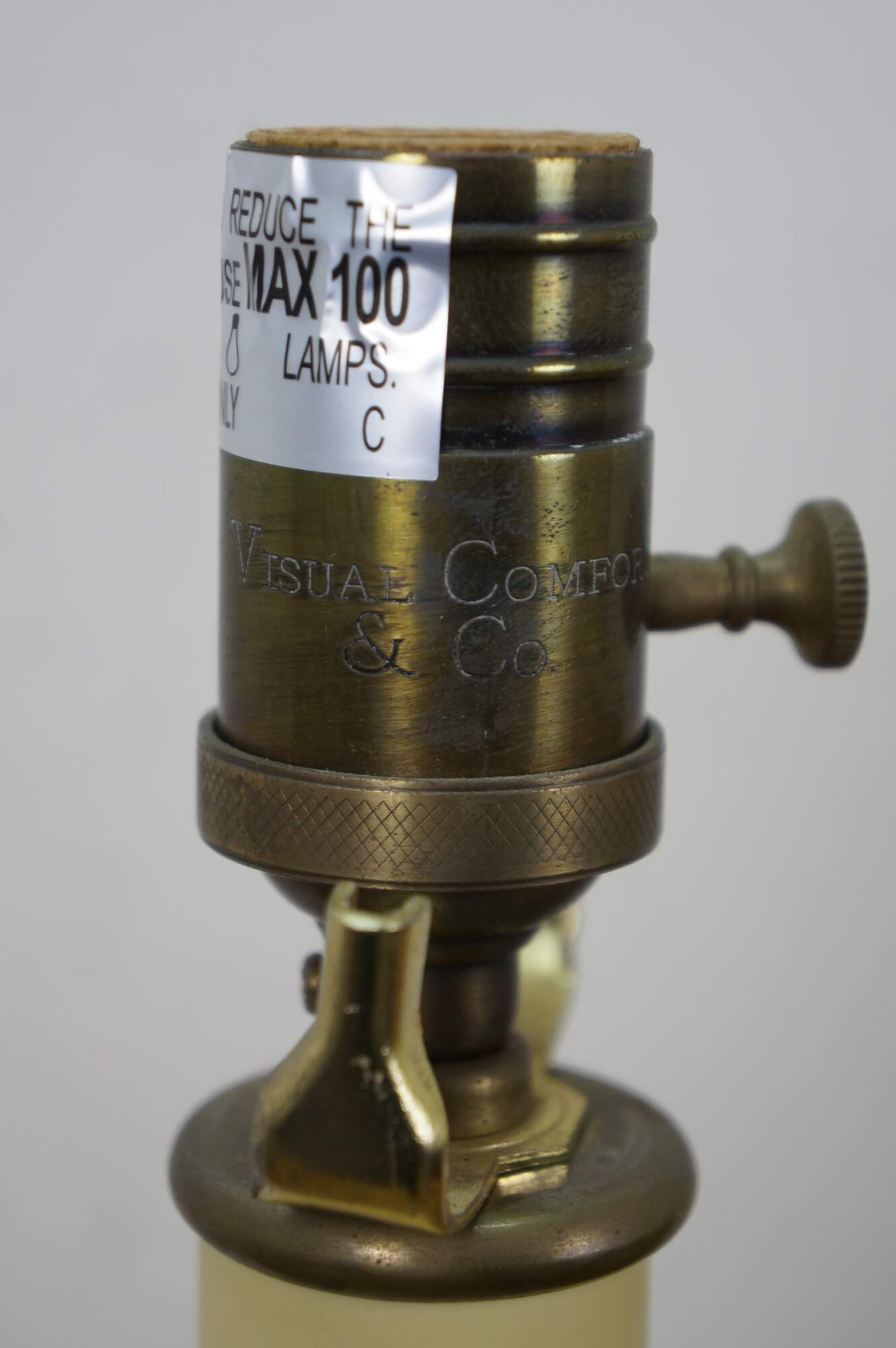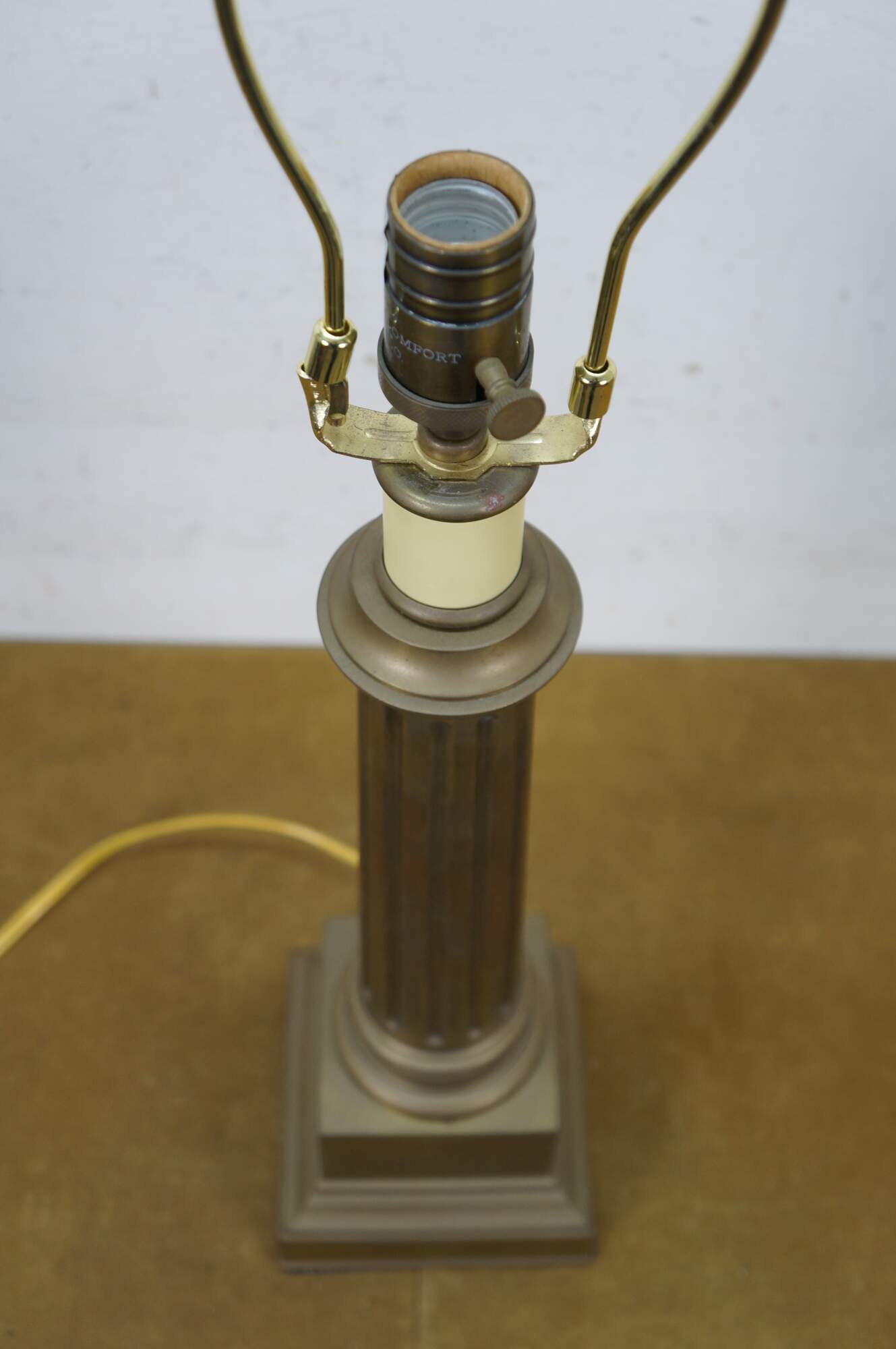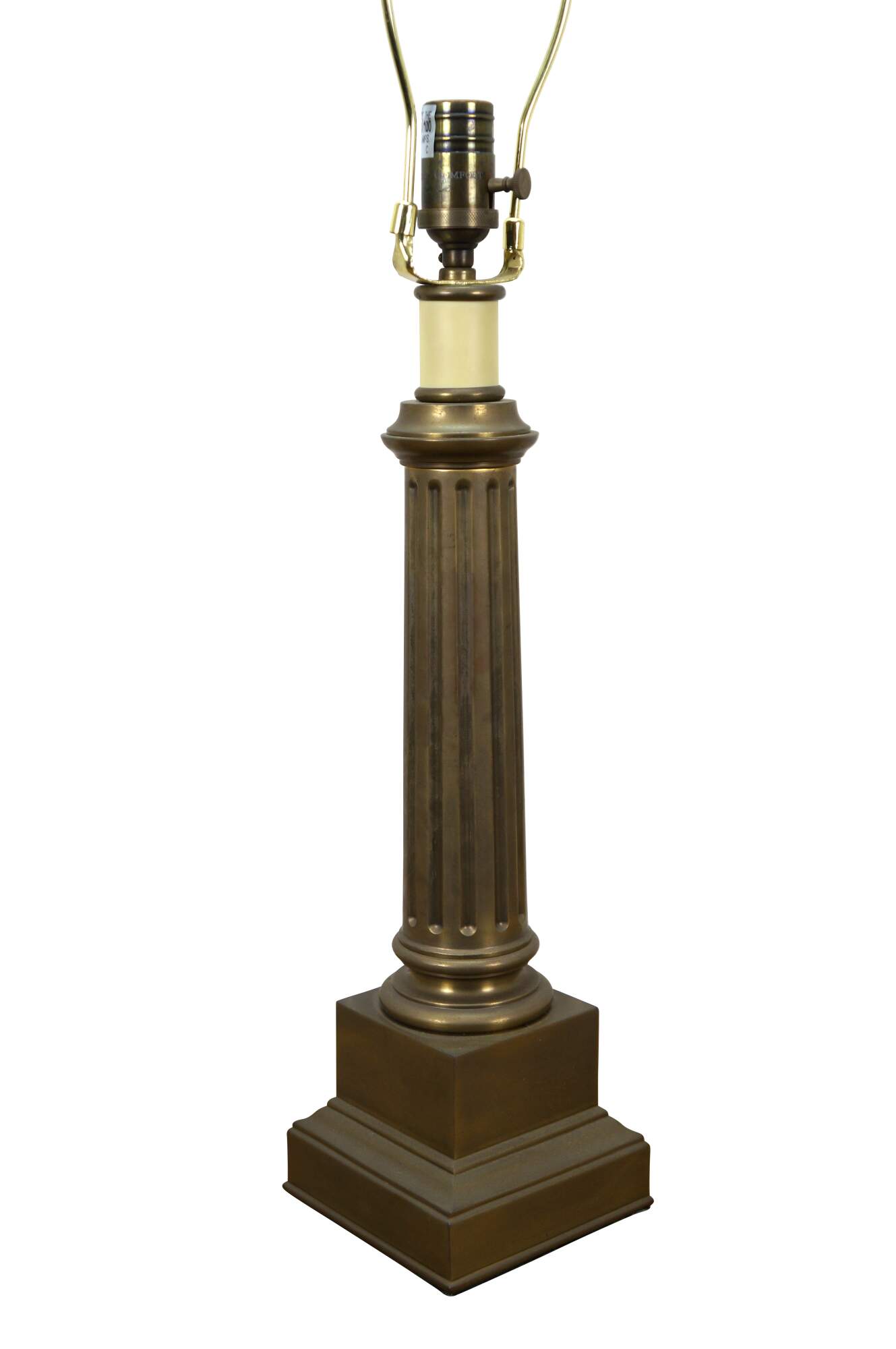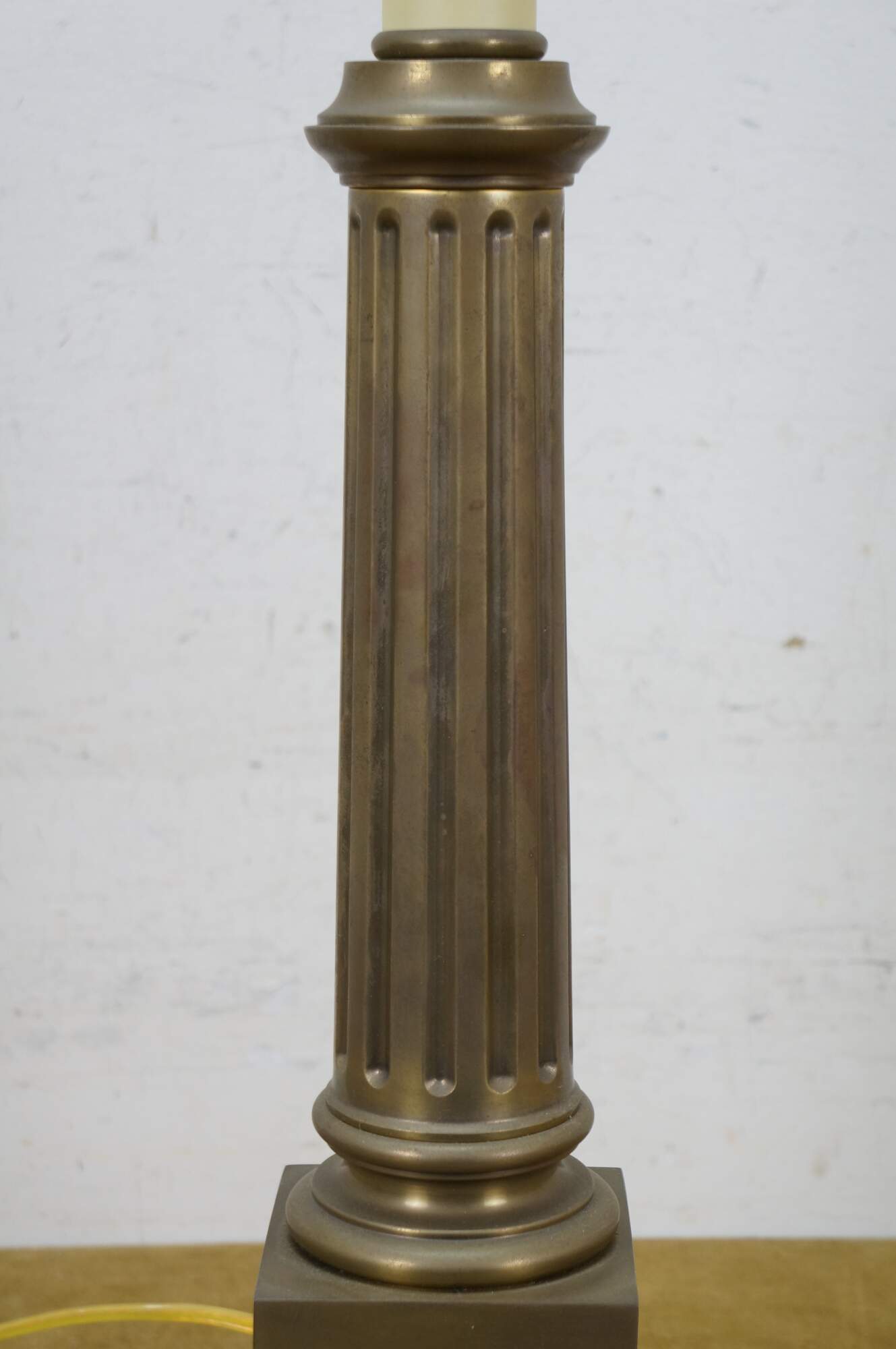 Late 20th century heavy brass table lamp by Visual Comfort & Company in the shape of a neoclassical column / pillar on a square plinth. Includes harp and brass finial.
