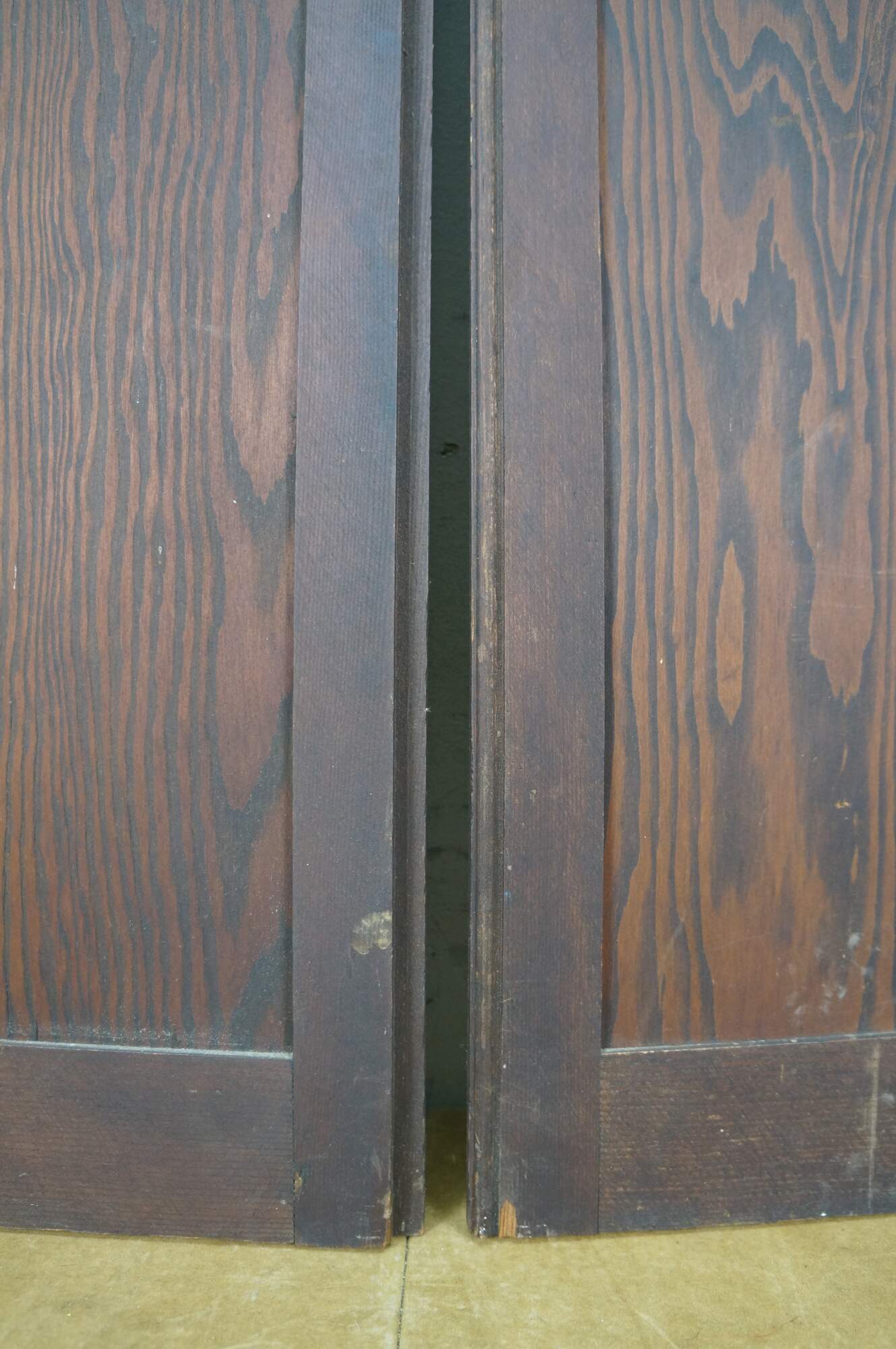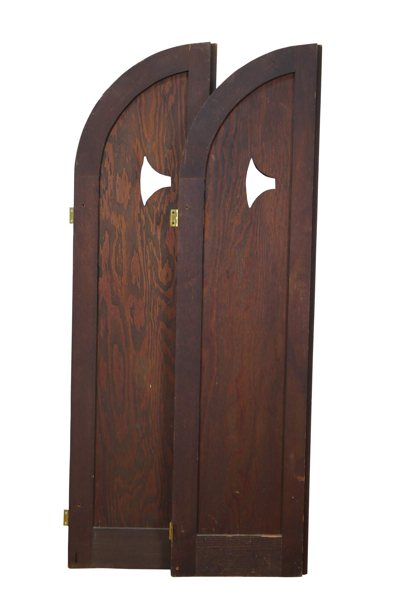 Two matching pairs of vintage window storm shutters. Made of oak with an arch shaped with axe head shaped cut outs. Contemporary hinges.