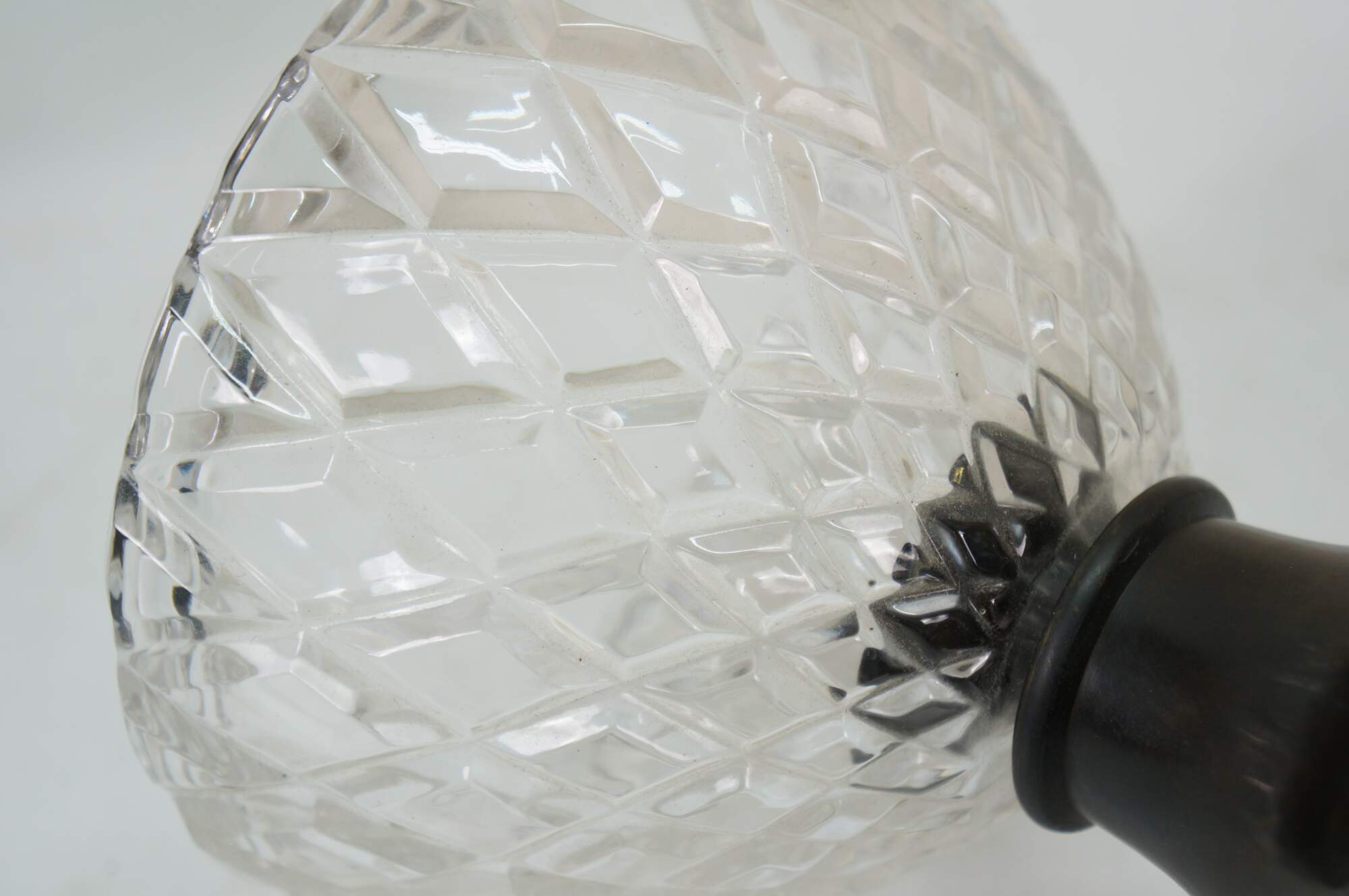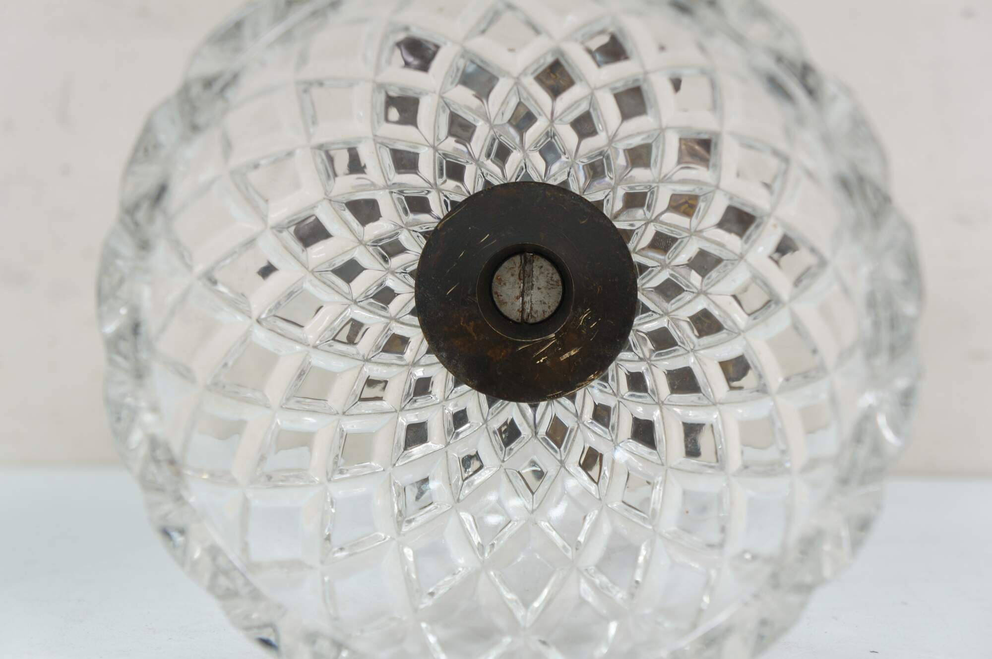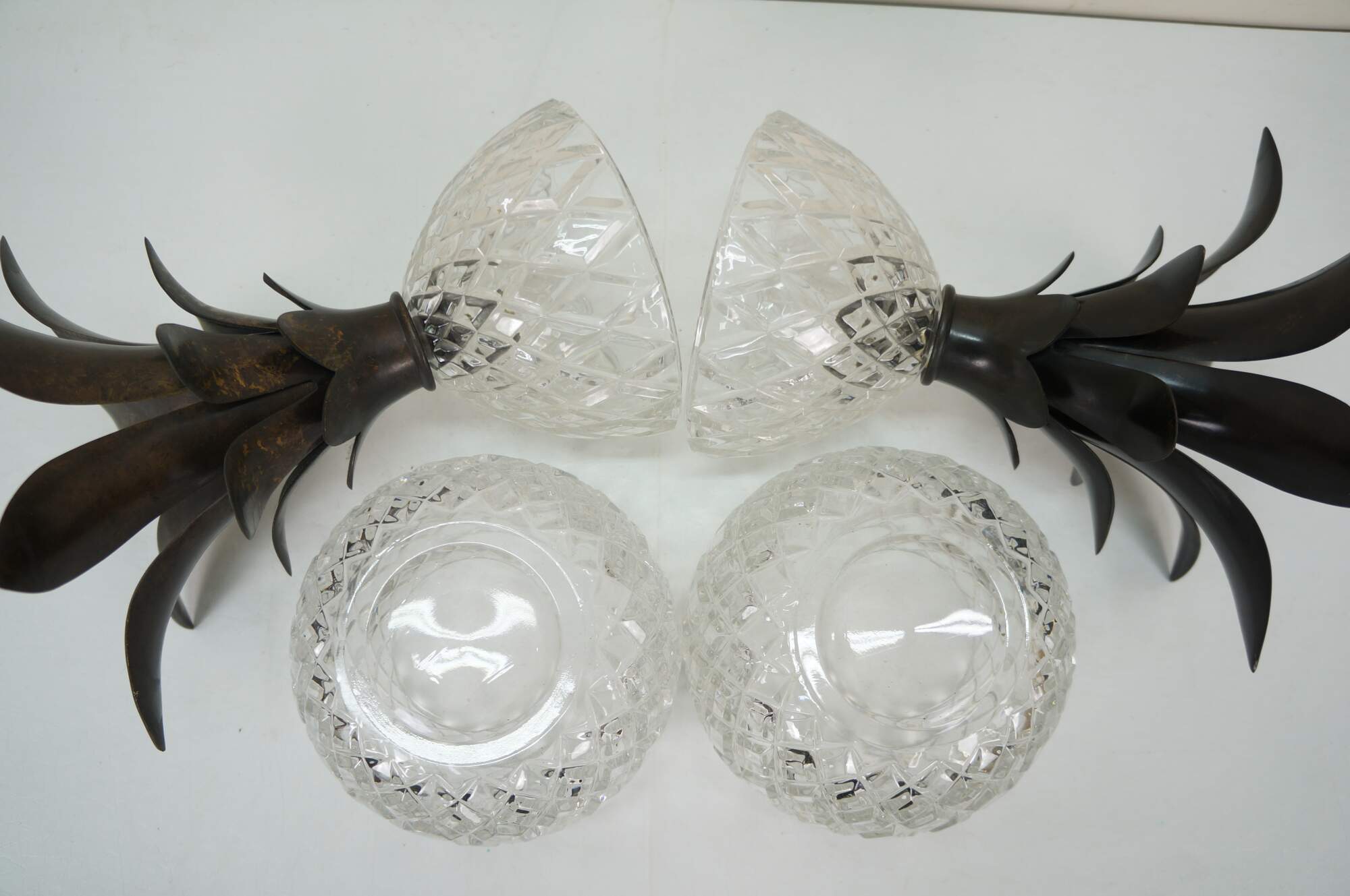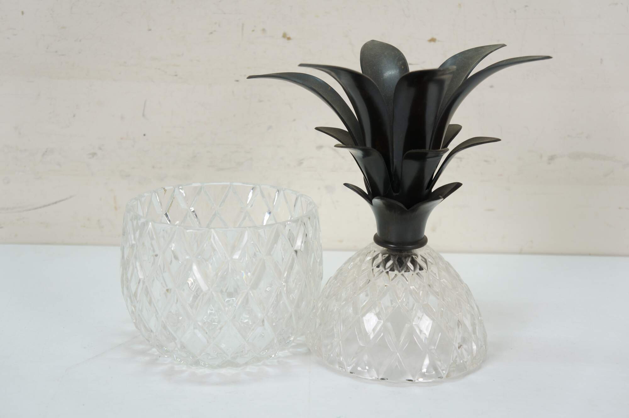 Pair of late 20th century diamond pattern cut crystal lidded jars / containers / mantel urns or compotes in the shape of pineapples with dark bronze leaves. Castilian Imports of Poland.