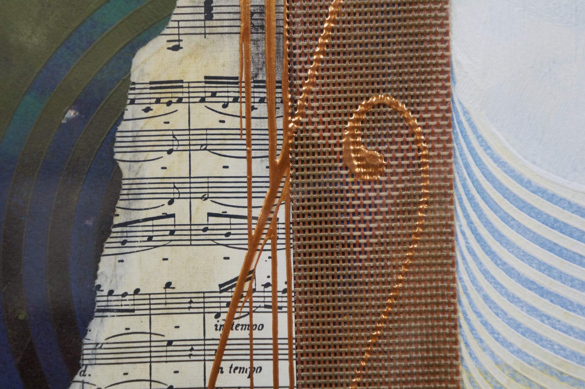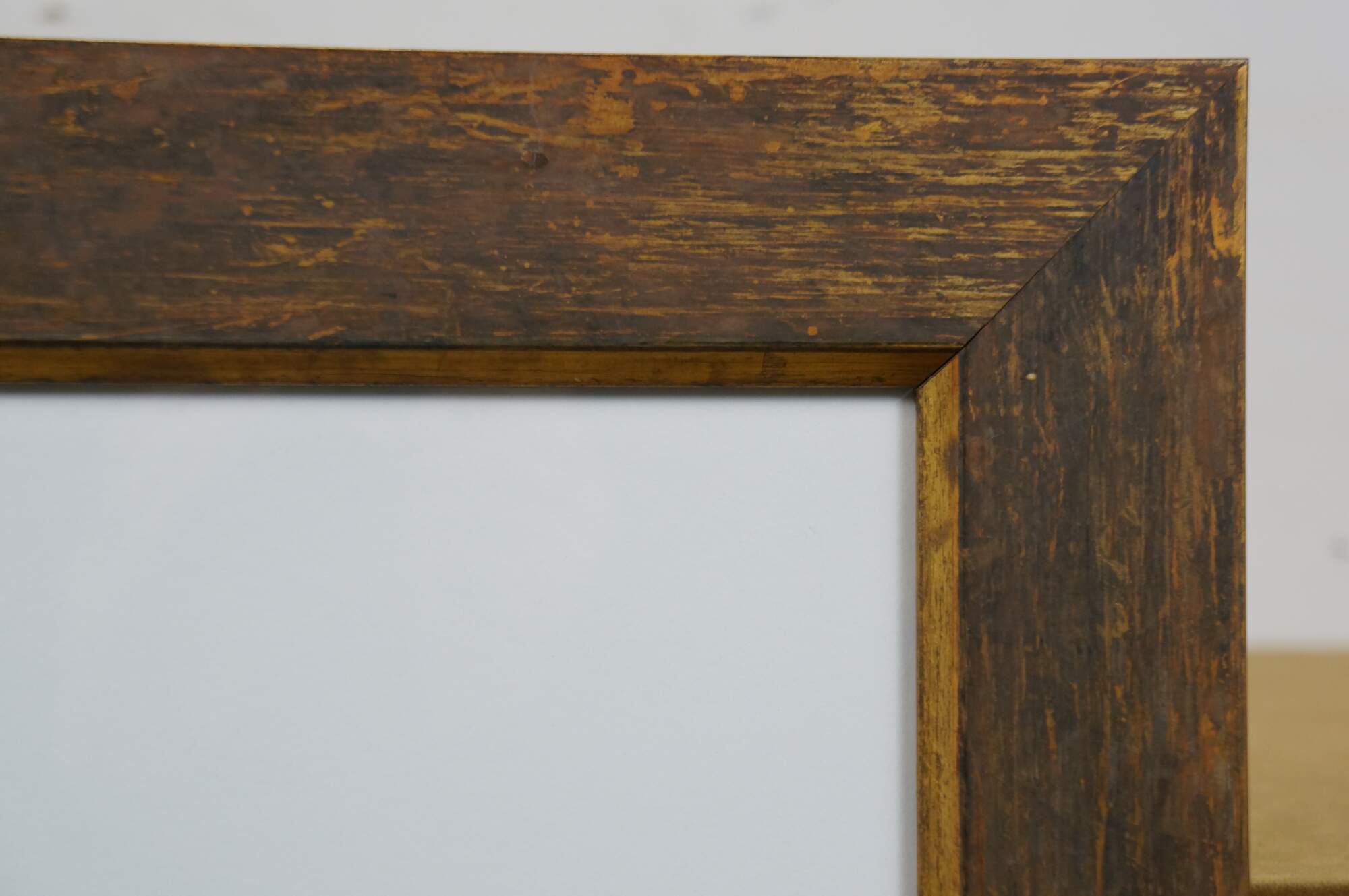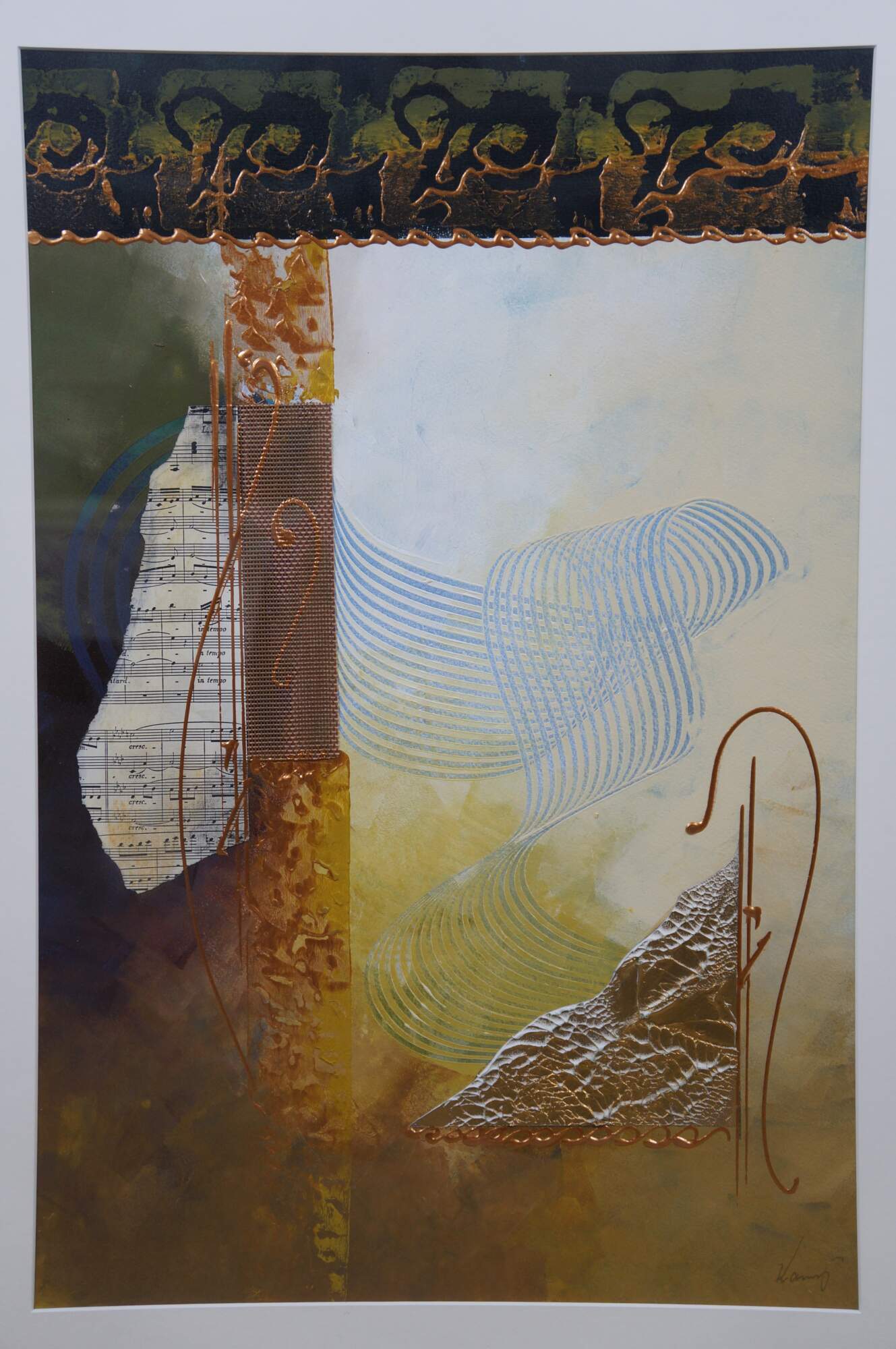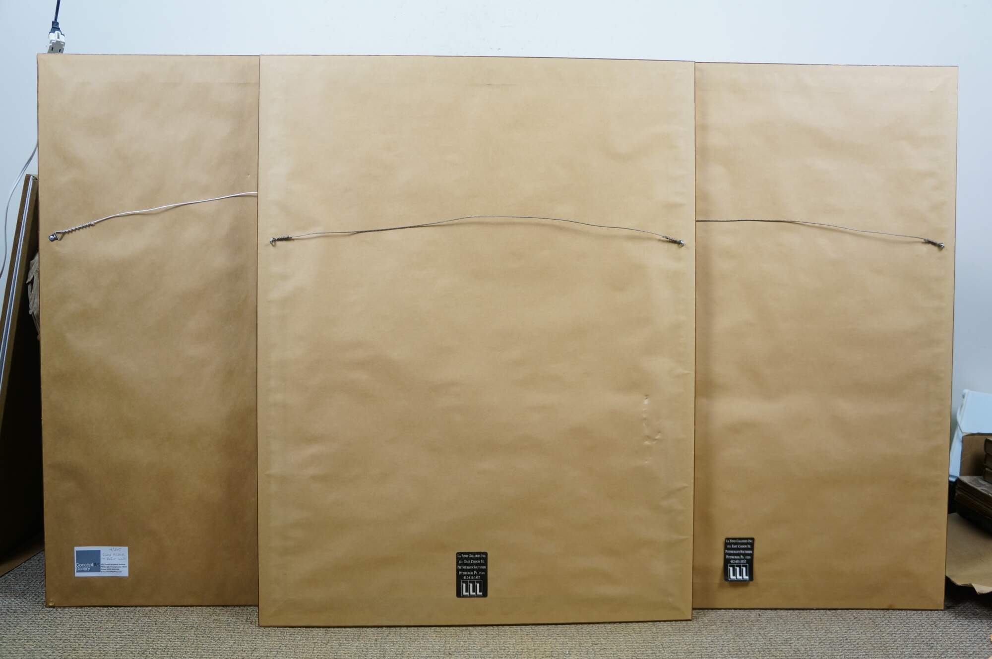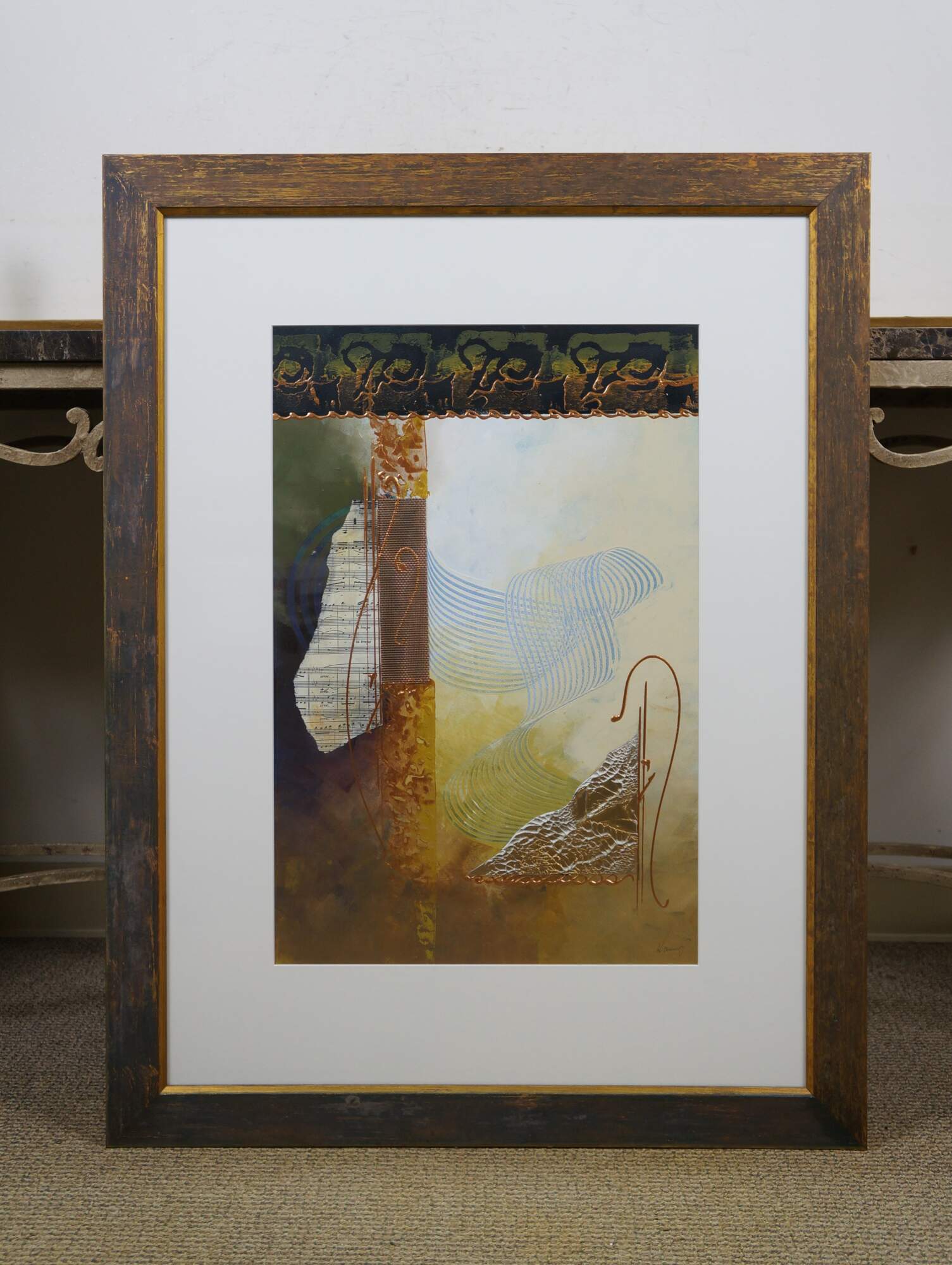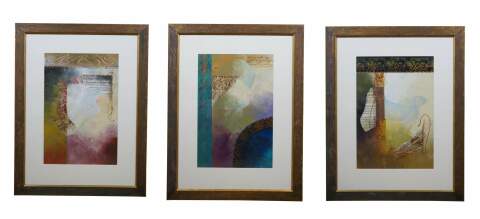 Set of three mixed media abstract triptych artworks by Kamy Deljou. Wood frames with a hint of gilding; white mat.